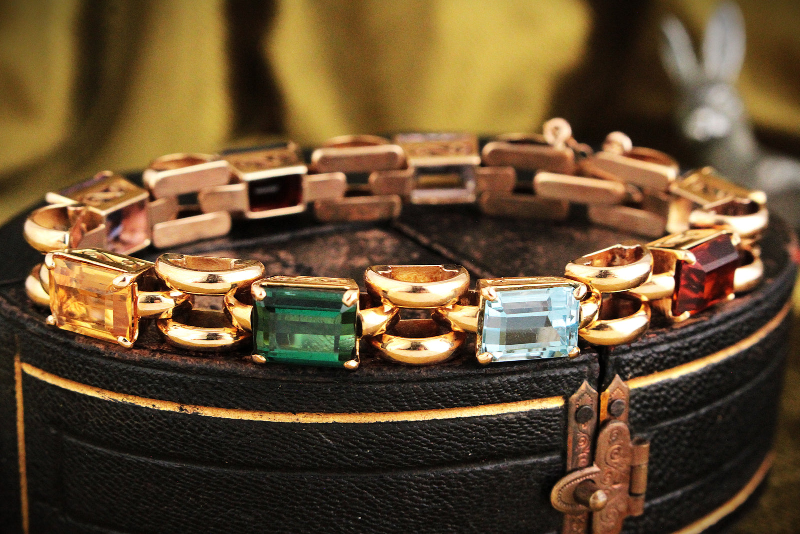 Over flowing with luxurious vintage glamour, this stunning mixed gem bracelet is a bold celebration of form and vibrancy, each stone emerald-cut, four claw set in ornate galleries with the gems totalling 21.76ct. Showcasing a rich palette of natural Aquamarine, Citrine, Amethyst, Tourmaline, Prasiolite & pale pink Amethyst, their crisp facets catching and reflecting light with every movement, and handcrafted in solid 18ct yellow gold.