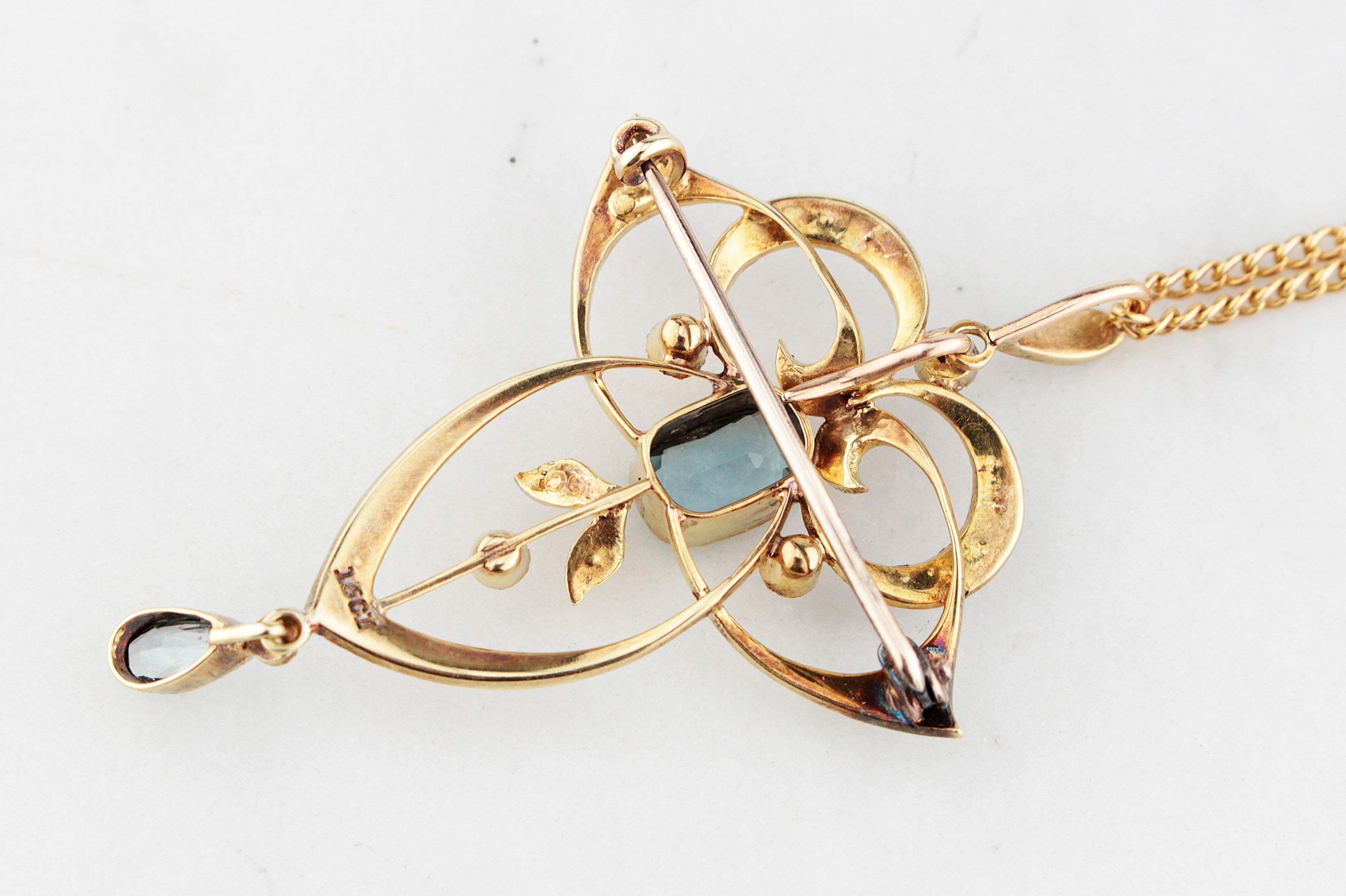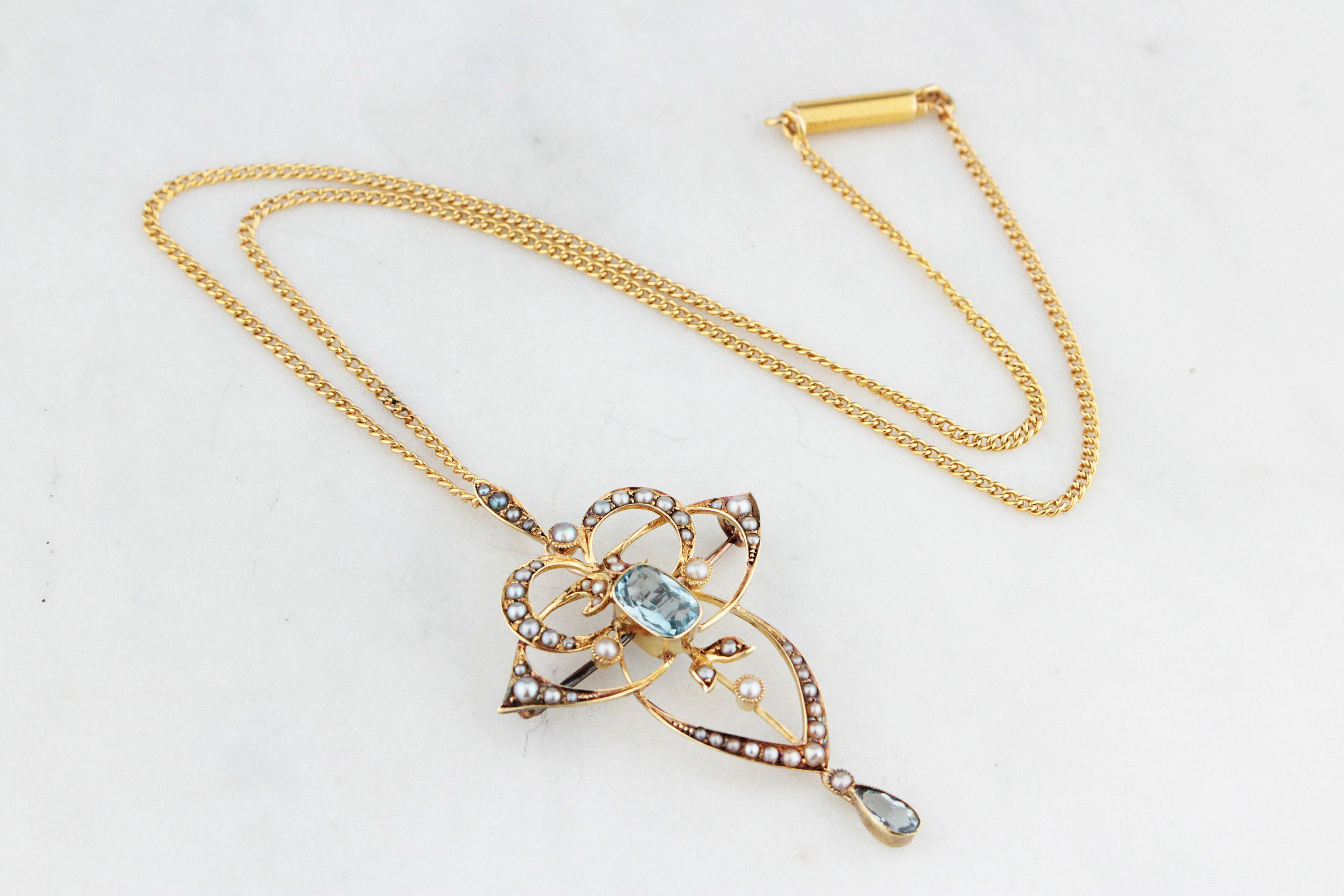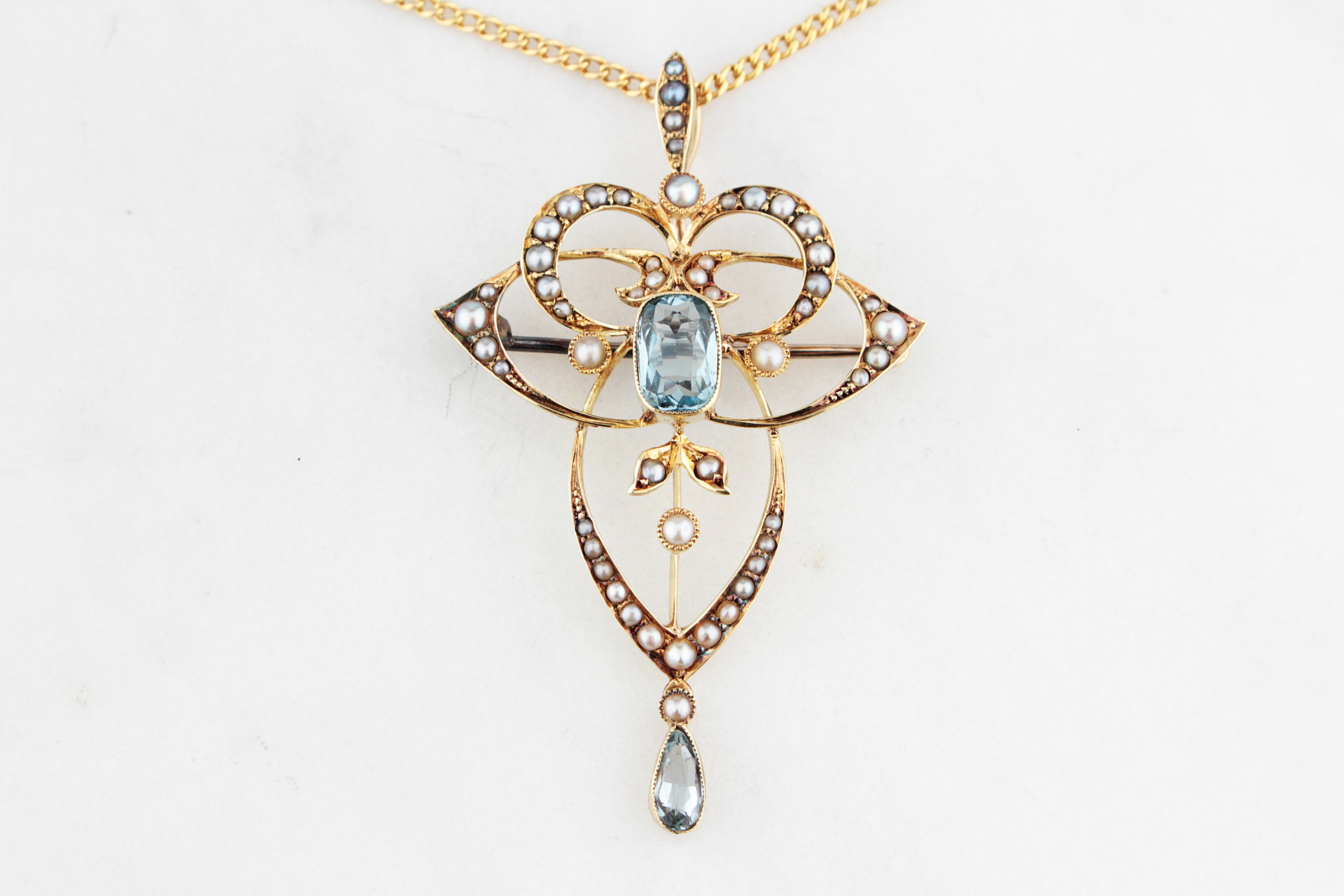 A breathtaking example of Edwardian elegance, this convertible pendant/brooch is handcrafted in rich 15ct yellow gold and adorned with delicate seed Pearls and luminous Aquamarines. The ornate openwork design features graceful scrolls and botanical motifs framing a soft blue oval-cut Aquamarine at its centre and a teardrop Aquamarine drop below. The seed Pearls lend a subtle iridescence, enhancing the piece’s romantic charm. Presented on a matching 18ct gold curb-link with a classic barrel clasp with hallmarks for Birmingham, 1912 (worn).