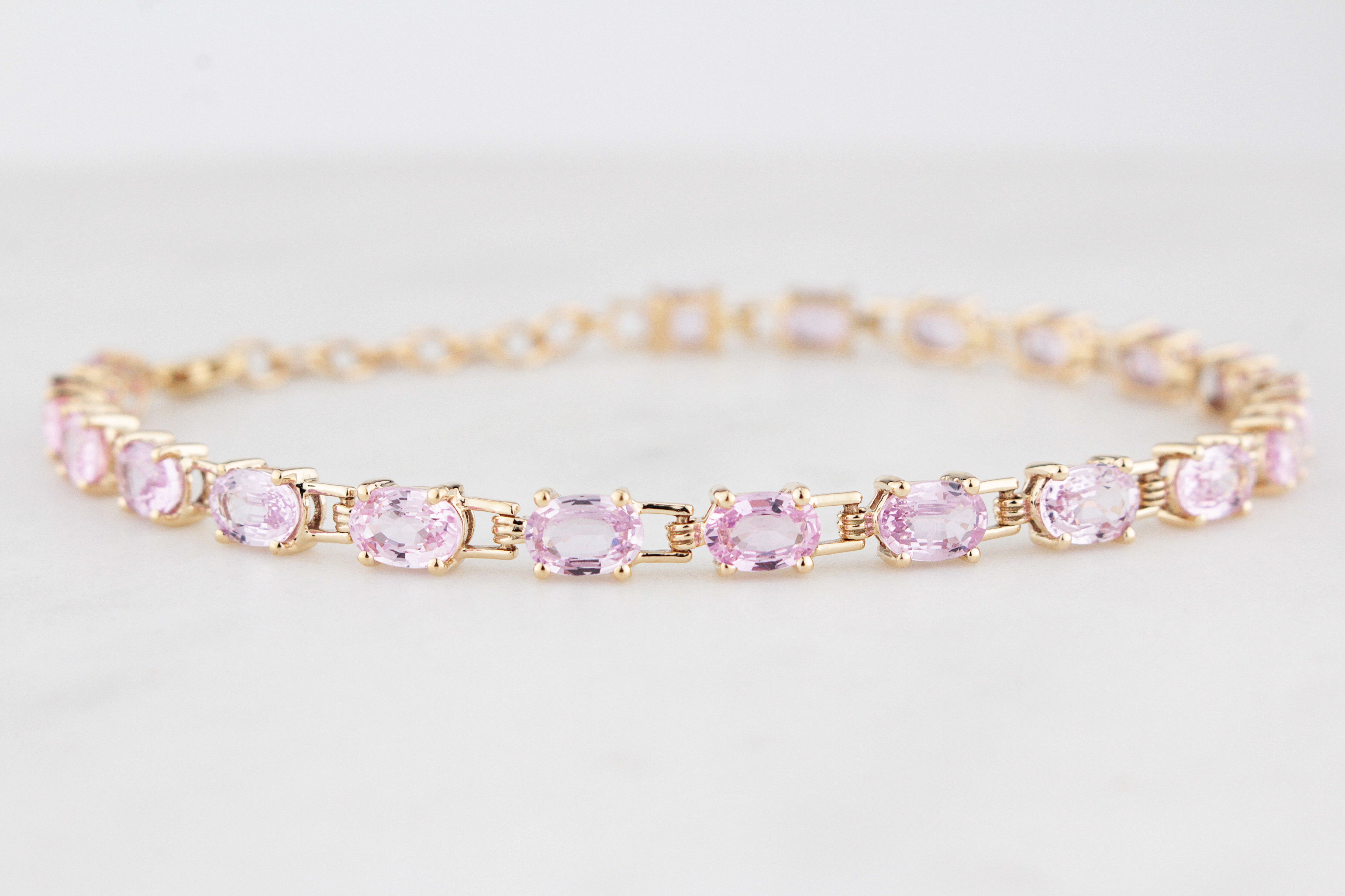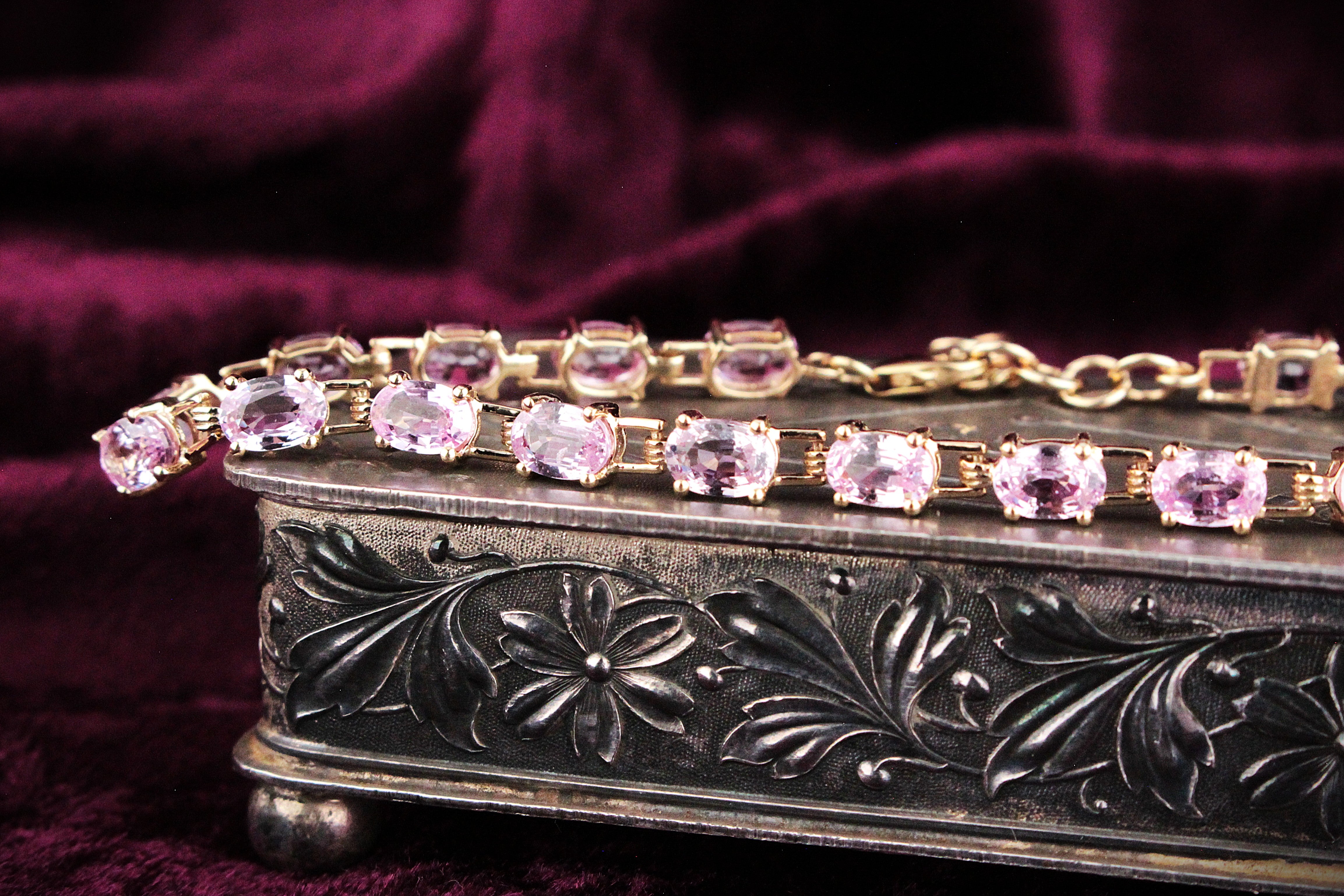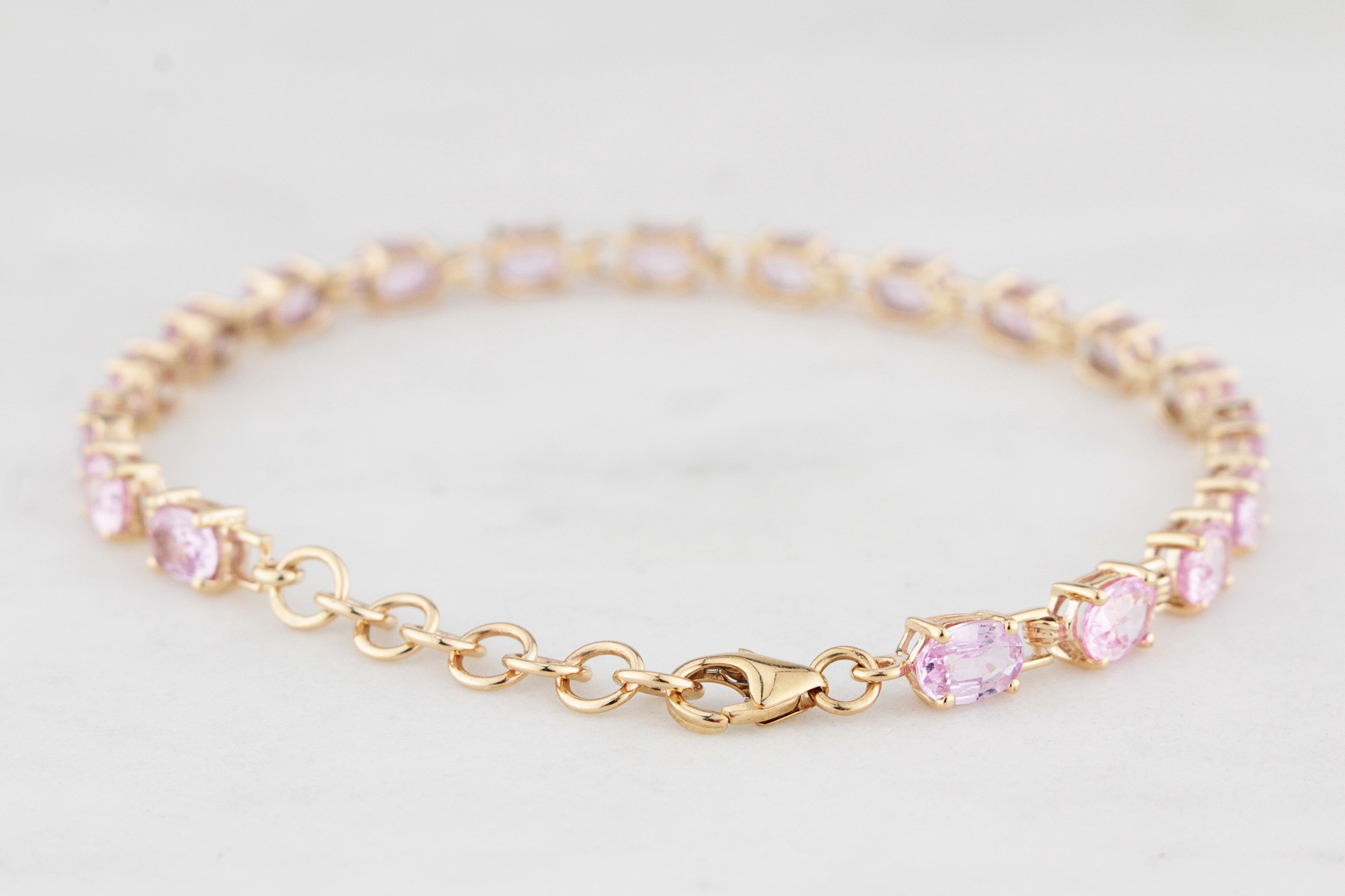 Soft, feminine, and effortlessly elegant — this contemporary pink Sapphire bracelet is a celebration of colour and light. Crafted in 10ct yellow gold, it features a continuous line of oval-cut pink Sapphires, each securely claw-set and connected by ornate gold links that allow the stones to shimmer beautifully with every movement.