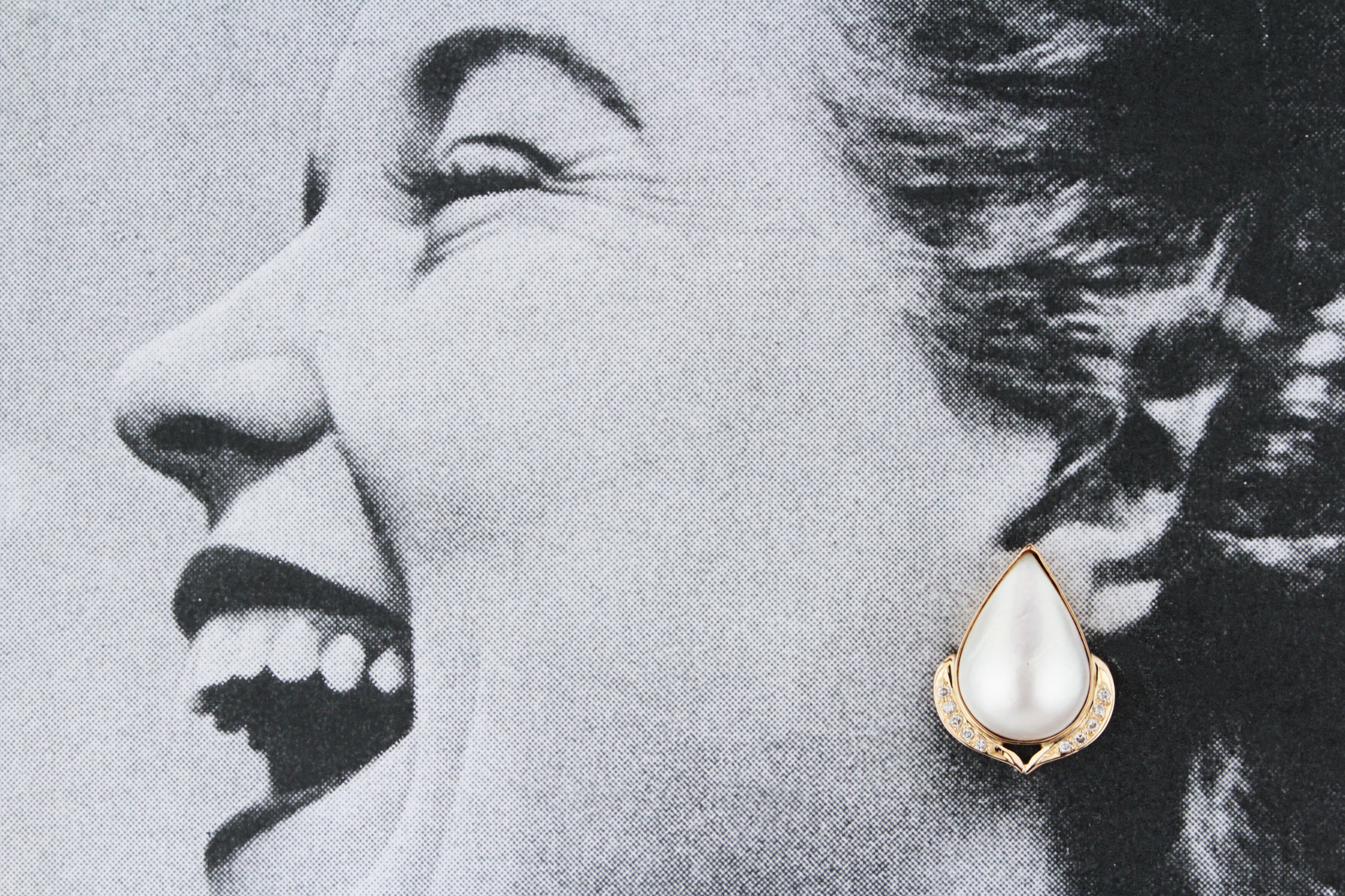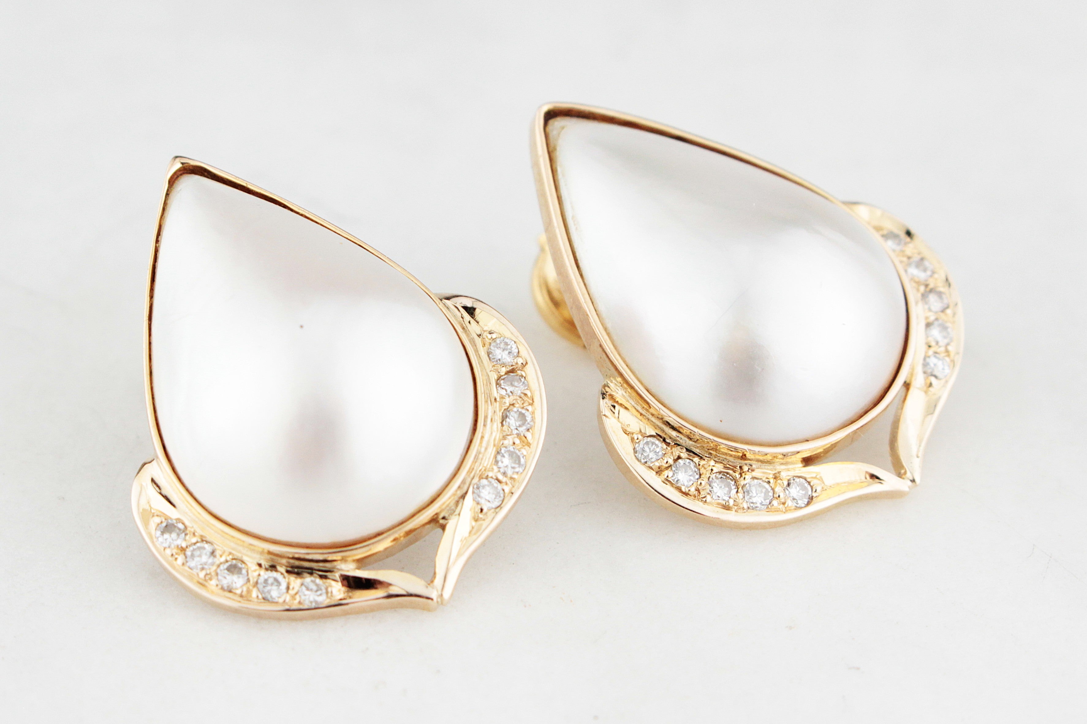 STONES: 2 x cultured freshwater Mabe Pearls, 20 x 14mm, 20 x round brilliant cut Diamonds, TCW = .20ct