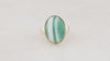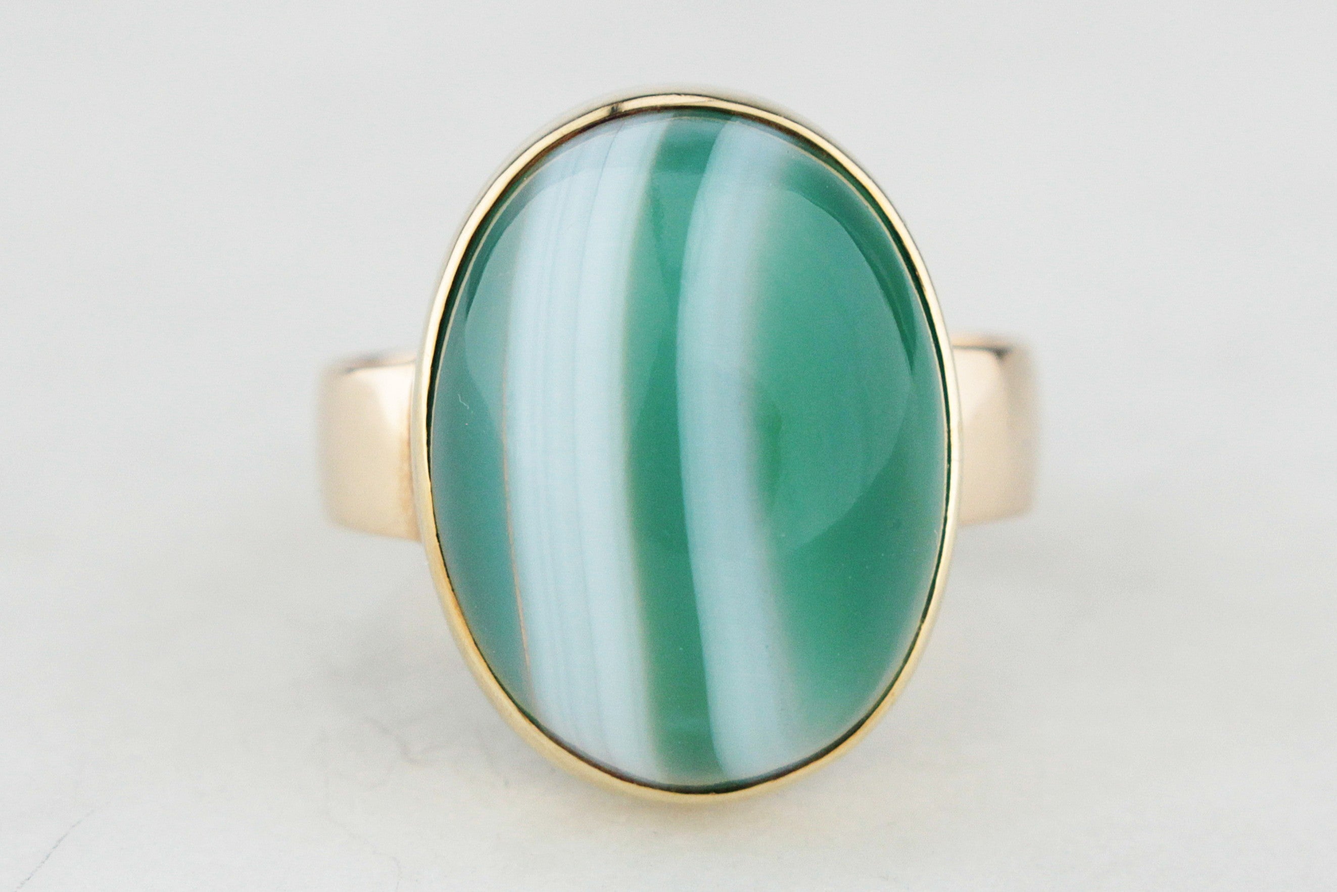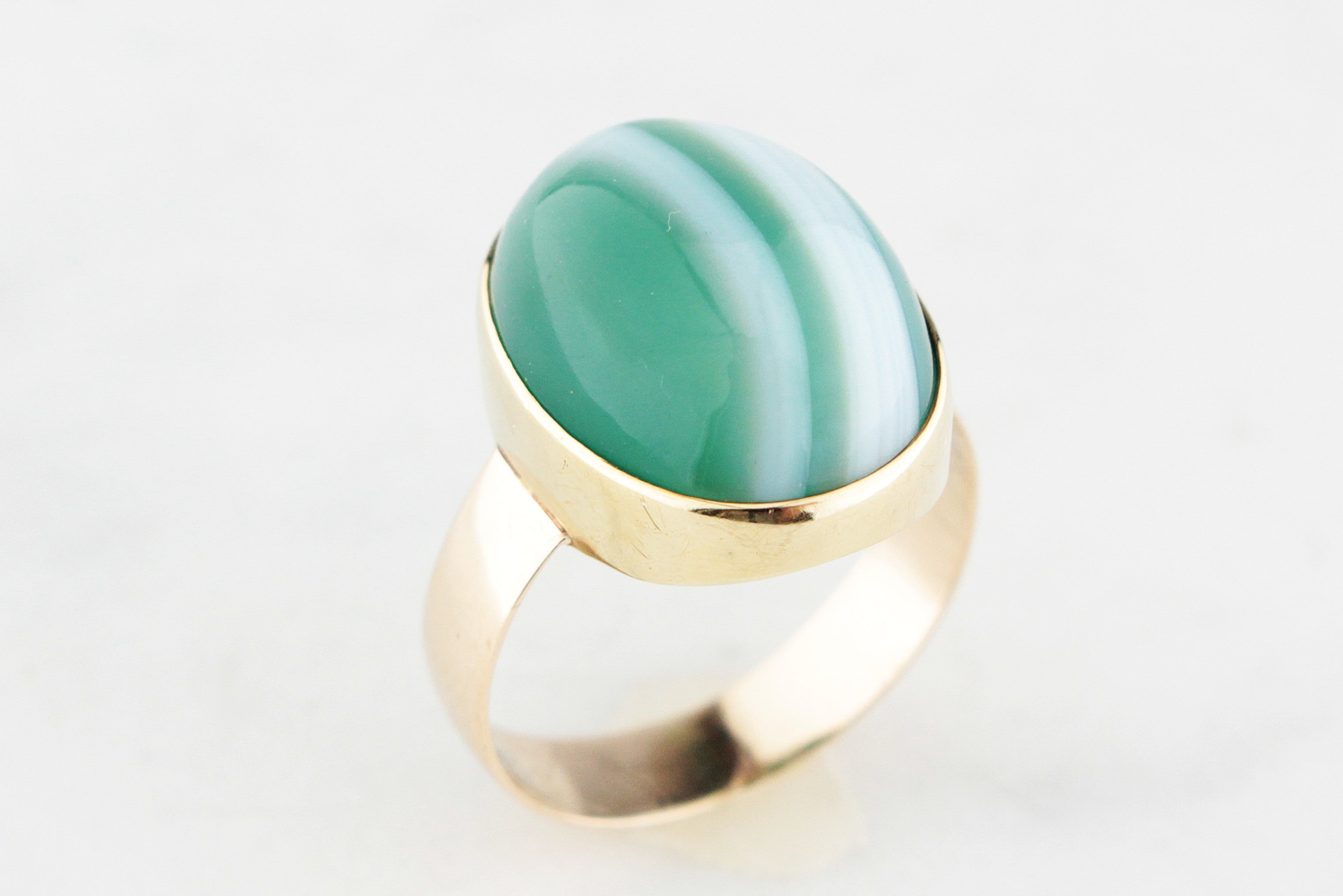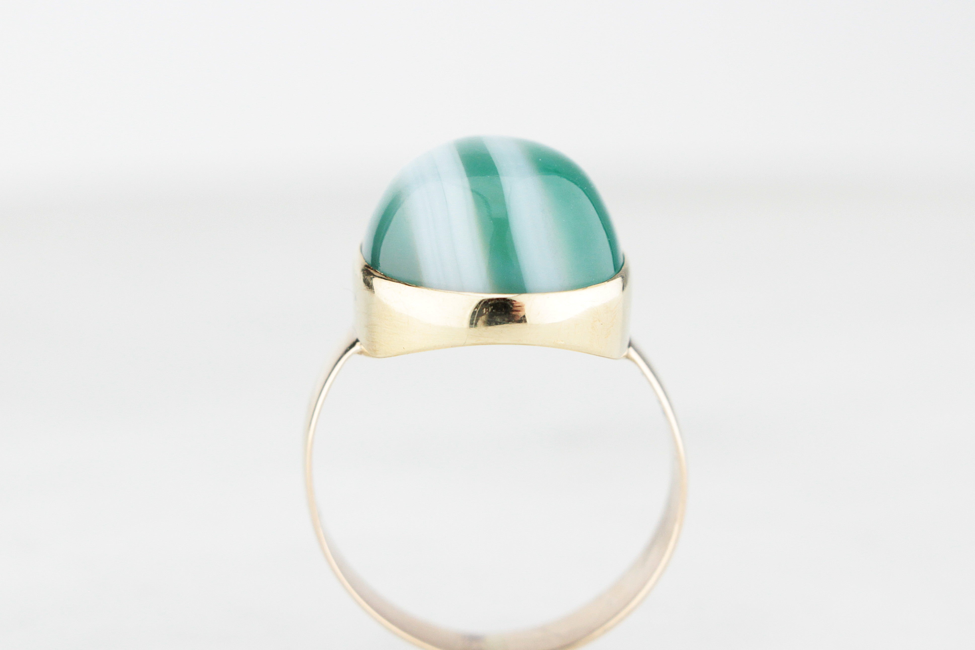 Bold and eye-catching, this 1960’s vintage statement ring celebrates the natural beauty of banded Agate. The large, glossy domed cabochon showcases striking stripes of deep green and soft white, each layer formed over millennia to create a stone that is as unique as its wearer.