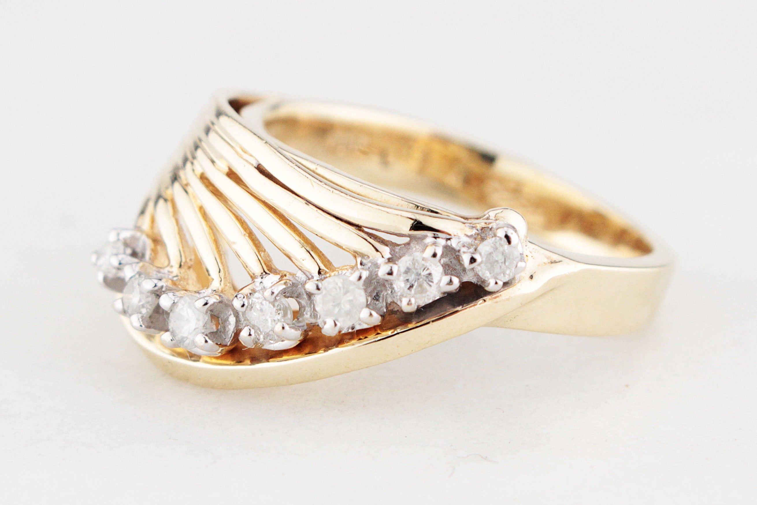 A dazzling glamour piece, this Diamond fan ring is pure retro sophistication. Designed with graceful, sweeping lines that arc upward like a golden fan, set with a sparkling row of seven round brilliant-cut Diamonds that dance across the crest in a cascade of light.
