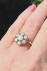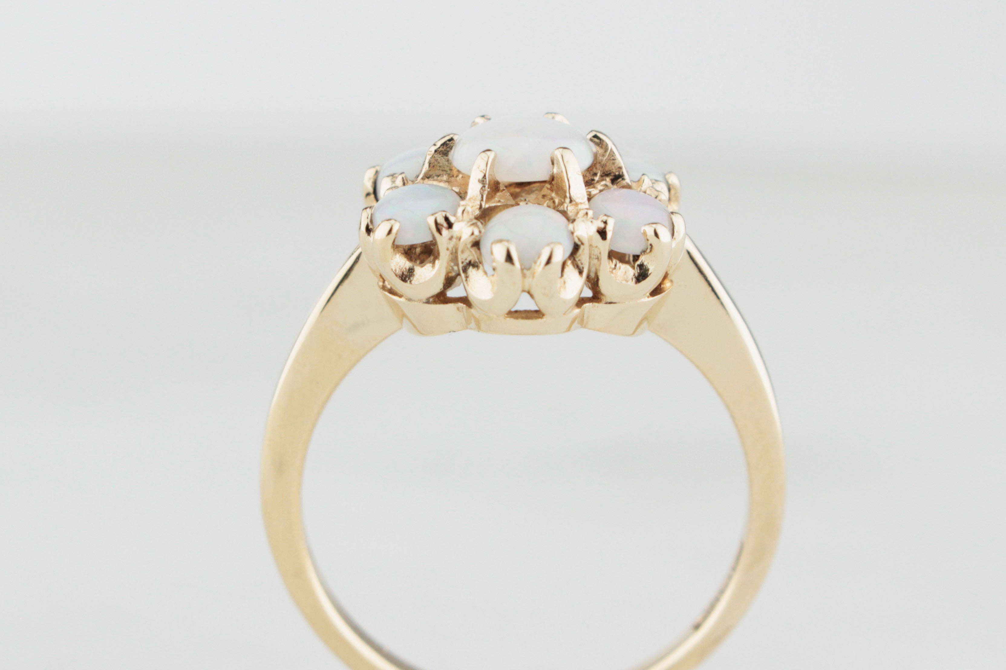 Bursting with vintage charm, this retro cluster ring showcases the timeless beauty of Opal. A central round solid Opal is surrounded by a halo of six smaller Opals held within ornate crown settings, each glowing with playful flashes of colour as they catch the light.