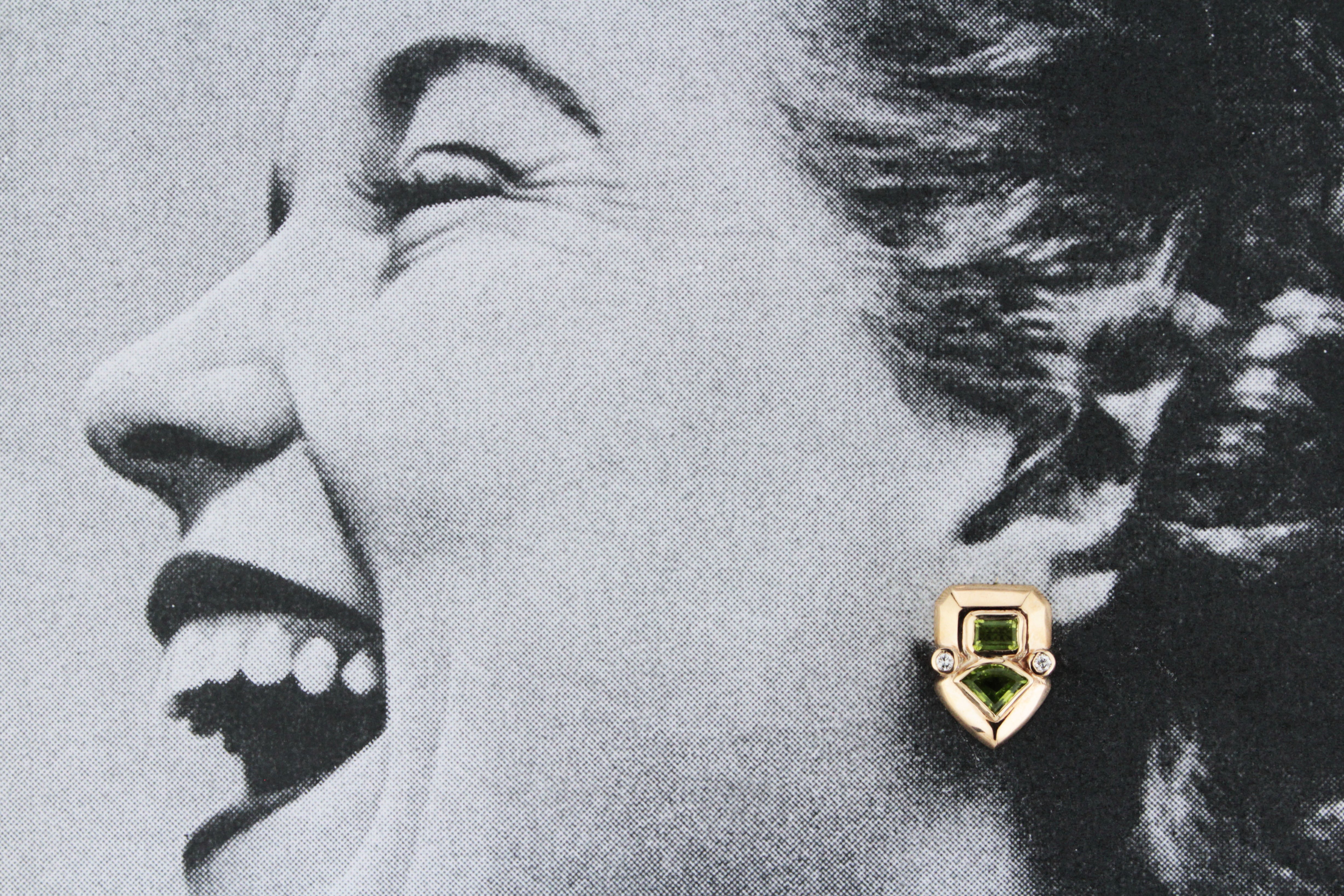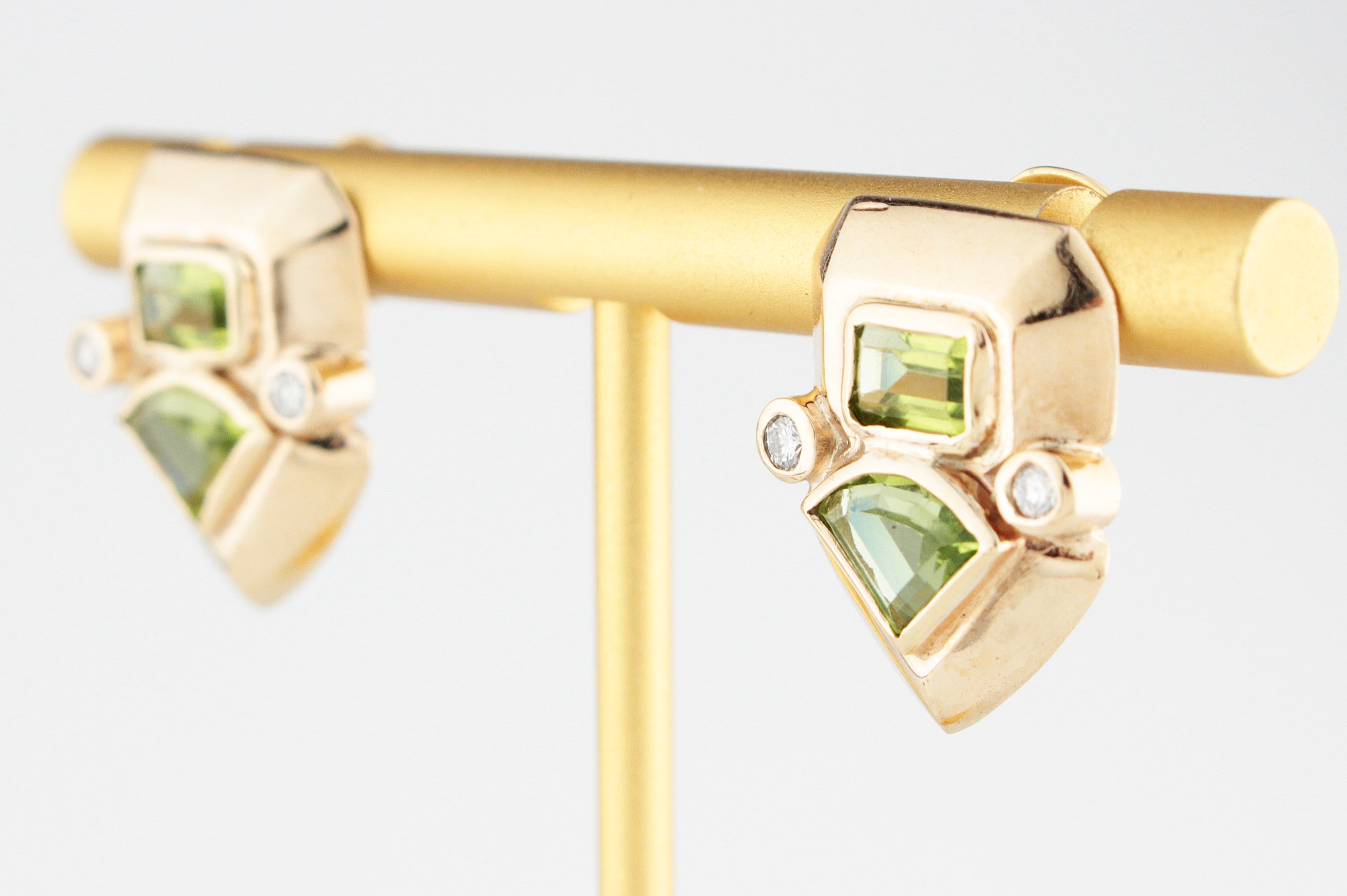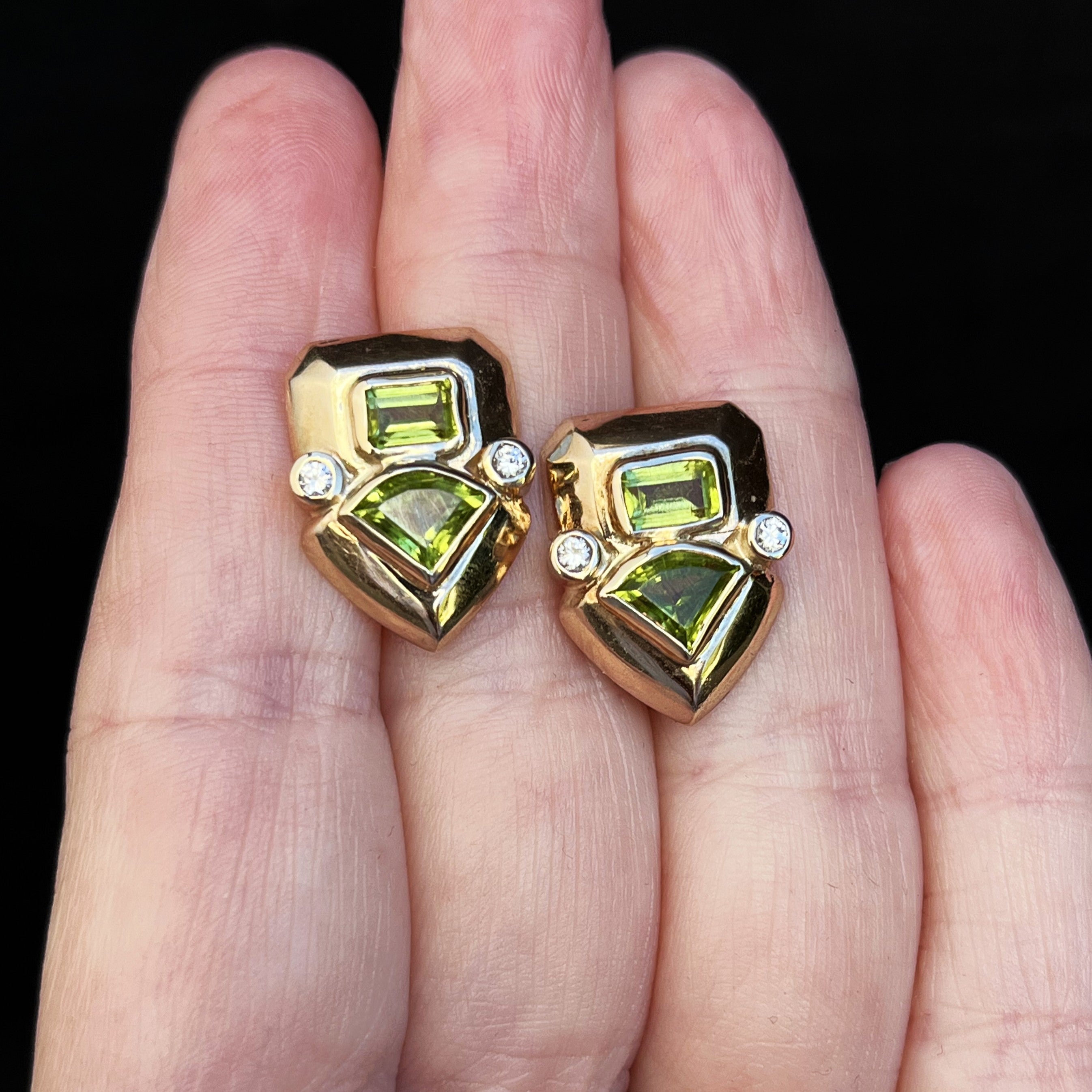 Bold, striking, and full of colour, these gorgeous c1980’s earrings are designed to turn heads. Each earring showcases two vibrant Peridots – one square-cut and one trilliant-cut, their fresh green tones glowing with natural brilliance. Between them sit two sparkling Diamonds, adding refined contrast and a touch of timeless luxury. The geometric design is framed in rich 9ct yellow gold, giving them a sleek architectural feel whilst radiating warmth and elegance, fitted with post and butterfly closures (the butterfly backs are 18ct yellow gold).