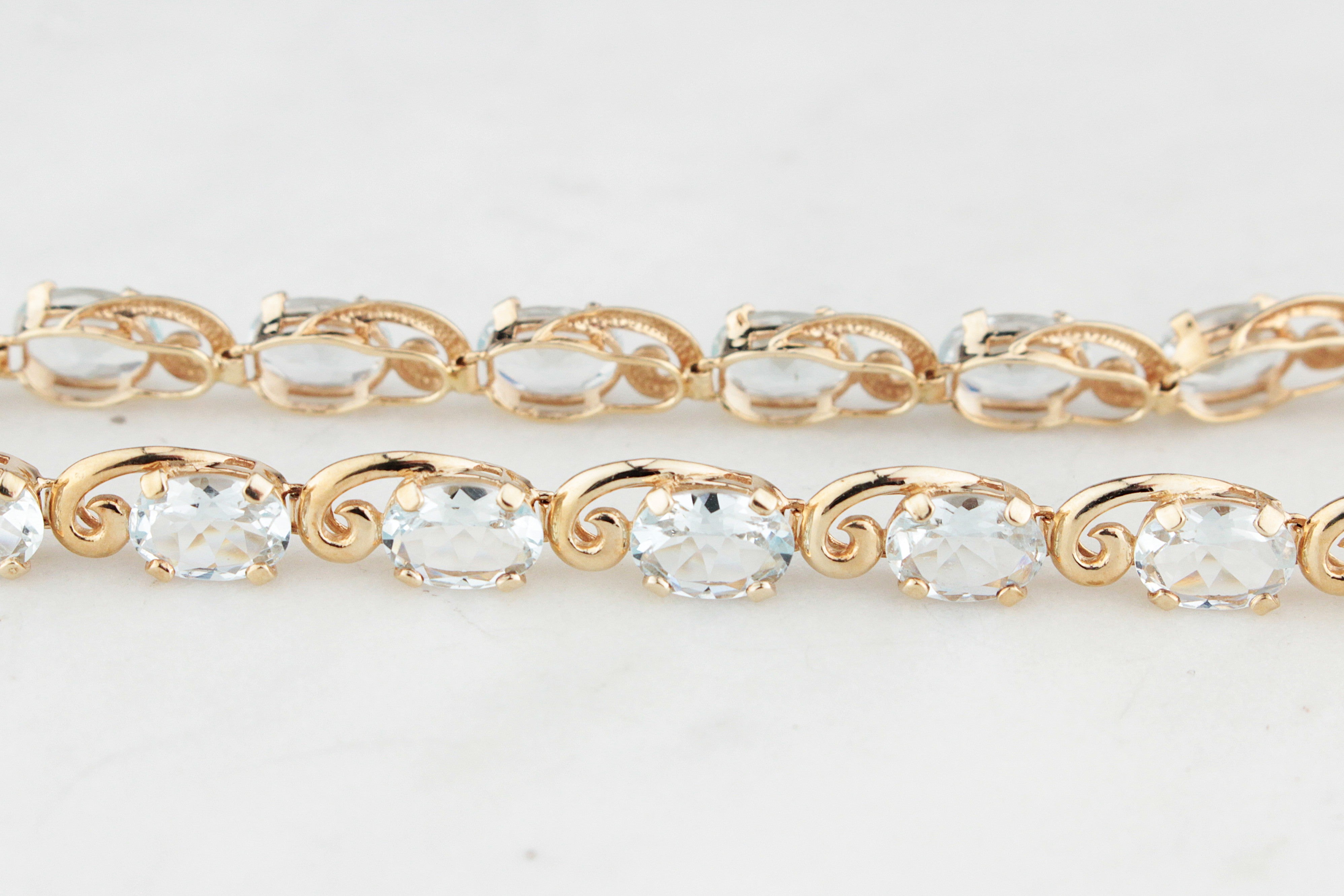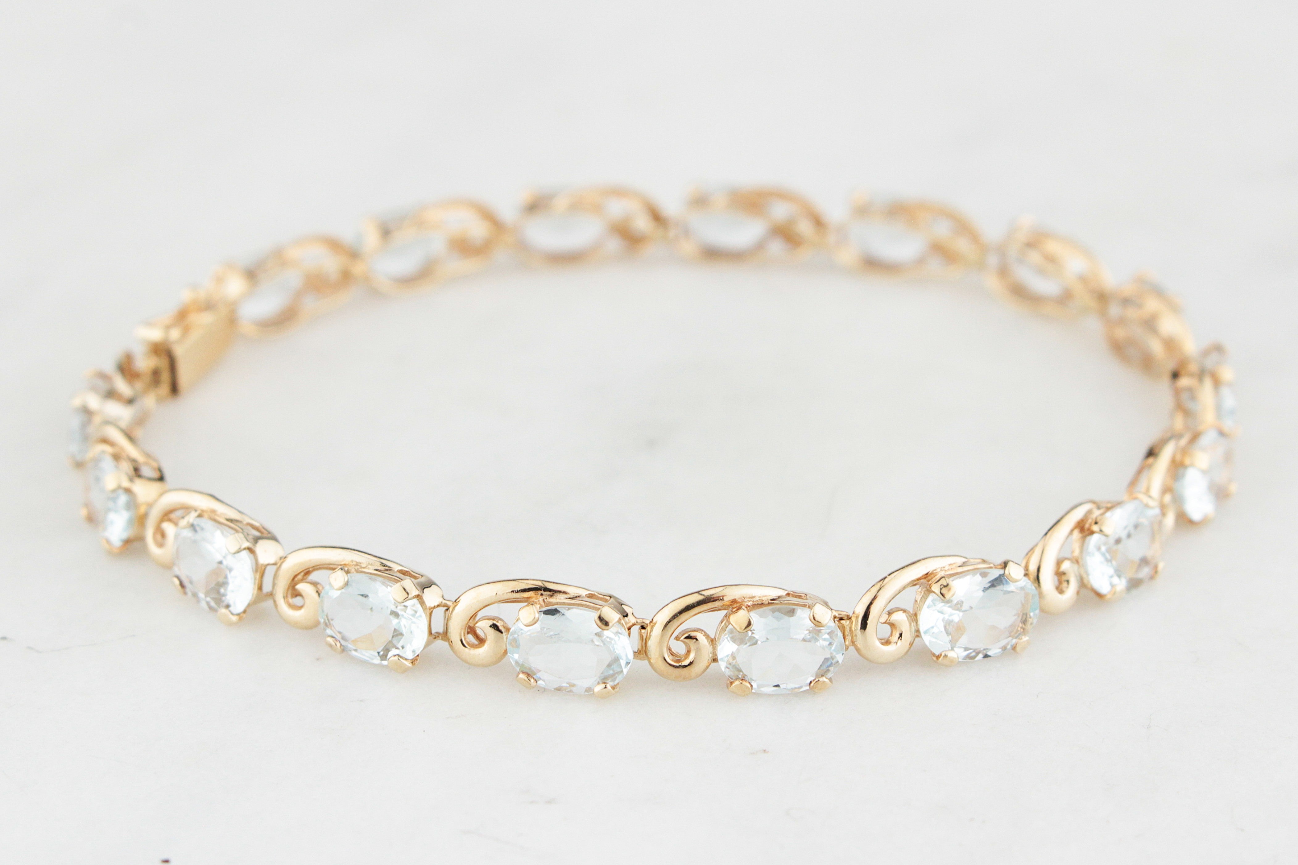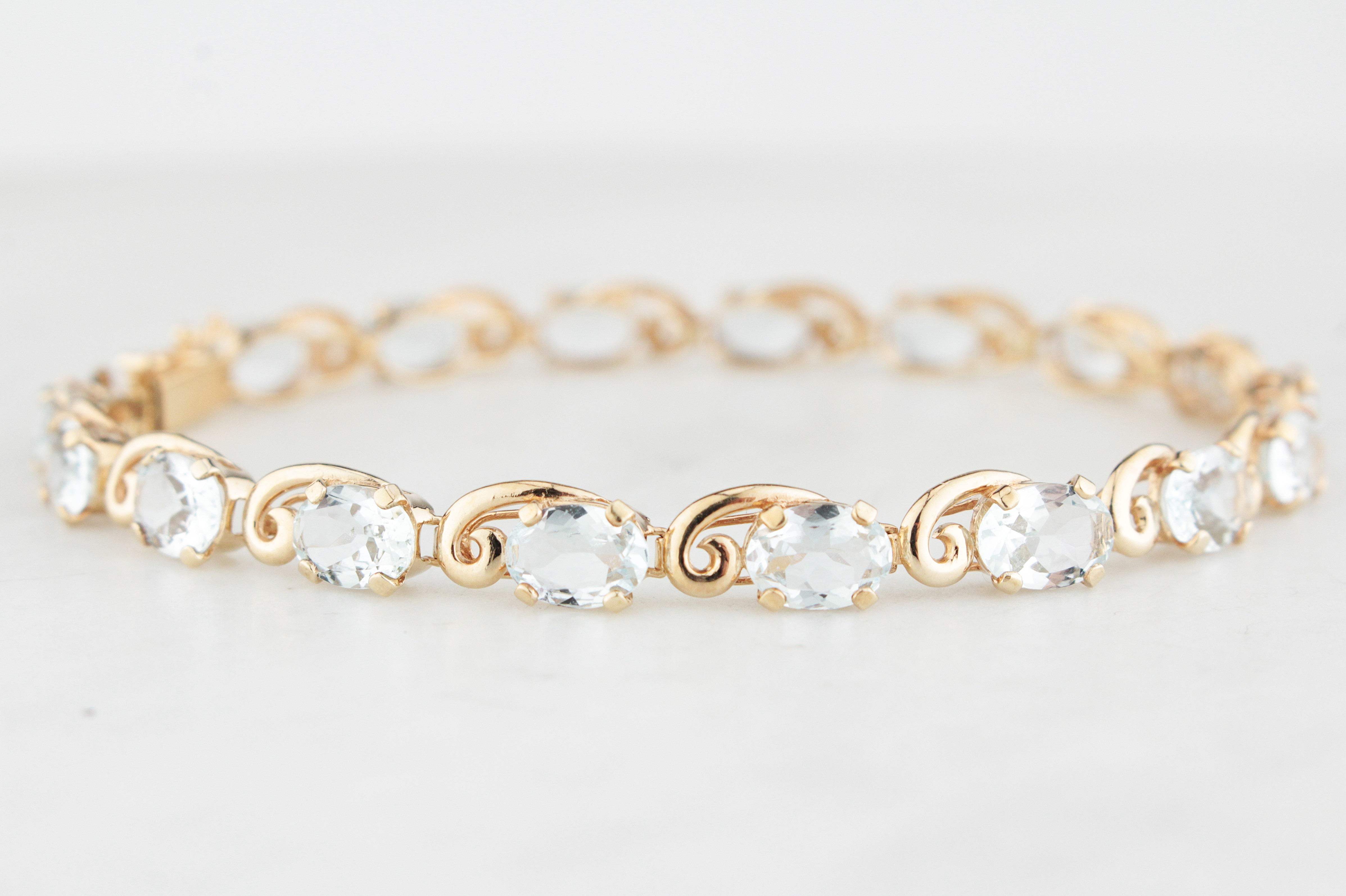 Elegant and endlessly wearable, this vintage line bracelet shimmers with a continuous row of oval-cut Aquamarines totalling 8.50ct — each one delicately claw-set to catch the light with every movement. The gemstones’ pale, icy-blue tones are perfectly complemented by the warmth of 10ct yellow gold, while graceful scroll details between each stone add a touch of romantic flourish. The bracelet closes securely with a push clasp and figure-8 safety latch, blending classic beauty with thoughtful craftsmanship.