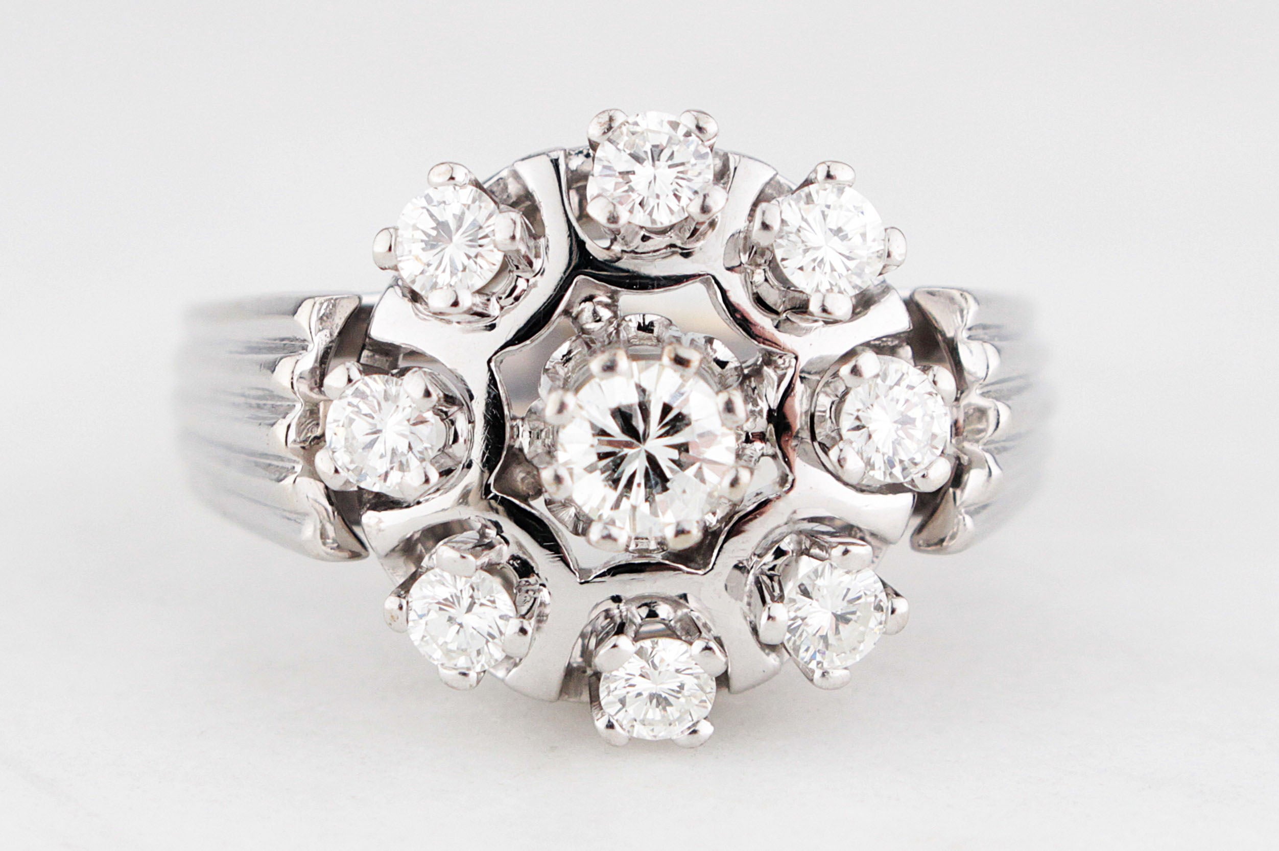 A dazzling old Hollywood glamour, this vintage Diamond cluster ring brings together sparkle, symmetry, and beautifully considered craftsmanship. Handcrafted c1940 in 14ct white gold, the design features a bright .25ct centre Diamond set in a sculptural multi-claw coronet, lifting the stone just enough to catch and refract the light with every movement.