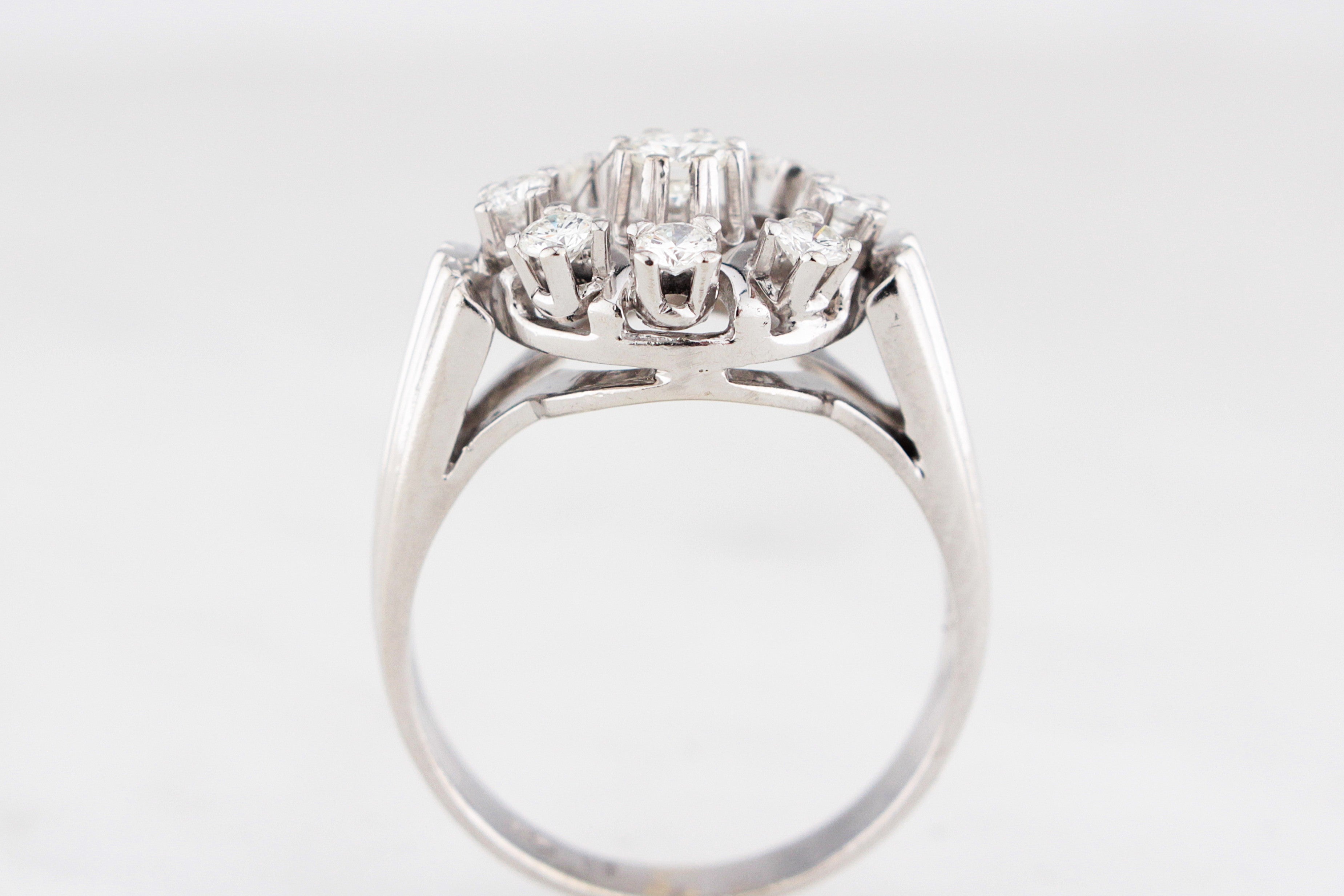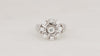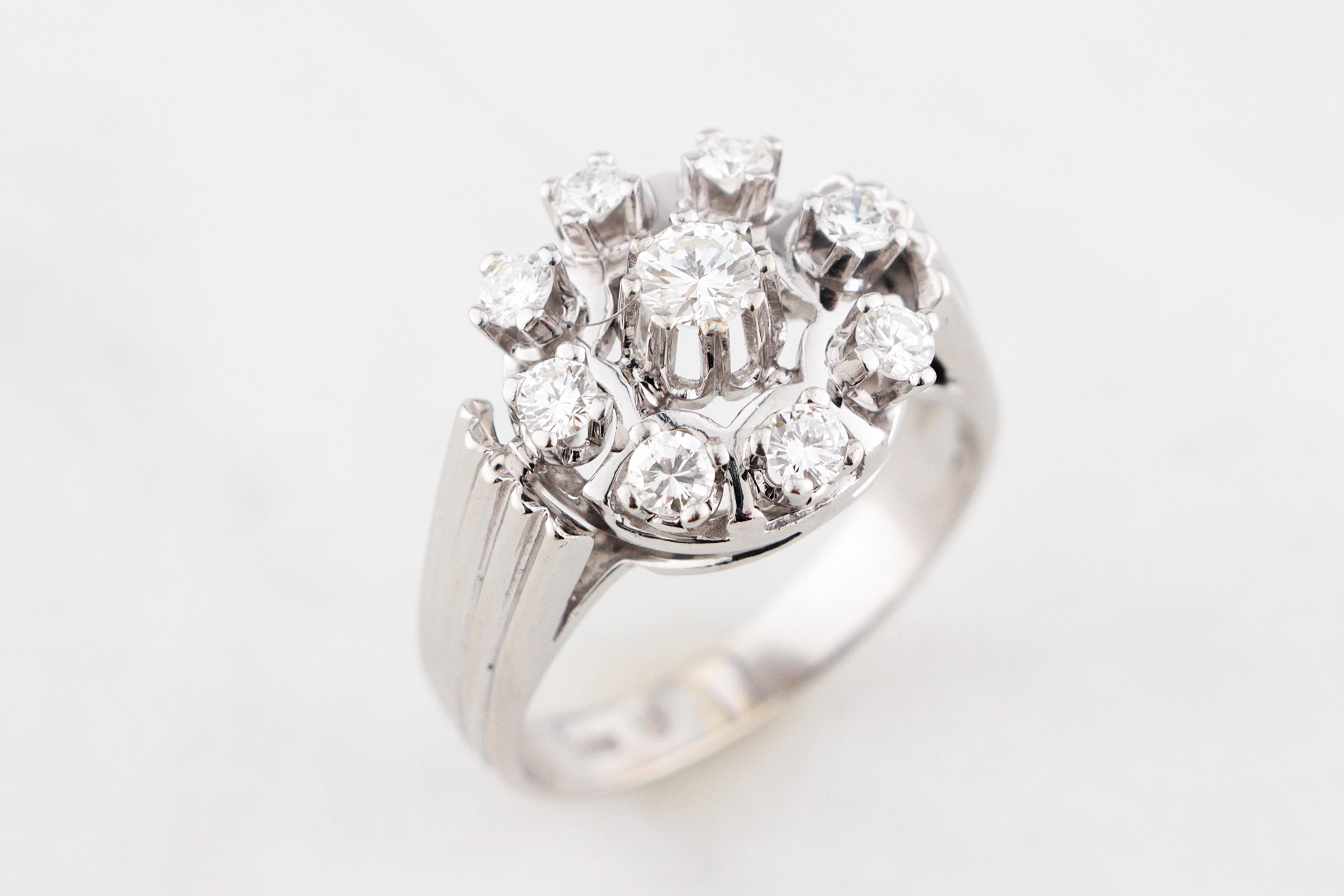 Encircling the centre is a halo of eight lively Diamonds, bringing the total Diamond weight to .80ct. Each stone is individually claw-set, creating a radiant, floral-inspired cluster that sits proudly atop a structured, fluted shoulder design. The result is a ring with incredible presence on, bold, architectural, yet still very elegant.