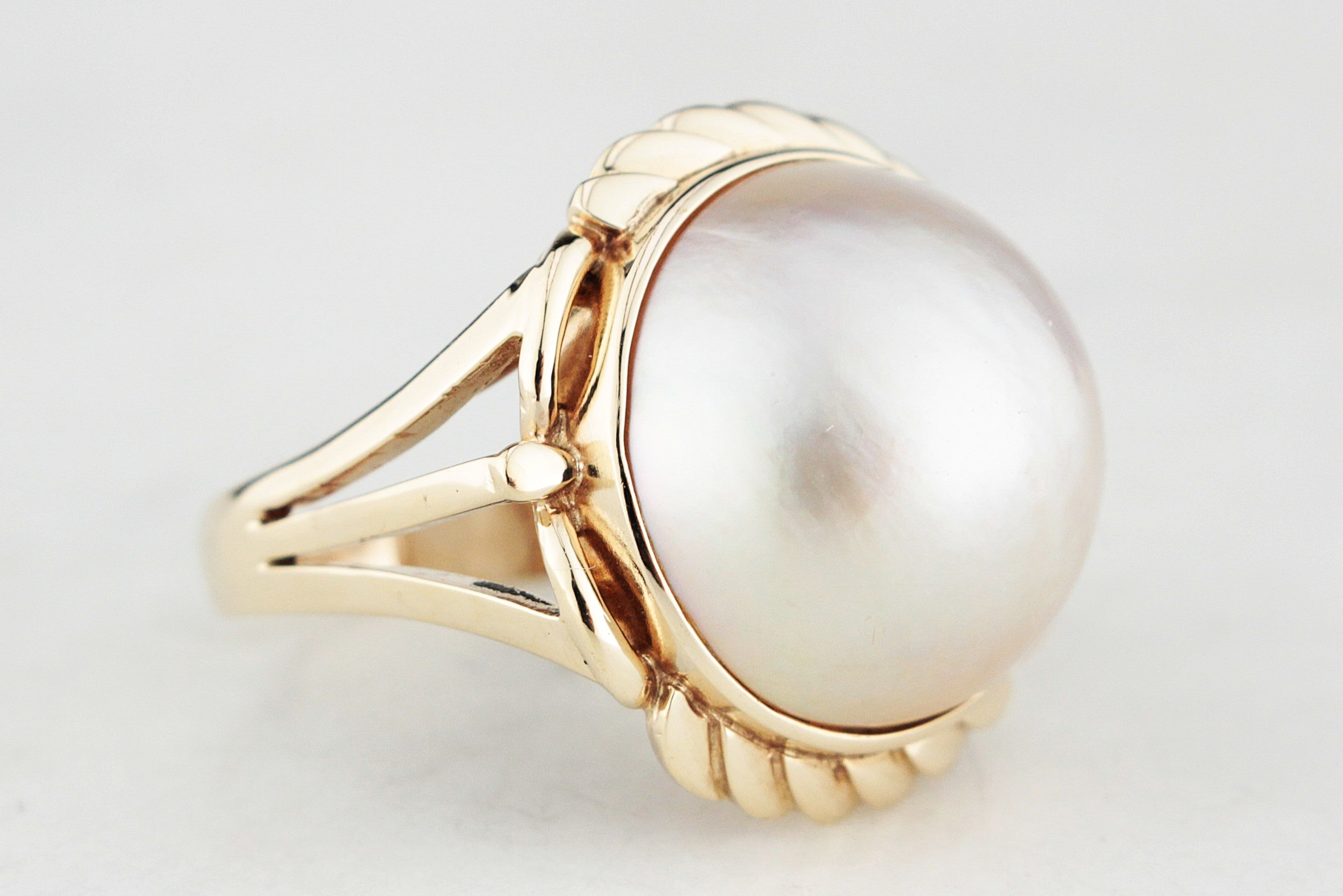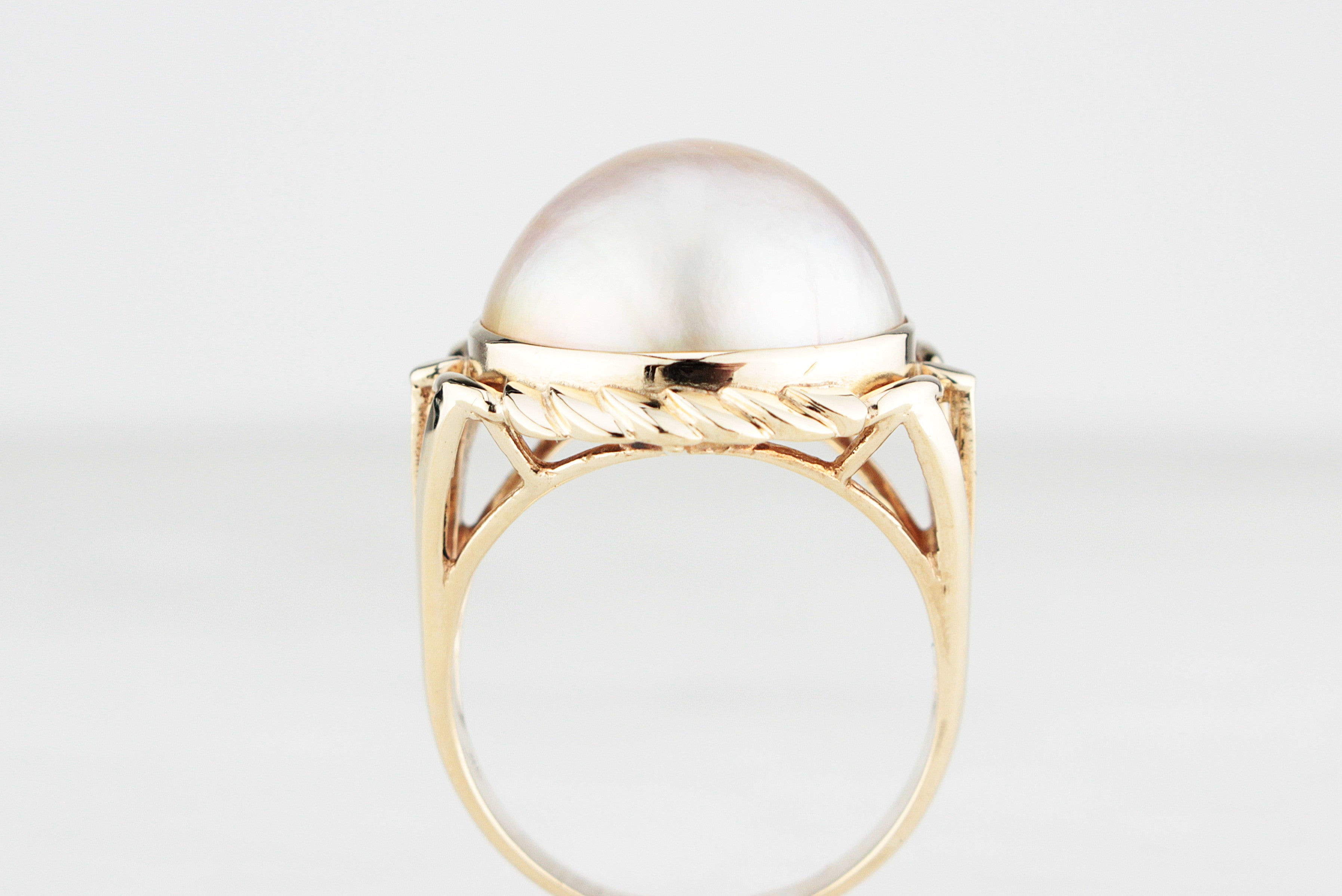 The luminous dome of the Mabe Pearl — glowing like moonlight in gold and peachy tones — makes this ring a true showstopper, perfect for adding instant polish to any look.