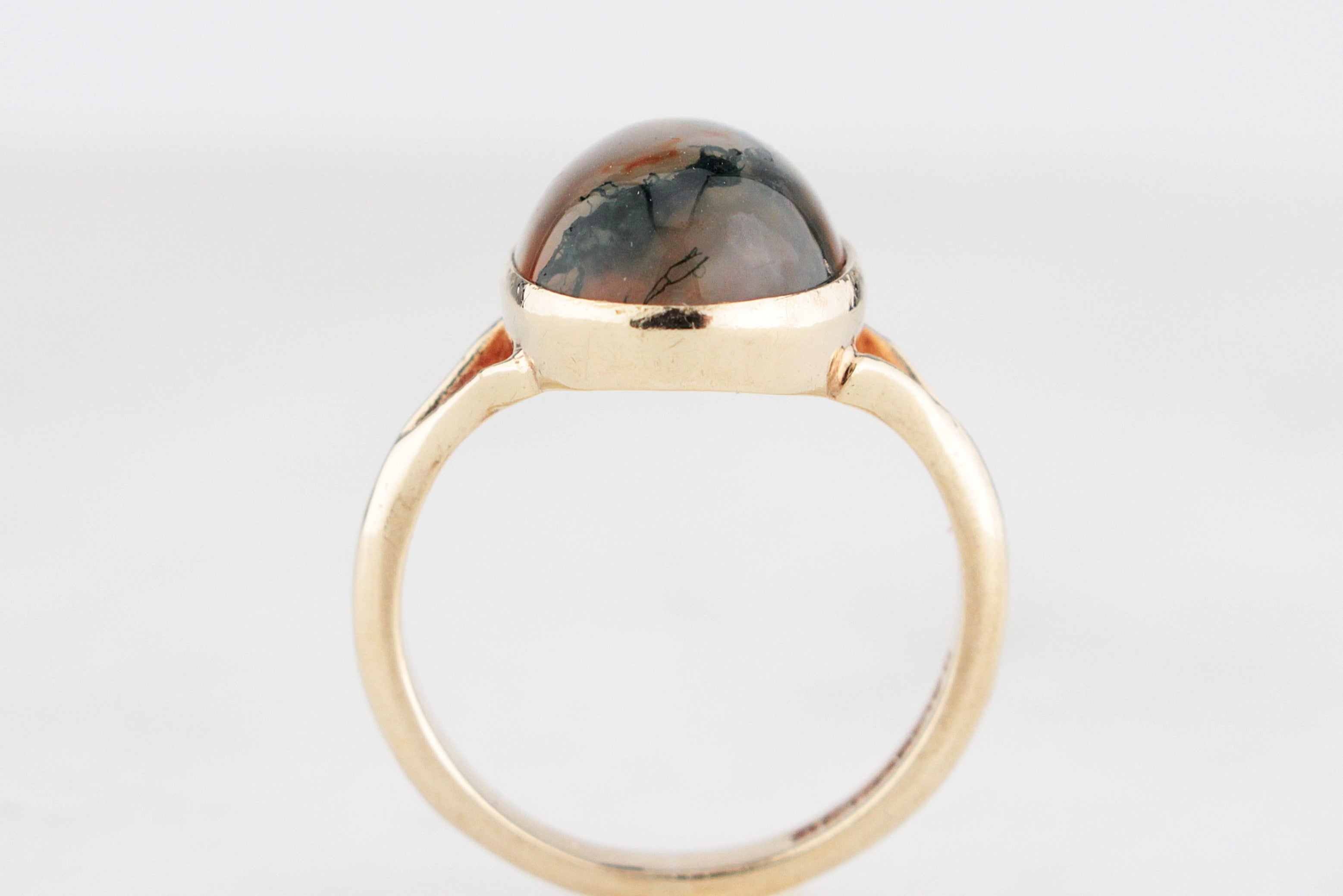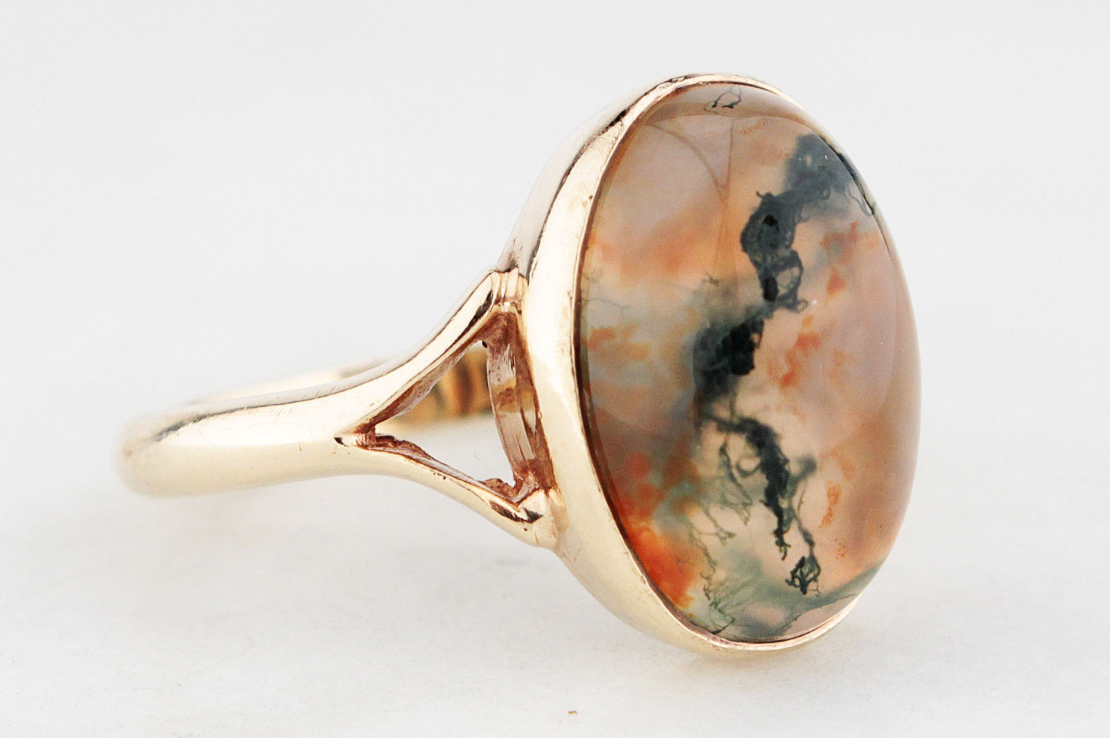 A captivating piece of natural beauty, this vintage ring features an oval cabochon of moss Agate, a gemstone admired for its enchanting, earthy inclusions that resemble miniature forest landscapes. Each swirl of green and amber within the stone tells its own story, making every moss Agate truly one of a kind.