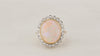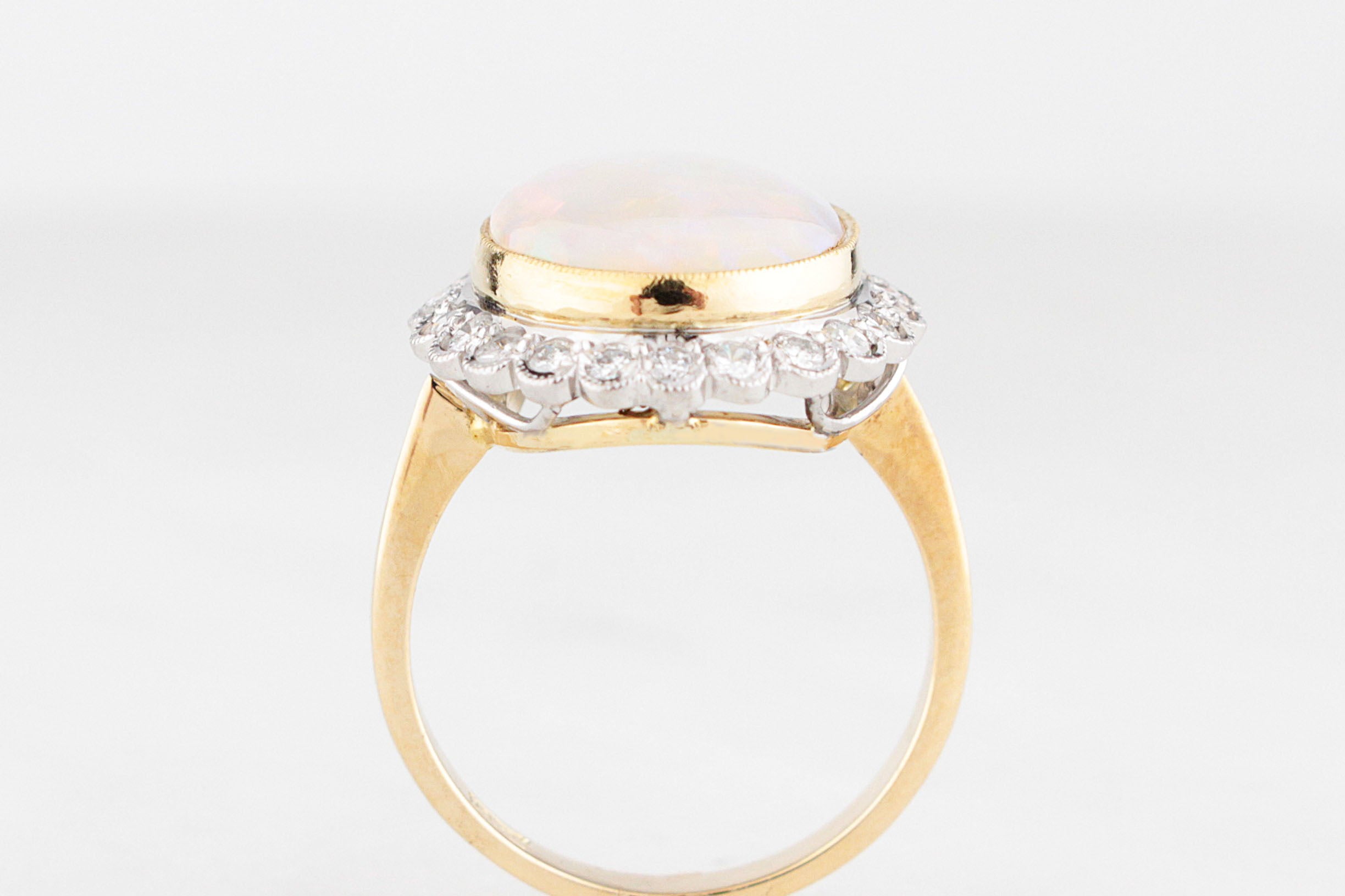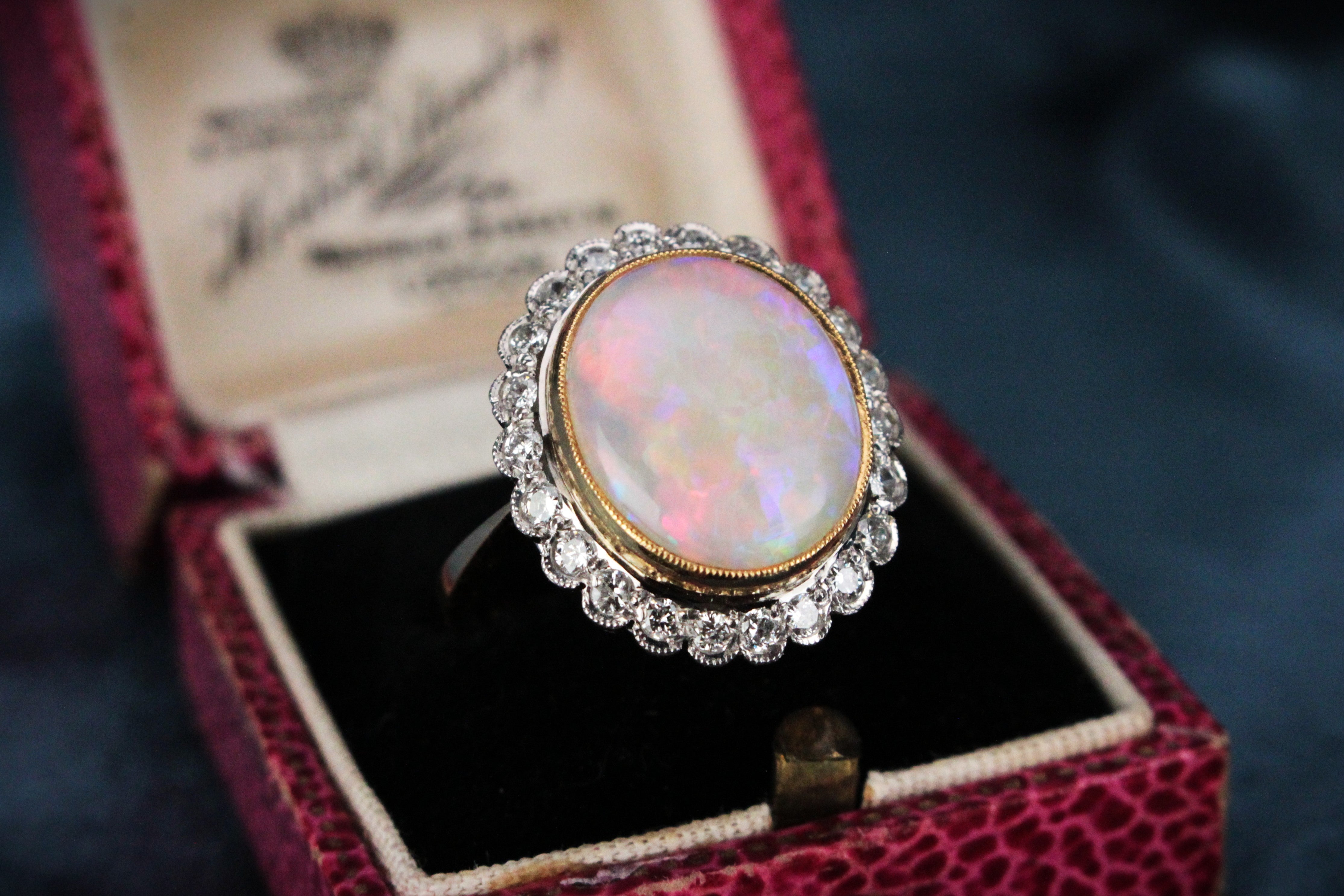 Utterly mesmerising, this vintage statement ring is a celebration of light, colour, and craftsmanship. To the centre lies a large bezel set, solid Opal alive with a full spectrum of colour, flashes of electric green, violet, orange, pinks & red that shift with every movement. Encircling the Opal are twenty-two (22) early brilliant-cut Diamonds in scalloped bezels (0.66ct) adding a halo of crisp sparkle that amplifies the Opal’s ethereal glow.