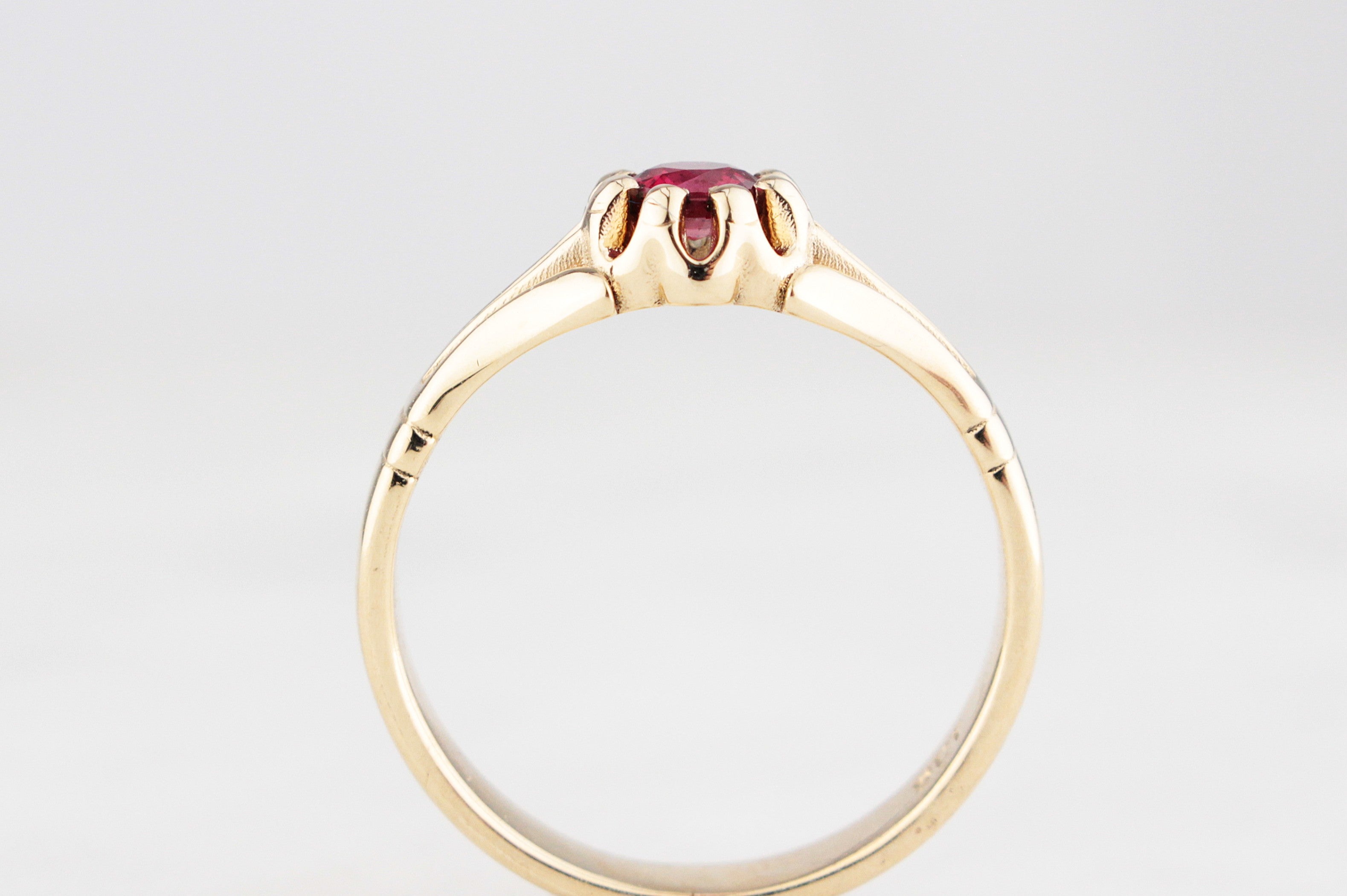 The rich glow of the Ruby paired with the timeless belcher setting and the clean, antique inspired lines, a perfect everyday stacker.