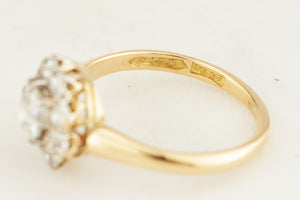 Simply breathtaking! This graceful Antique ring centres a large .60ct old European cut Diamond to a surround of nine OEC Diamonds forming the daisy cluster.