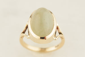 This beautiful ring centres large deep domed cabochon Chrysoberyl in a graduated bezel setting flowing to split shoulders merging to form a semi-round band.