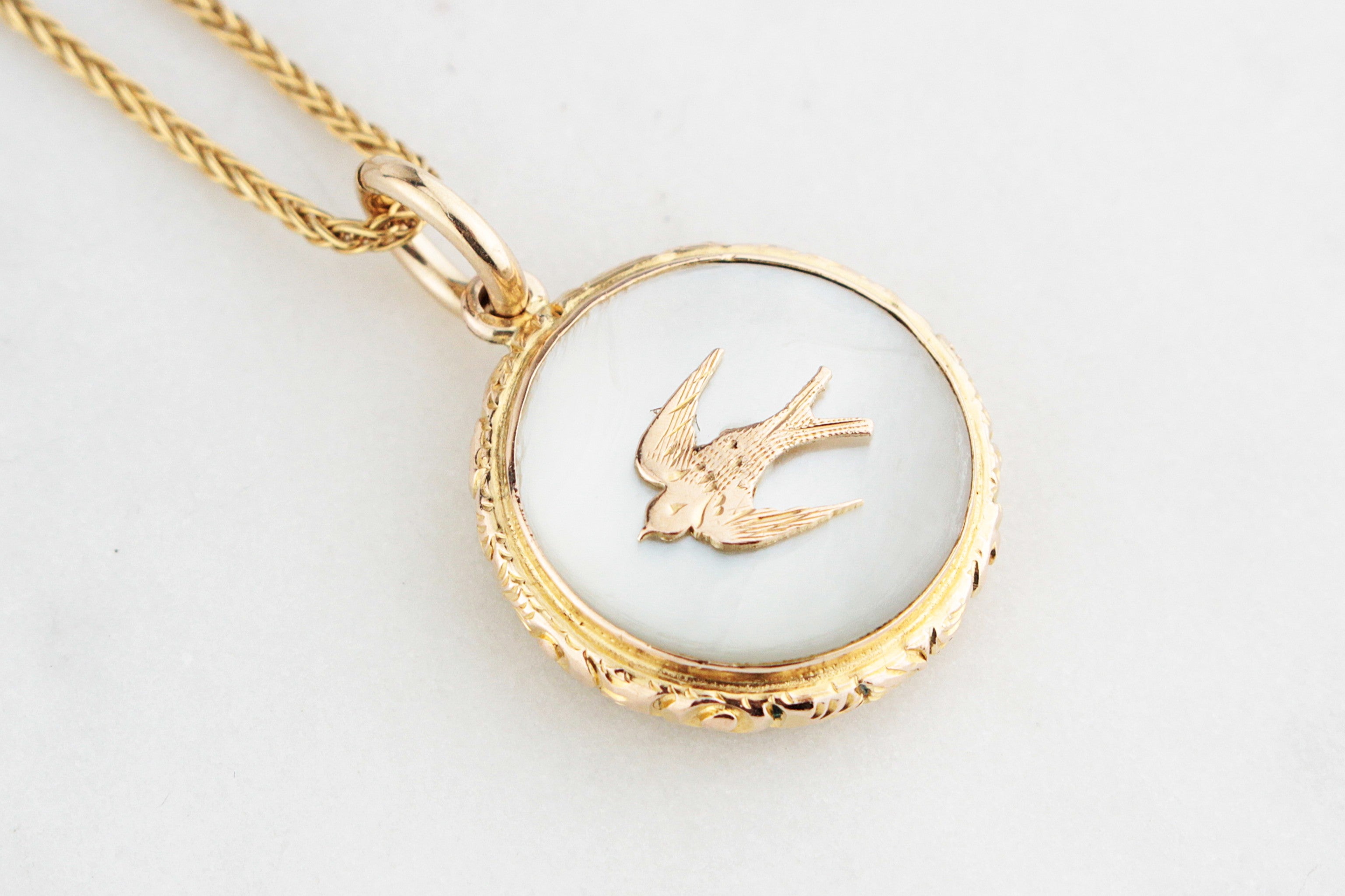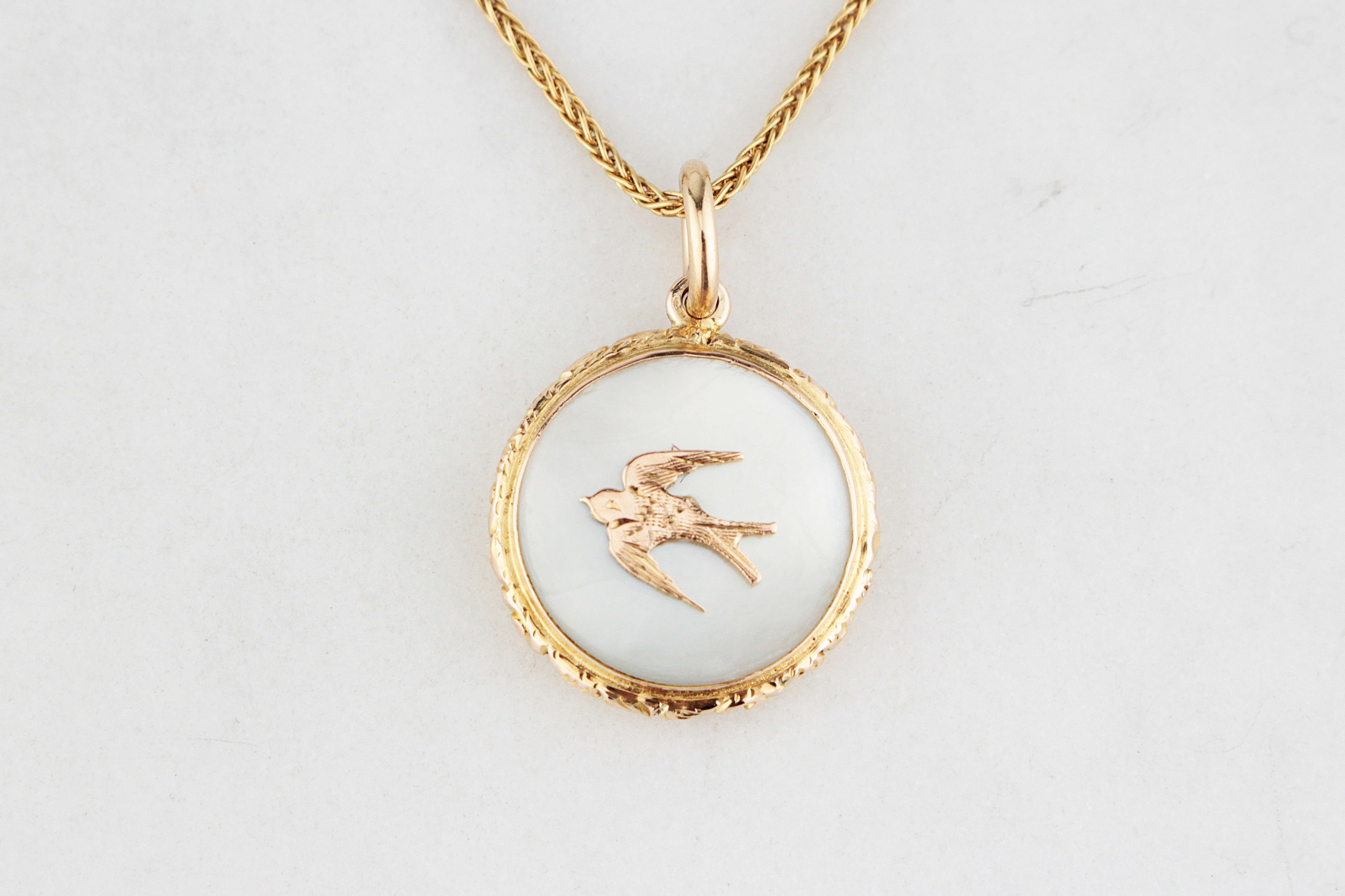The way the etched swallow glides over the glowing mother of Pearl, framed by exquisite goldwork, makes this pendant as symbolic as it is striking.
