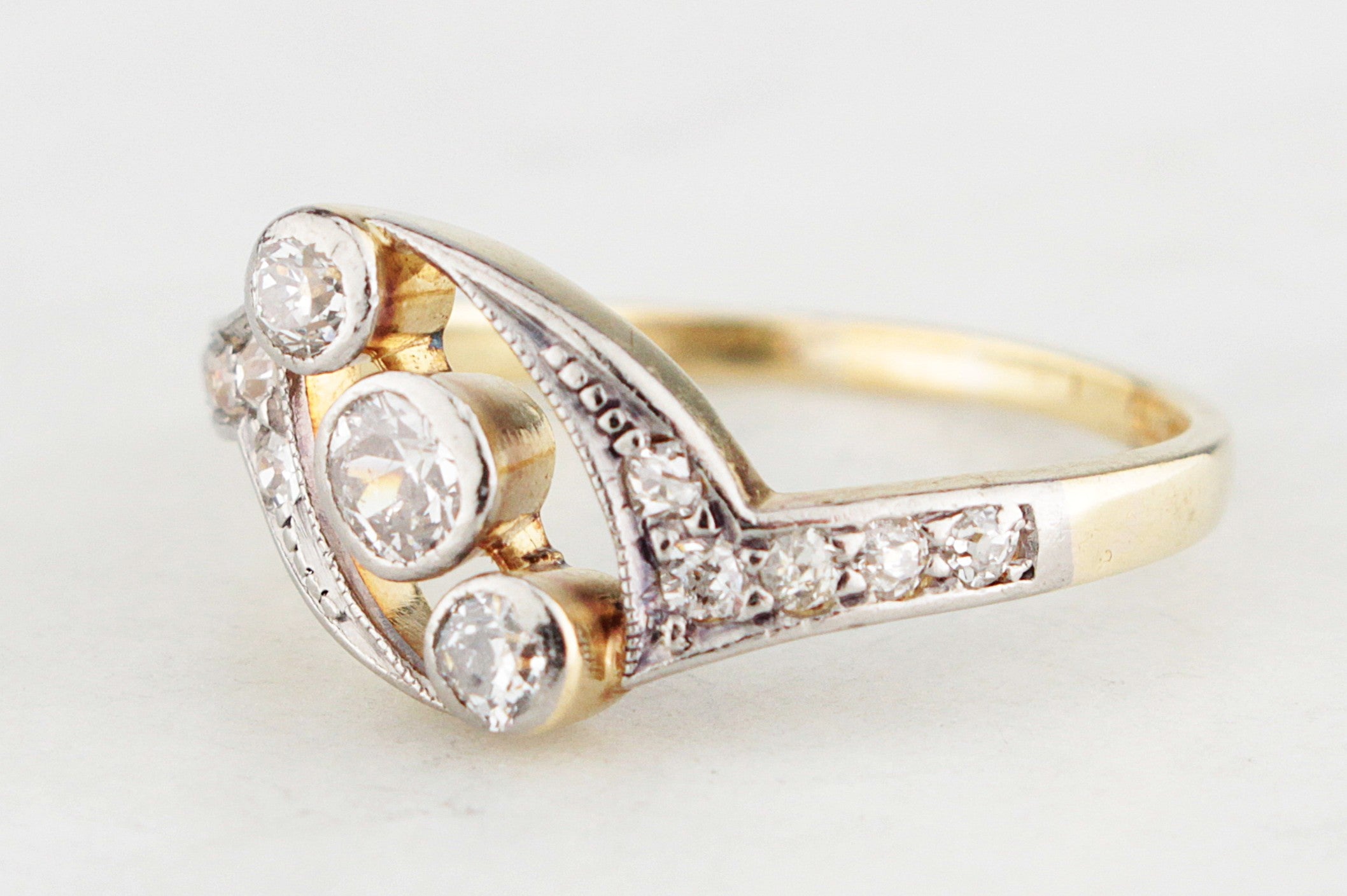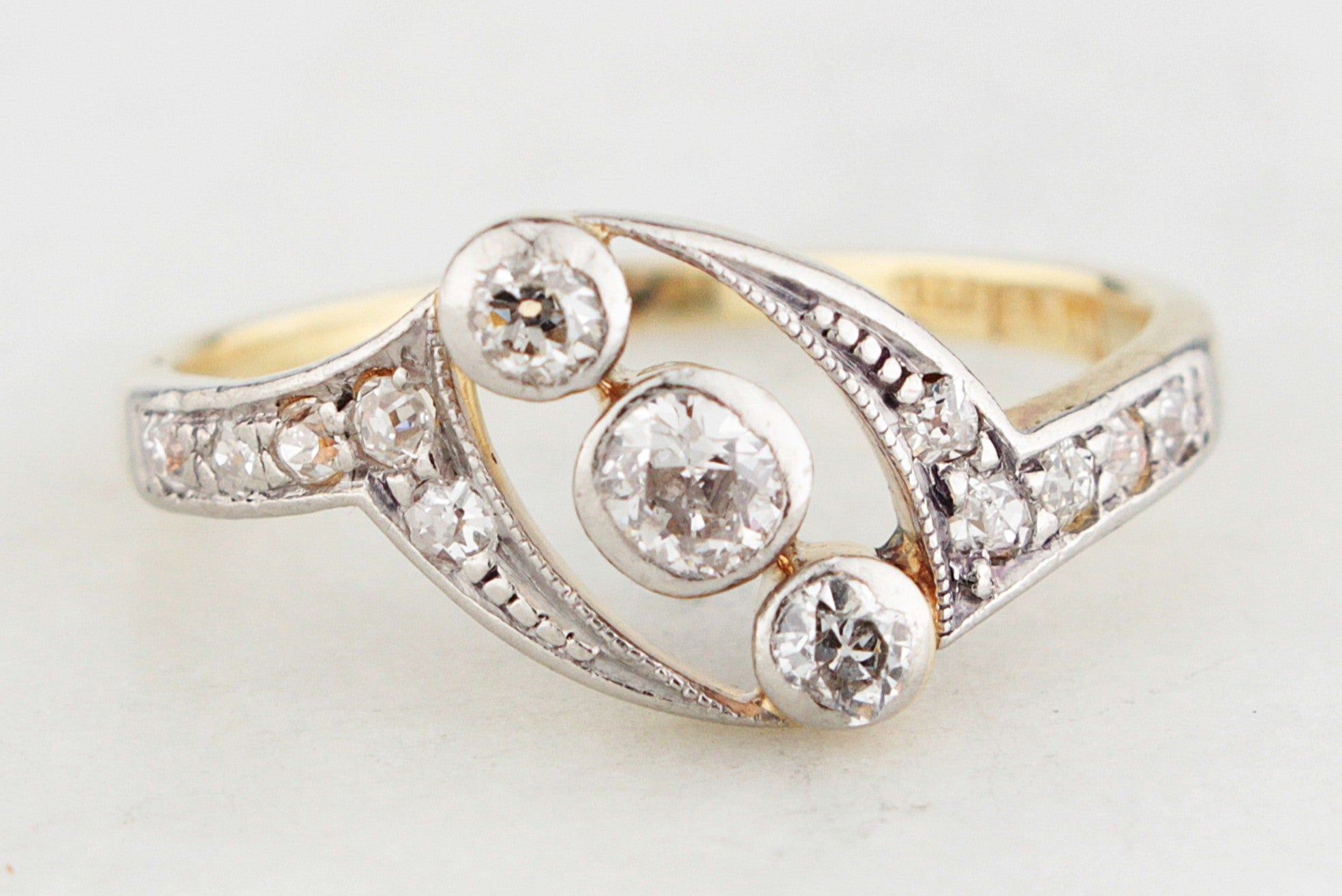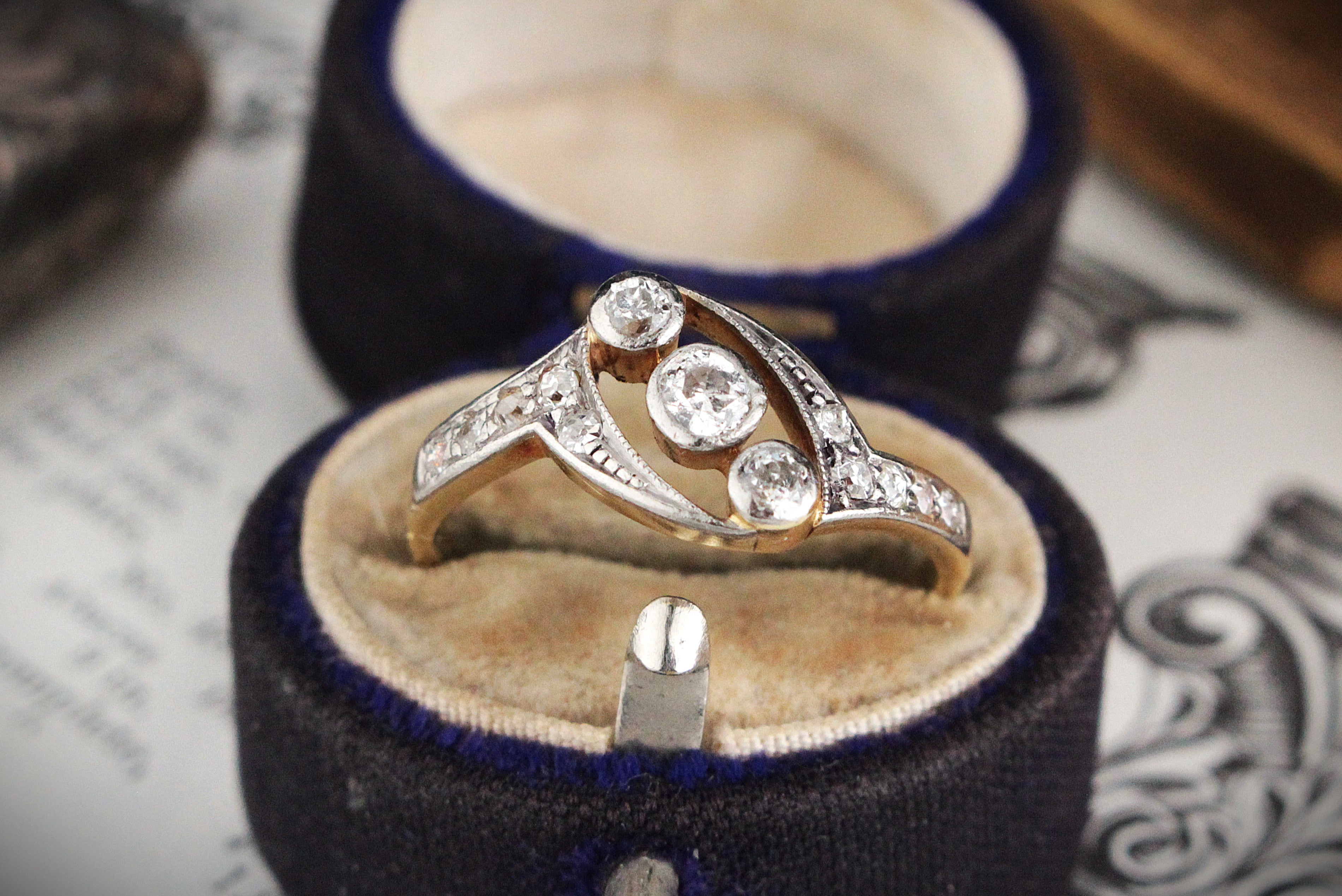 True to the bold geometry of the Art Deco era, this 1920s ring features three bezel-set old European cut Diamonds arranged diagonally. An elegant bypass design flows into Diamond-set shoulders, all beautifully handcrafted in 18ct yellow and white gold.