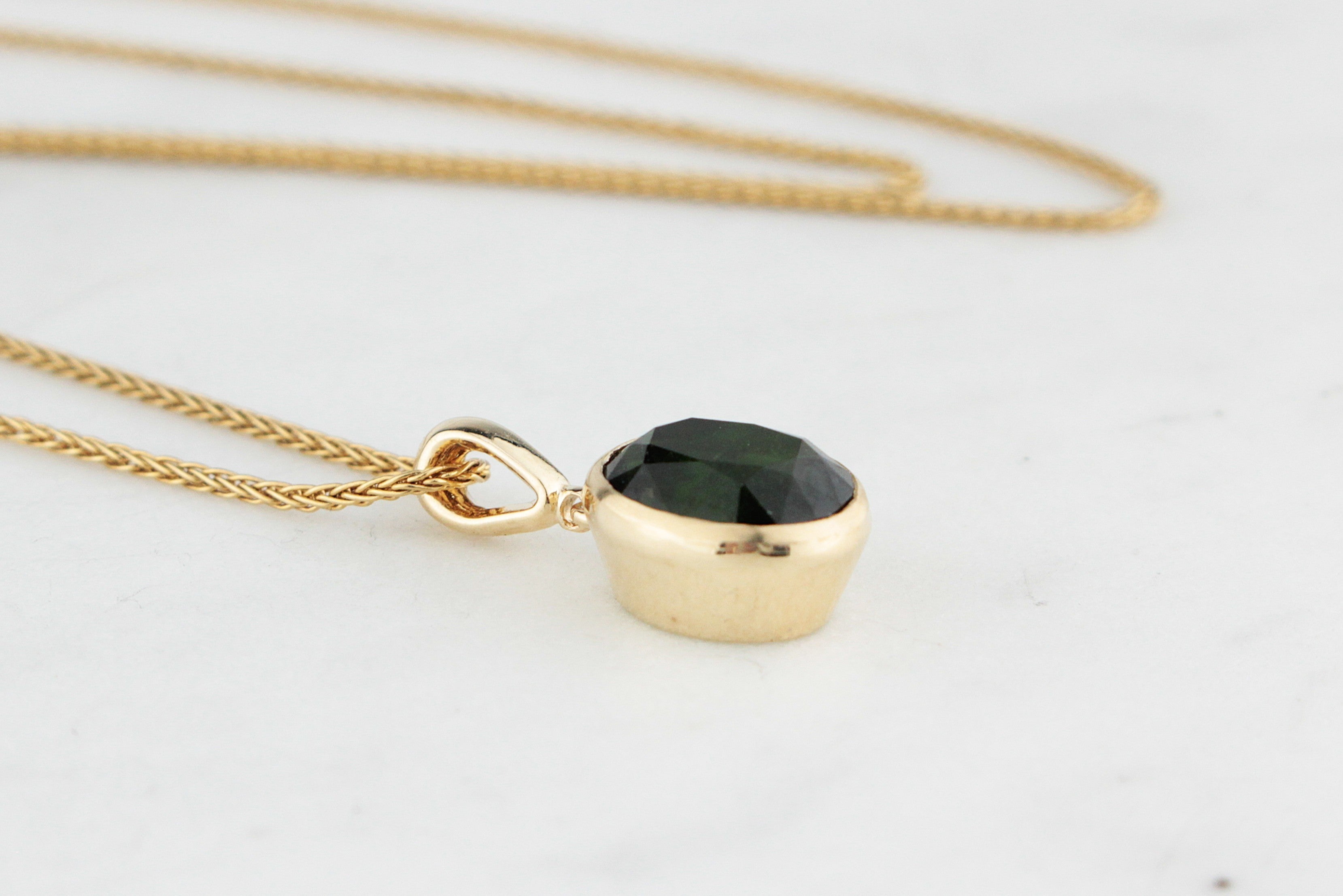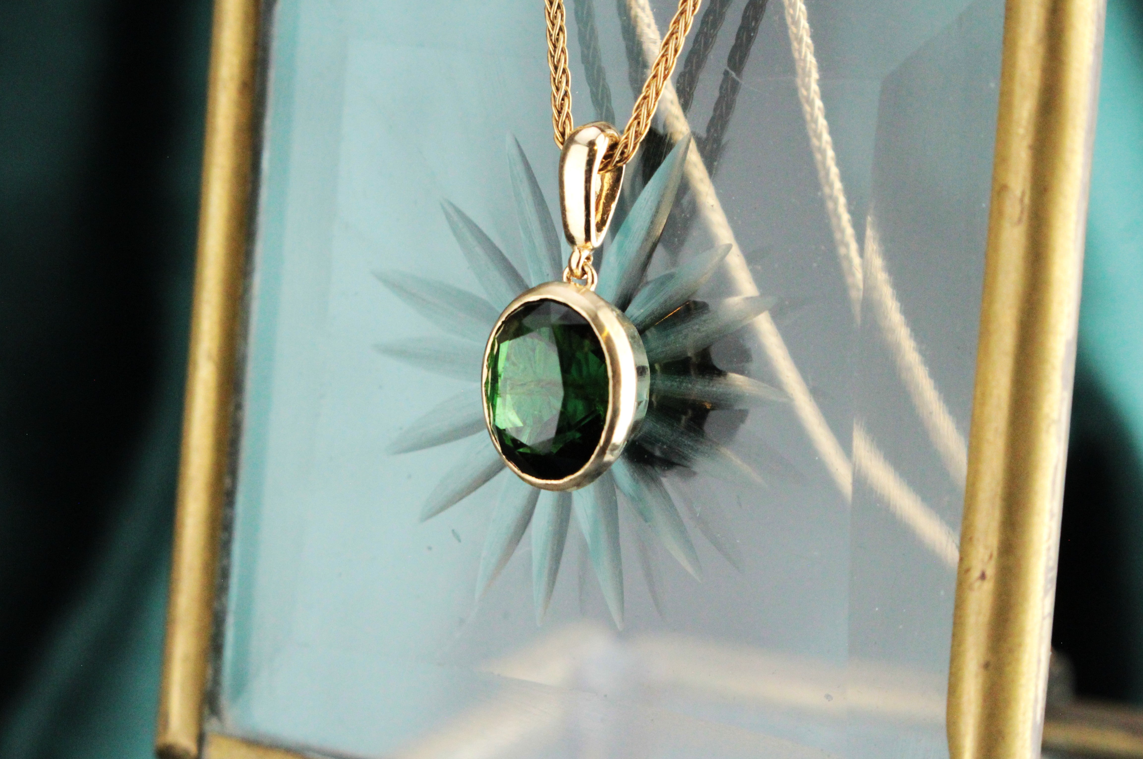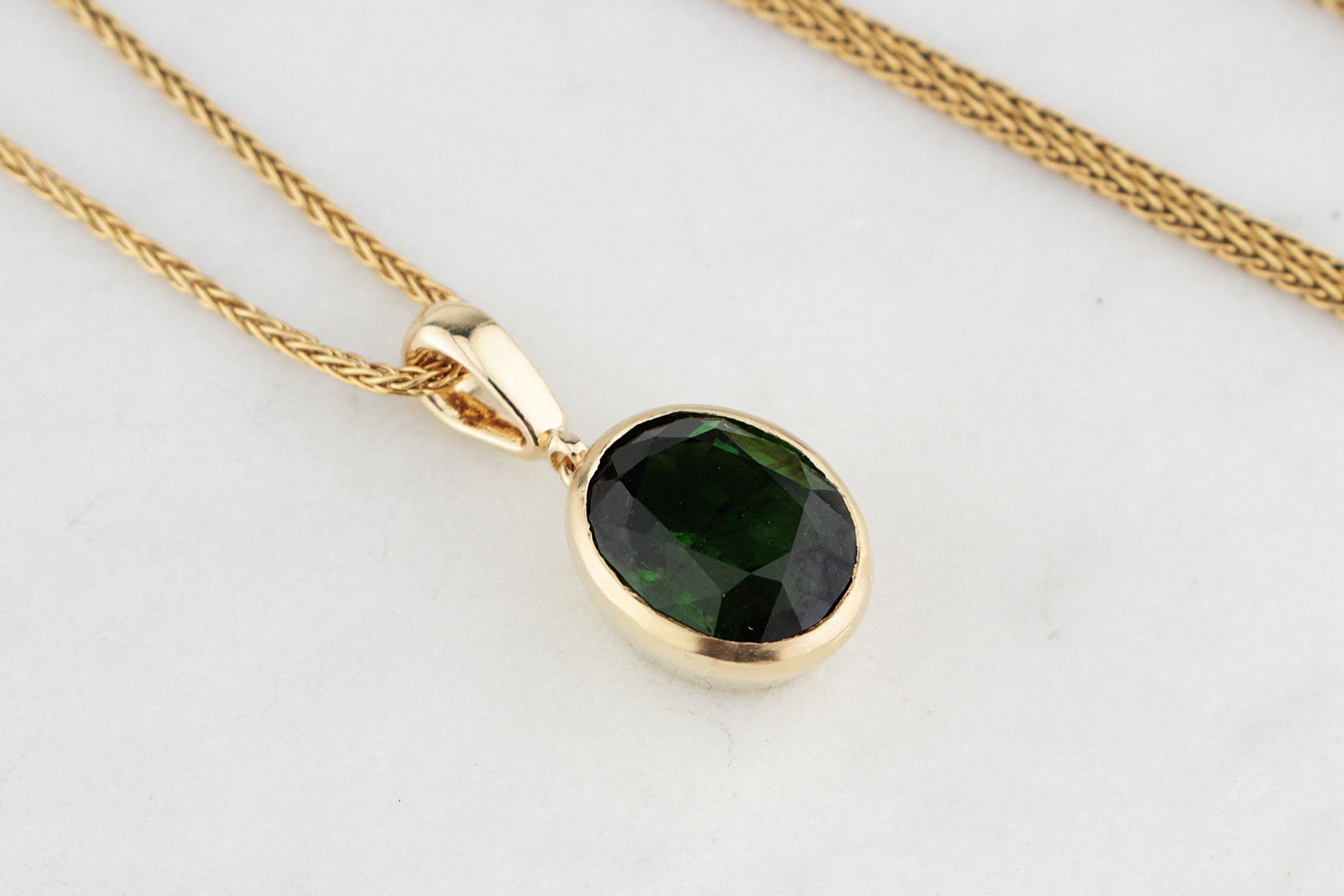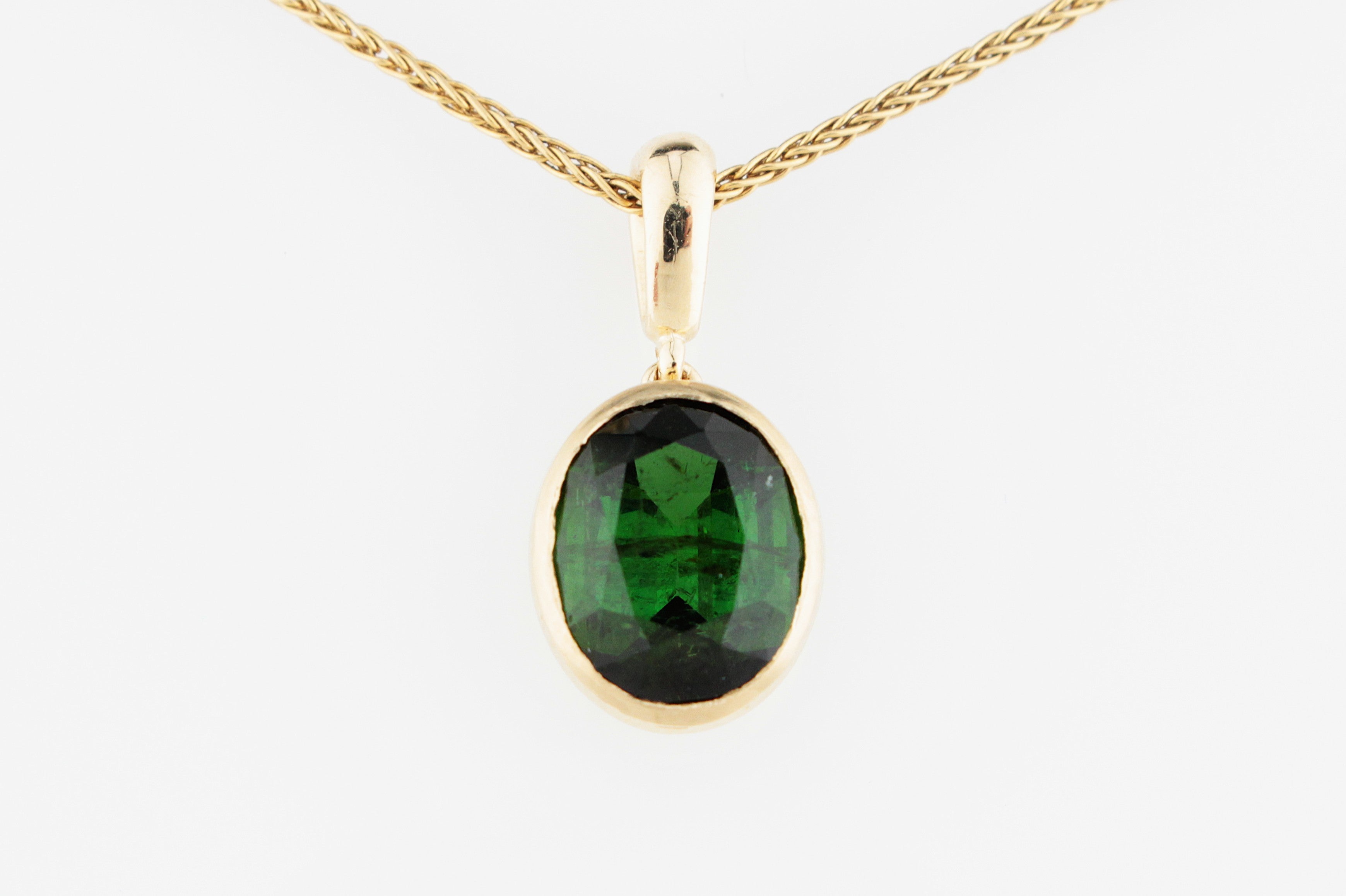 Elegant and timeless, this bespoke pendant showcases the rich, verdant beauty of green Tourmaline. The oval-cut 2.75ct gemstone, with its deep forest tones and natural flashes of brilliance, bezel-set in smooth 10ct yellow gold for a sleek and modern finish.