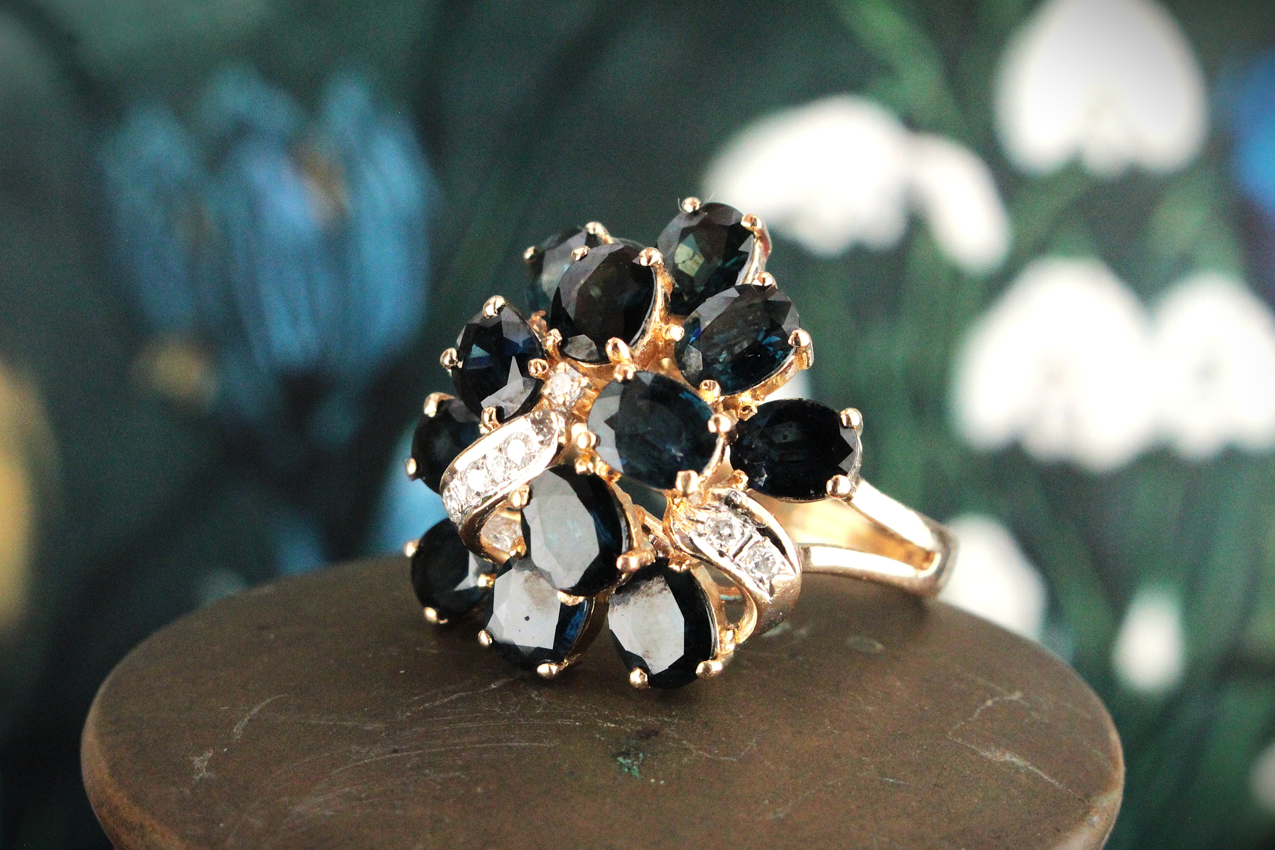 A fabulous Mid-century cocktail ring with a confident, elegant presence on, the sublime blue hued sapphires offset by sparkling diamond accents, a true statement piece with timeless style.