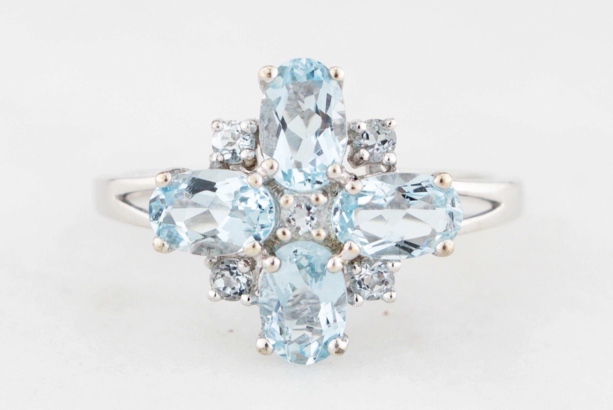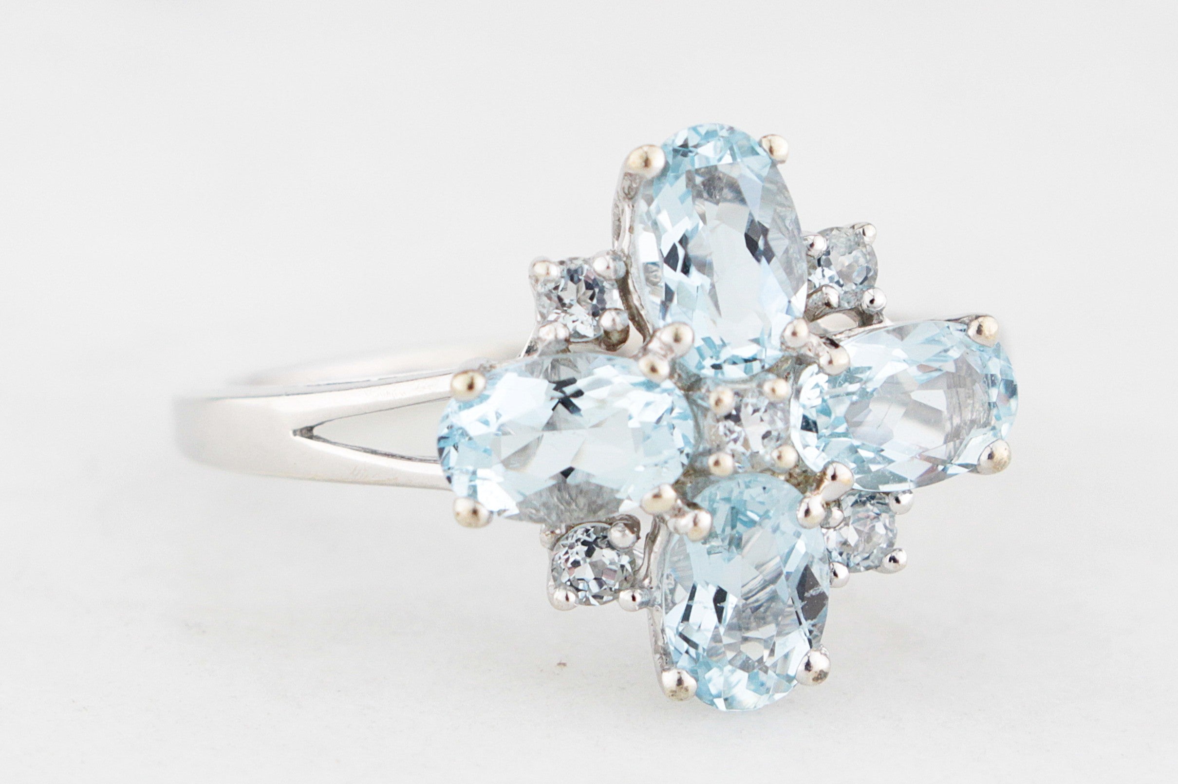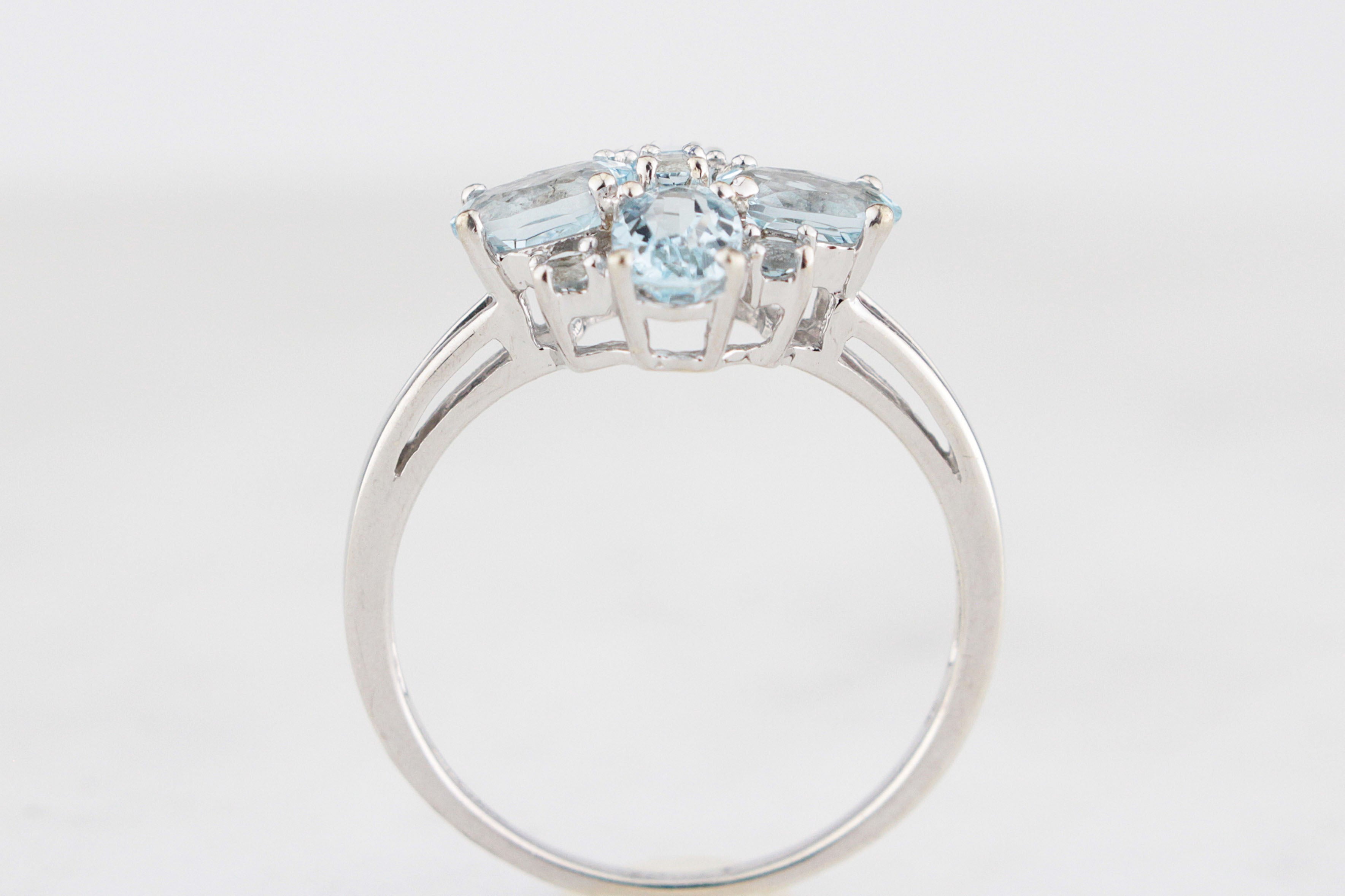 Delicately luminous and beautifully balanced, this vintage style Aquamarine cluster ring captures the ethereal charm of a spring morning! Crafted in 9ct white gold, it showcases a dazzling arrangement of icy blue Aquamarines forming a radiant quatrefoil cluster that dances with light from every angle. The soft pastel tones of the gemstones are complemented by the cool sheen of white gold, giving the ring an elegant, almost celestial radiance.