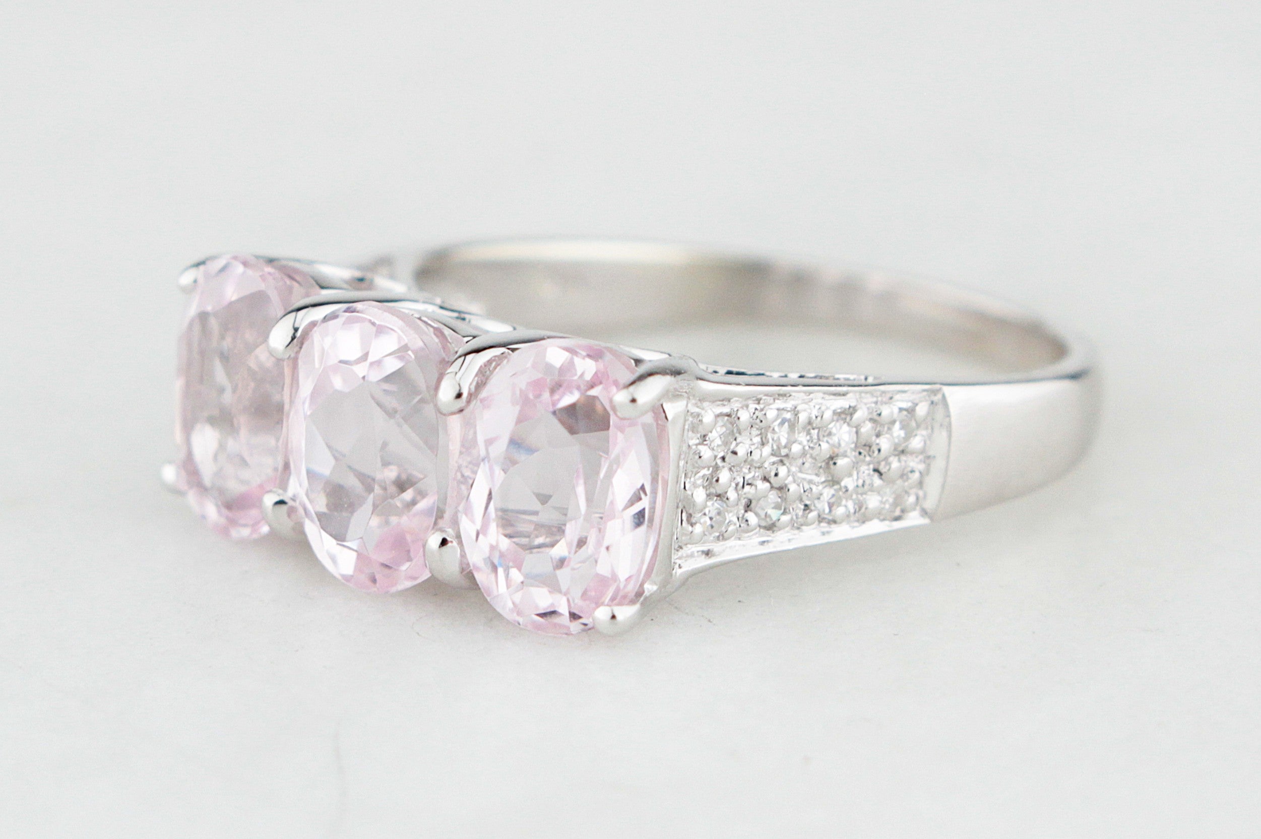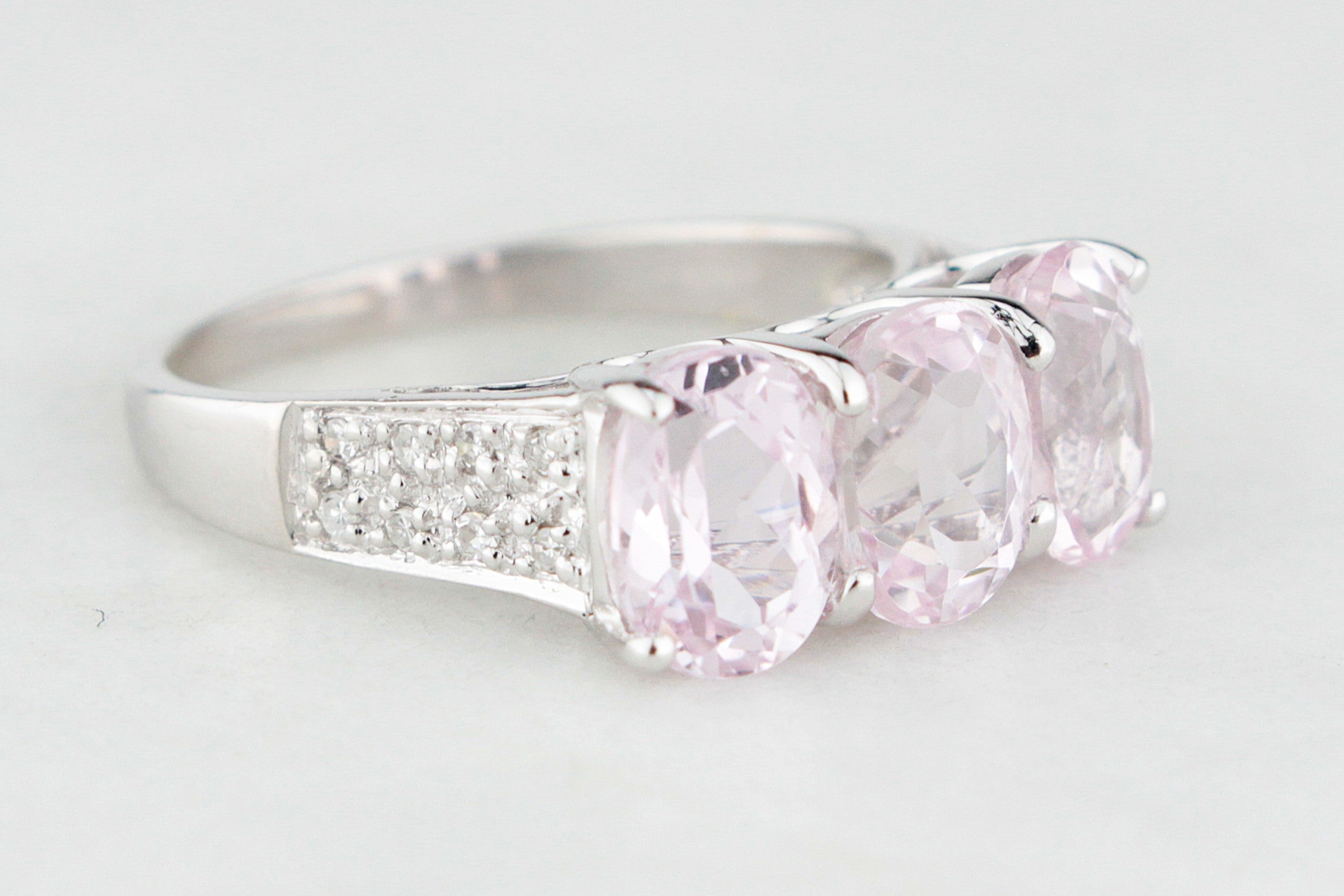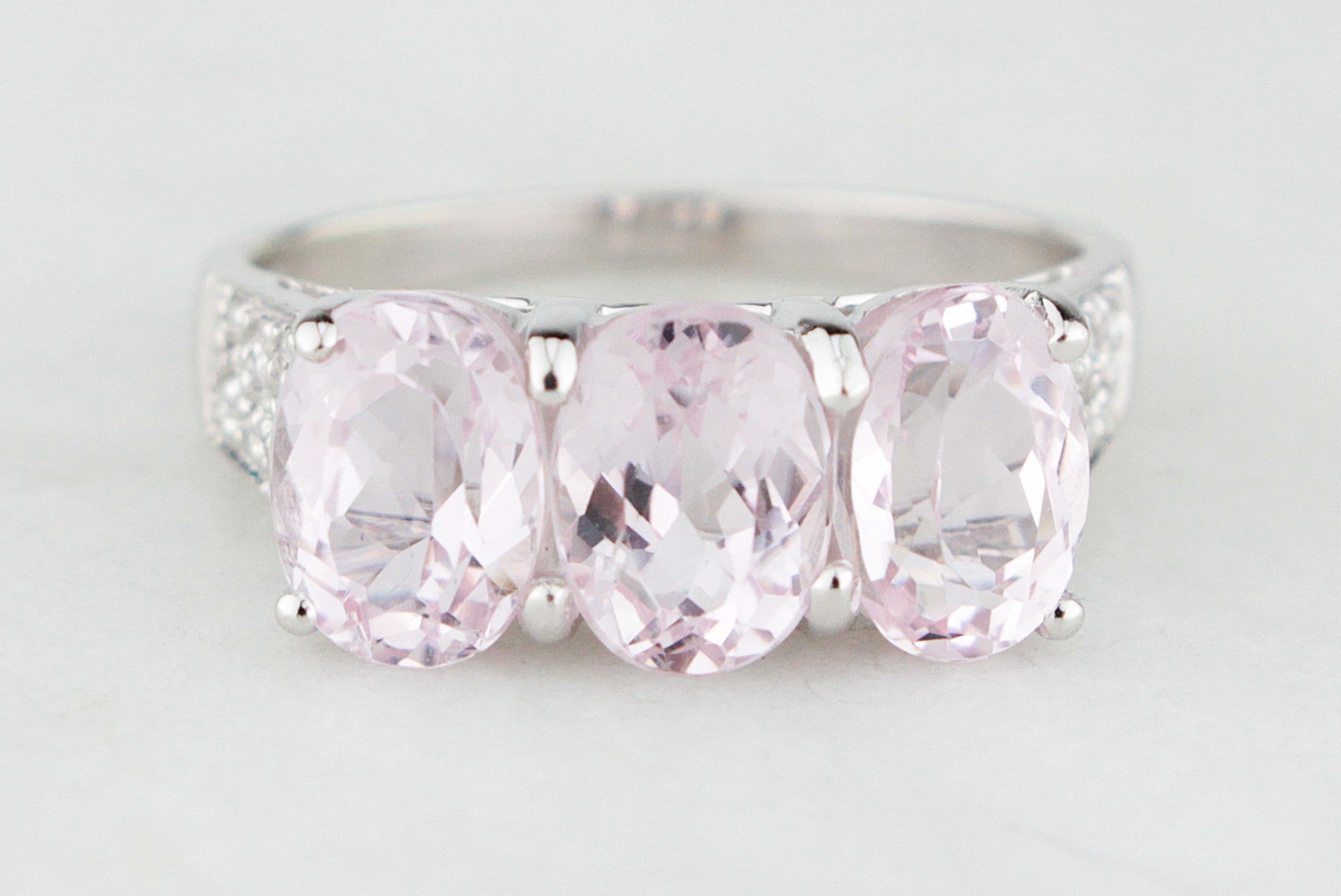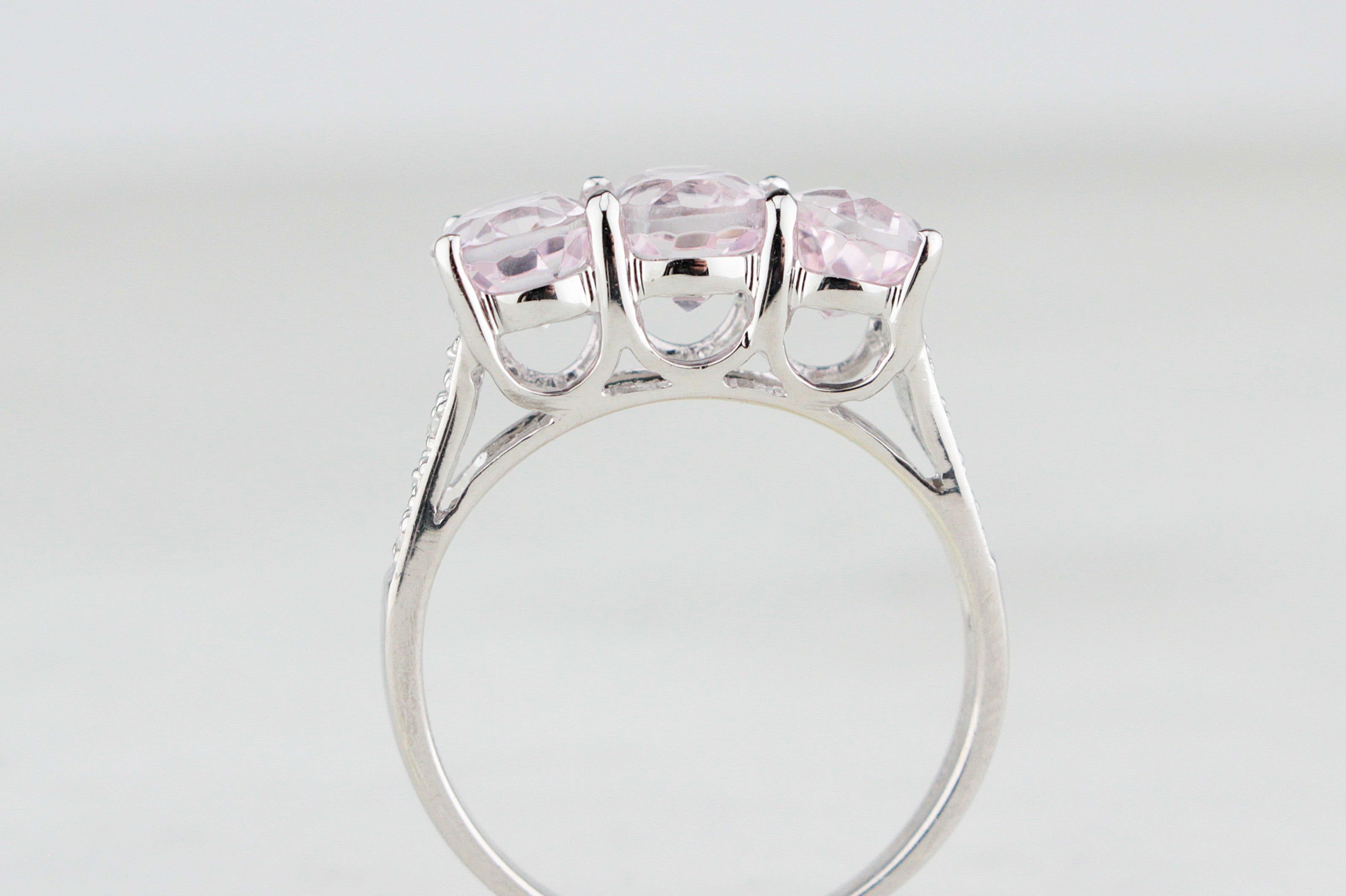 This striking modern trilogy ring showcases the soft, romantic beauty of Kunzite. Three 1ct cushion-cut Kunzites sit proudly across the top, their delicate blush-pink hue glowing with feminine elegance. The stones are perfectly balanced by upswept Diamond set shoulders that add a refined sparkle, with eight to each side, leading into the smooth band of cool 9ct white gold.
