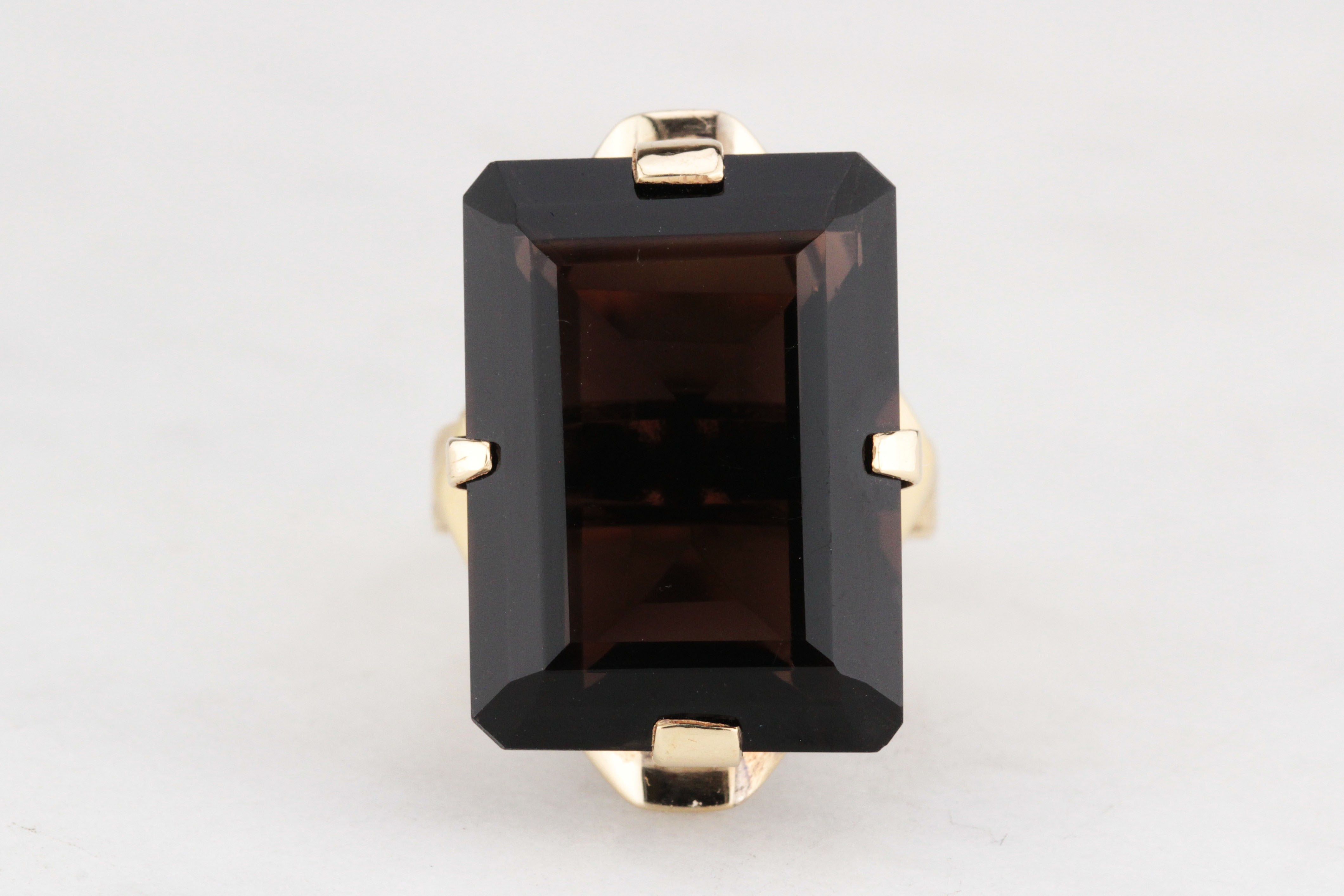 Bold and moody, this stunning retro cocktail ring centres a deliciously deep Smoky Quartz in a warm 10ct yellow gold setting. The broad setting and earthy tones are a throwback to the glamorous ’70s.