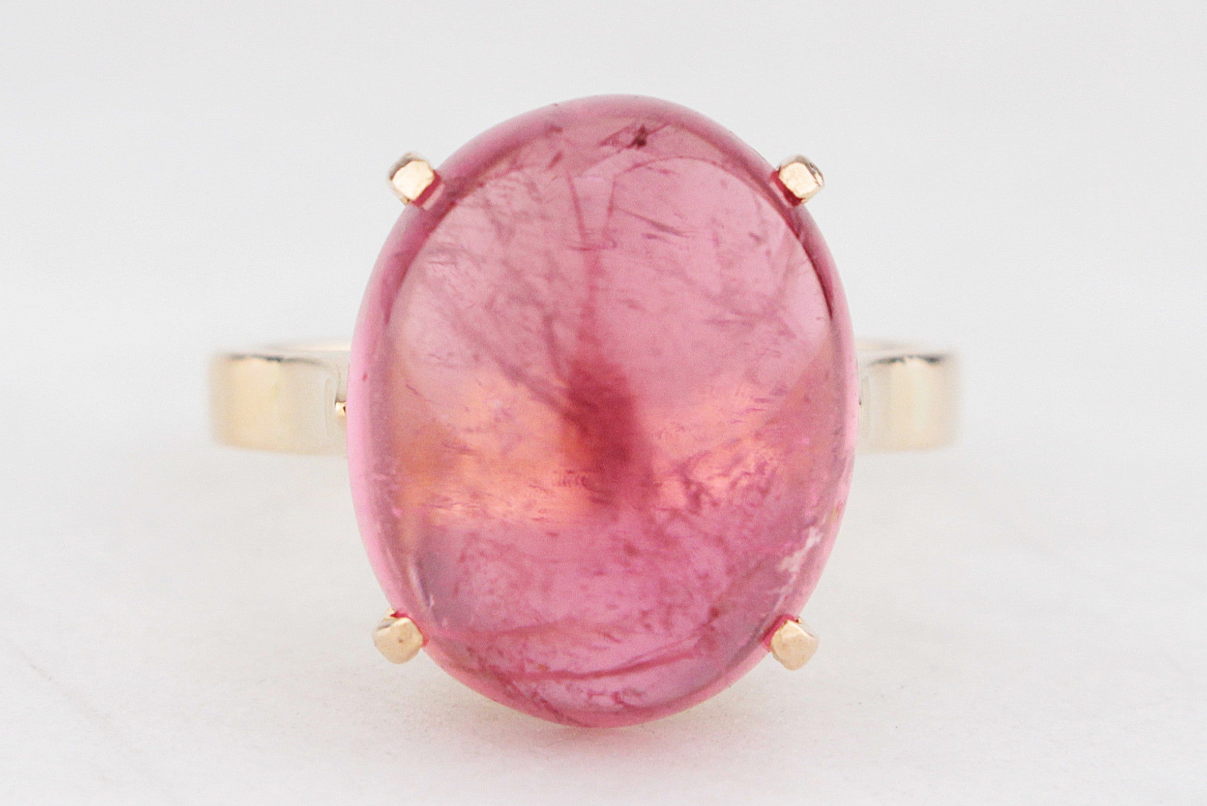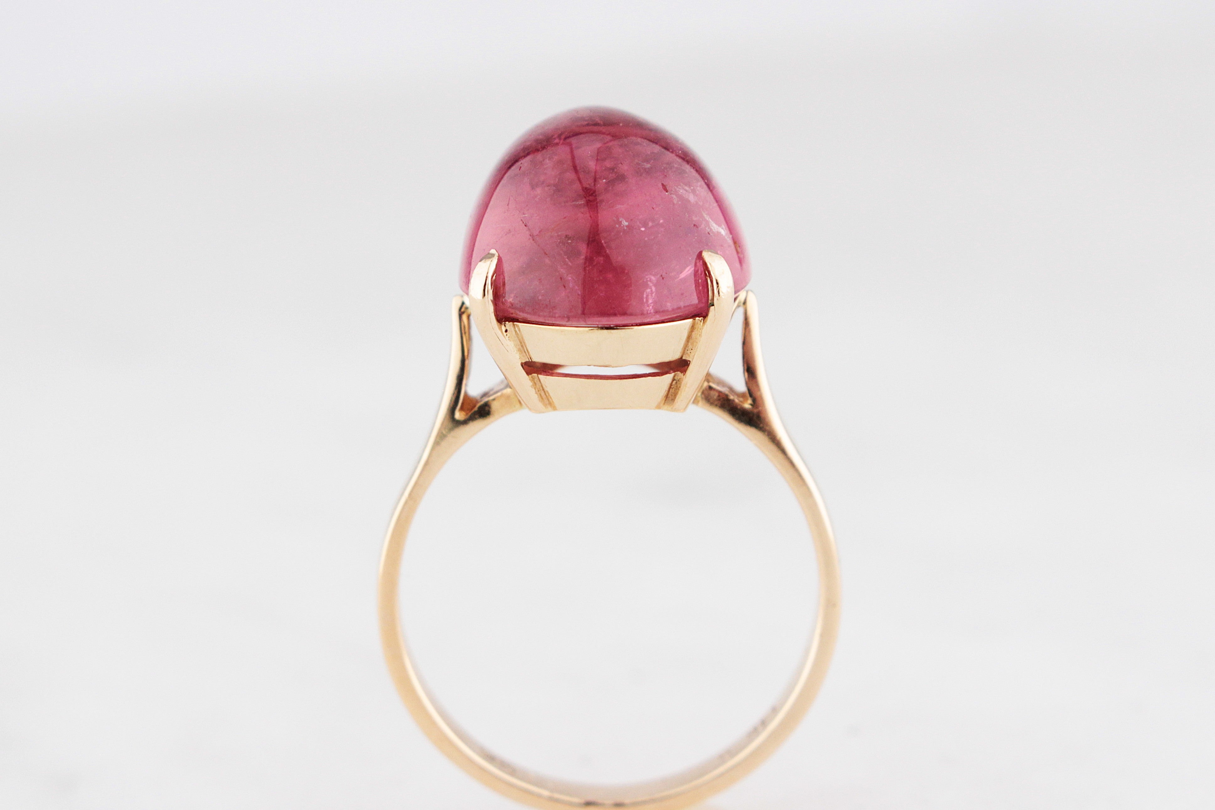 Bold, juicy colour meets effortless vintage charm in this gorgeous cabochon Tourmaline ring. The star of the show is a luminous pink 12ct Tourmaline, smoothly polished into an oval cabochon that glows from within with rich berry tones and natural crystal inclusions that give it wonderful depth and character, the kind of stone that catches the light beautifully, shifting from soft rose to vibrant raspberry with every movement.