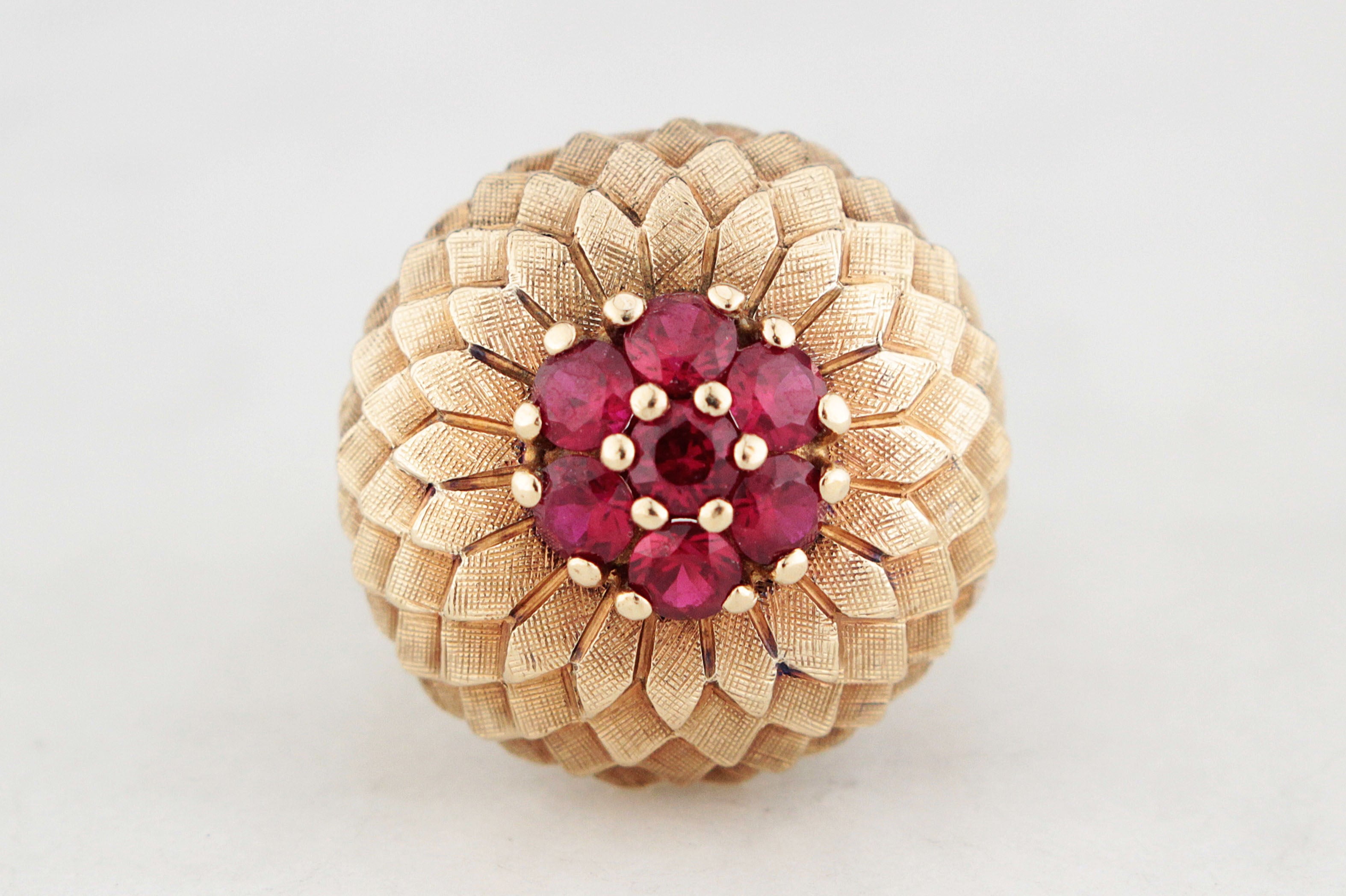 Handcrafted in solid 14ct yellow gold, features a striking floral-inspired dome design with an intricate lattice of engraved petals radiating outwards in layered relief. At the centre of this glamorous bloom lies a vivid cluster of seven round-cut Rubies, glowing with deep magenta-red intensity.