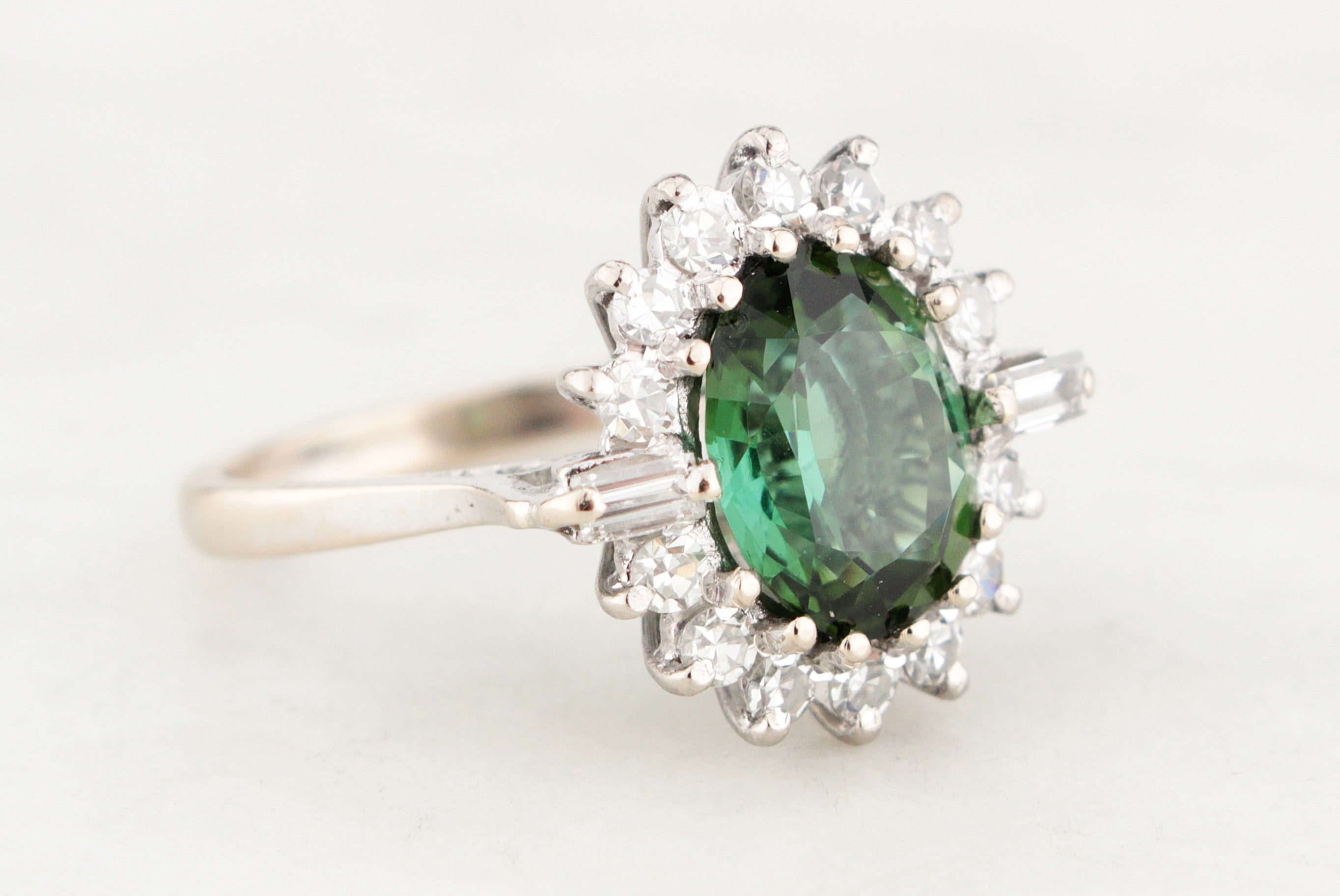 A vivid 2.52ct green Tourmaline sits centre stage in this elegant vintage ring, surrounded by a halo of fourteen Diamonds and flanked by two baguette-cuts, providing the perfect balance.