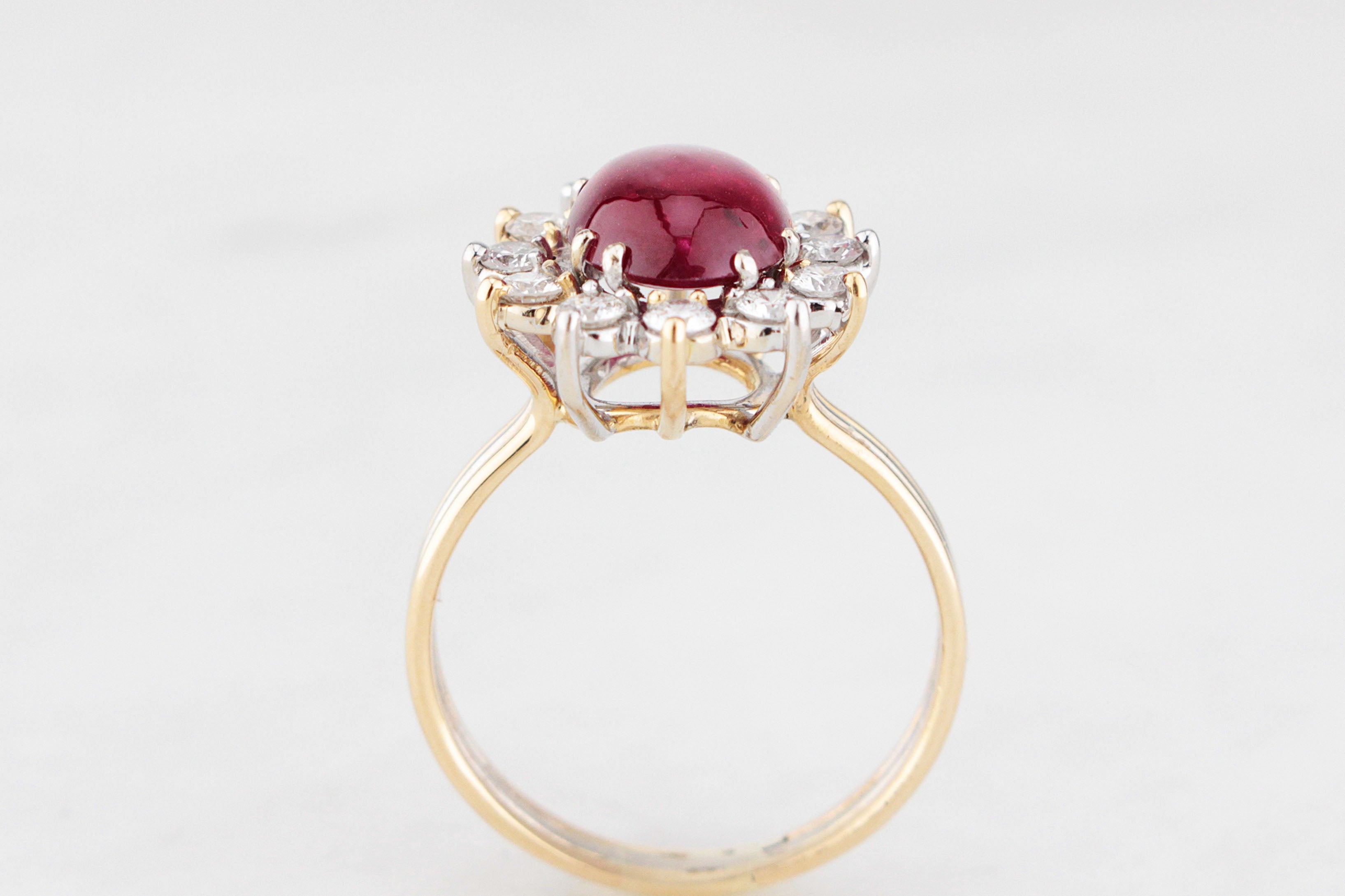 A classically beautiful vintage Burmese Ruby and Diamond cluster ring, this striking piece centres a richly hued 4ct natural pigeon blood Ruby, cut en cabochon to emphasise the depth of colour and soft inner glow. The Ruby is framed by a halo of twelve round brilliant cut Diamonds totalling .54ct, adding radiant brightness and contrast.