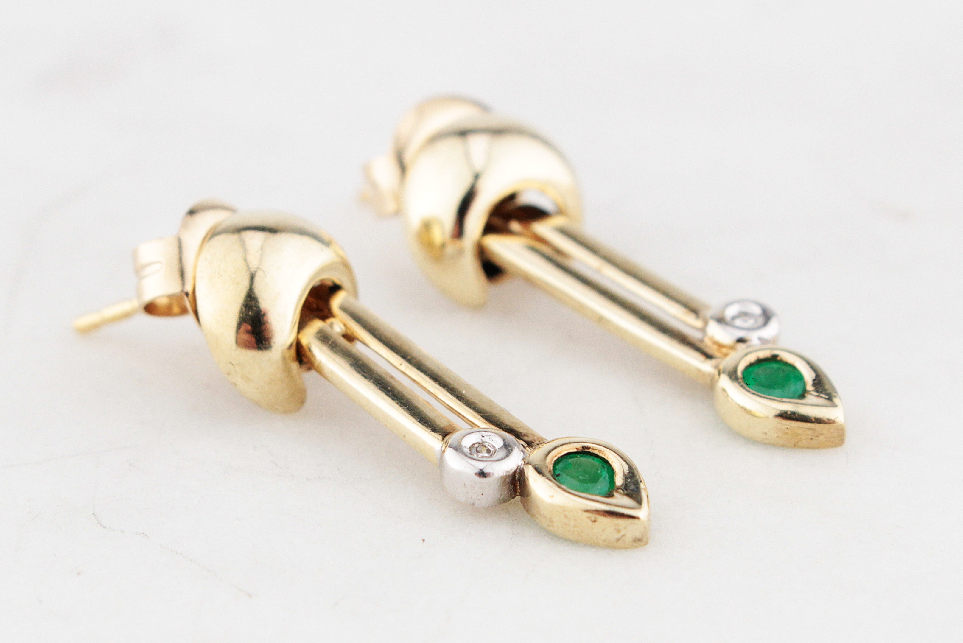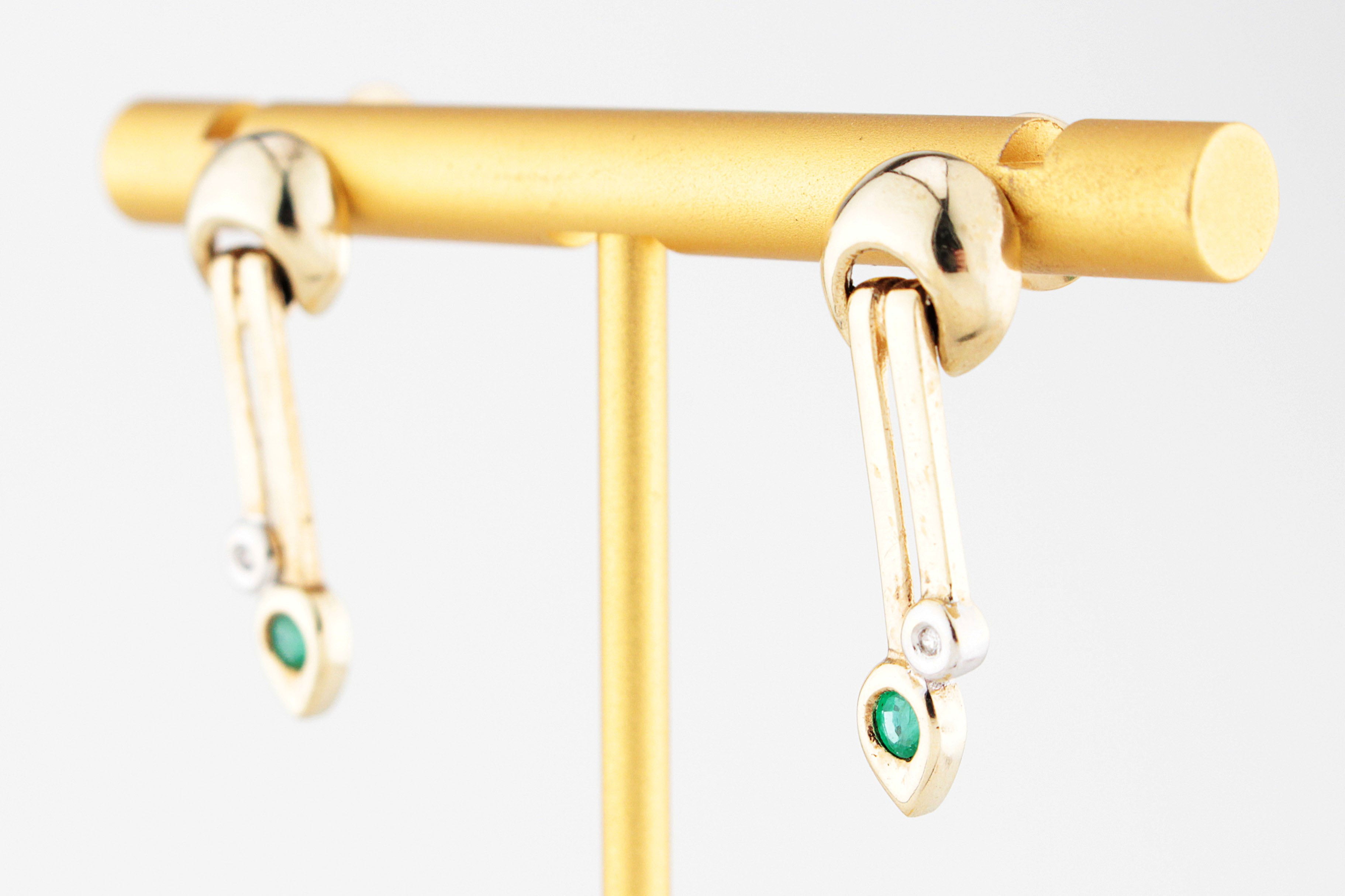 Chic, sculptural, and effortlessly elegant — these vintage Emerald and Diamond earrings are a striking nod to modernist design. Handcrafted in 9ct yellow gold, each earring features a sleek articulated drop that sways gracefully from an articulating semi-circle top, catching the light with every movement. The design is perfectly balanced: clean geometric lines softened by the delicate sparkle of a single Diamond and the vivid green pear-cut Emerald below.