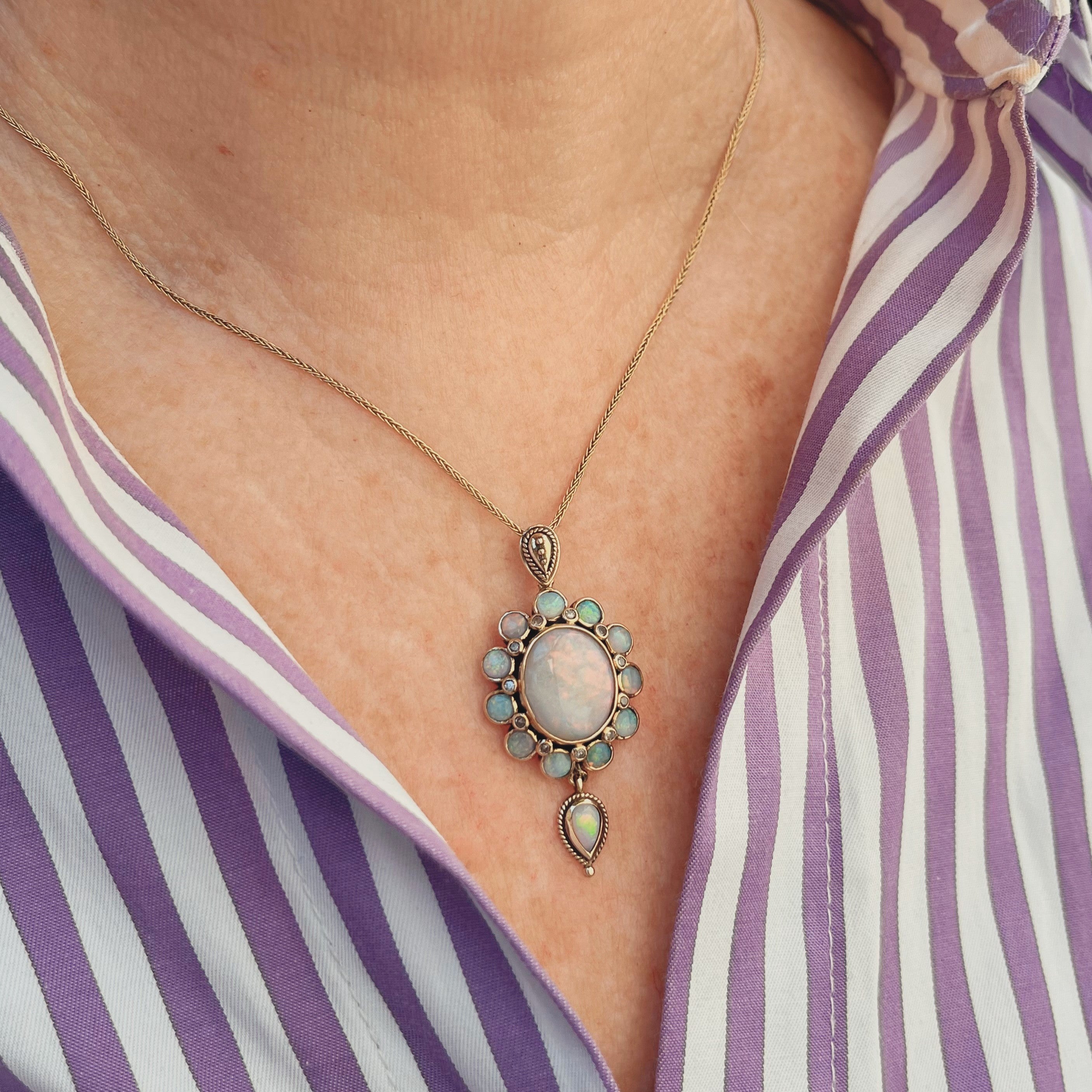 This gorgeous vintage pendant is a vibrant celebration of colour and craftsmanship, suspended from an ornate, articulated bale, to the centre sits a luminous oval solid Opal, alive with fiery flashes of red, orange, and green, beautifully framed by a halo of eleven smaller round Opals that shimmer with rainbow iridescence. Eleven bezel set Sparkling Diamonds are interspersed between the stones, adding a refined brilliance and highlighting the Opals’ natural glow. A pear-shaped Opal drop, set in a detailed gold bezel, completes the design with graceful movement and charm.