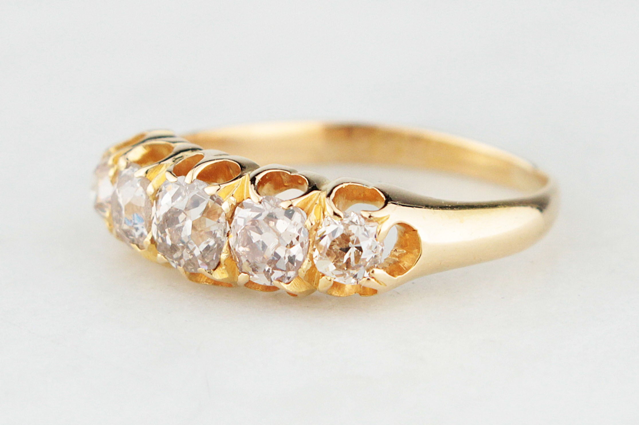A timeless treasure from the Edwardian era c1900, this antique five-stone ring embodies elegance and refined craftsmanship. Handcrafted in rich 18ct yellow gold, five sparkling old mine cut Diamonds (totalling 1.08ct) are proudly showcased in a scalloped claw setting, each stone catching the light with a lively brilliance.