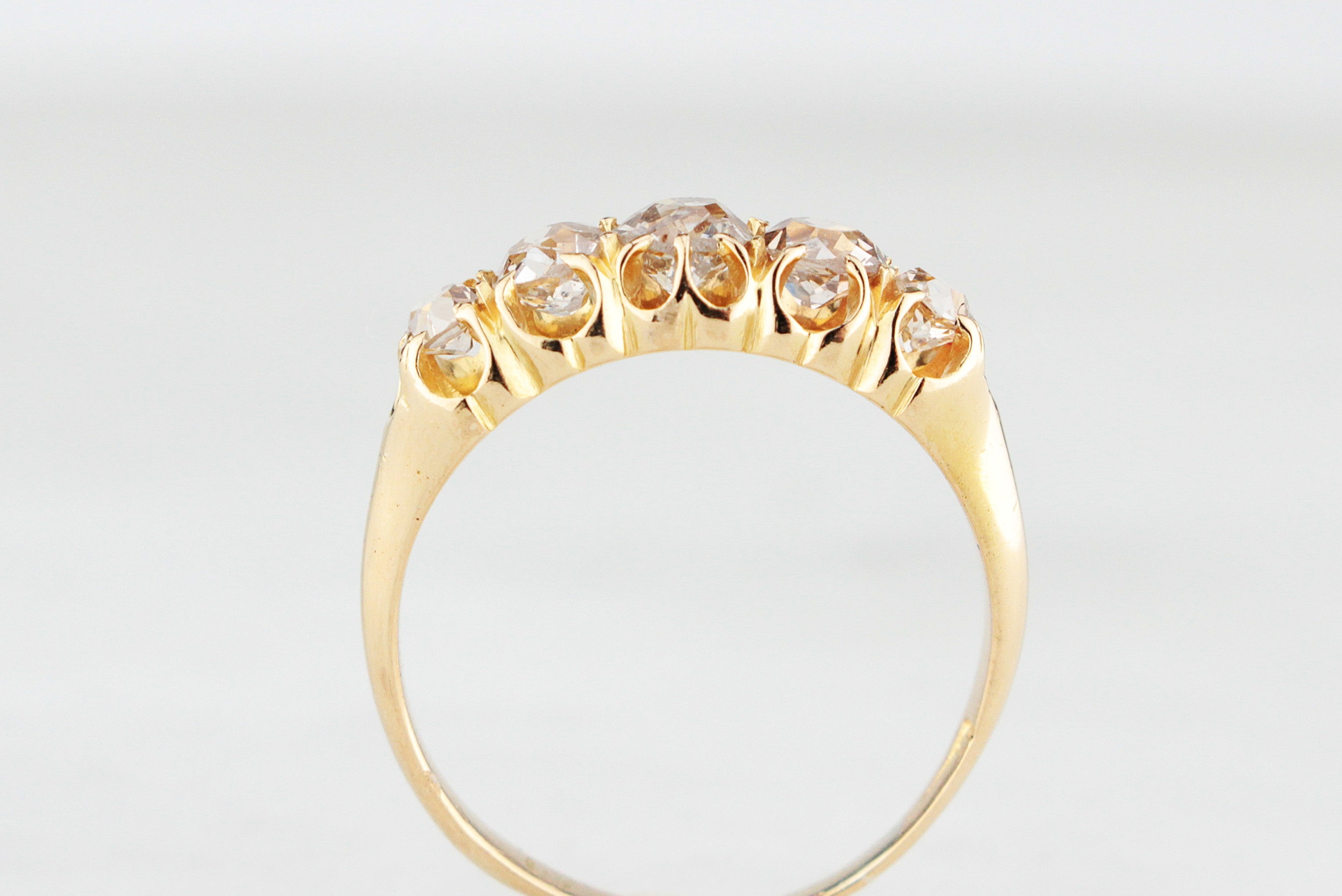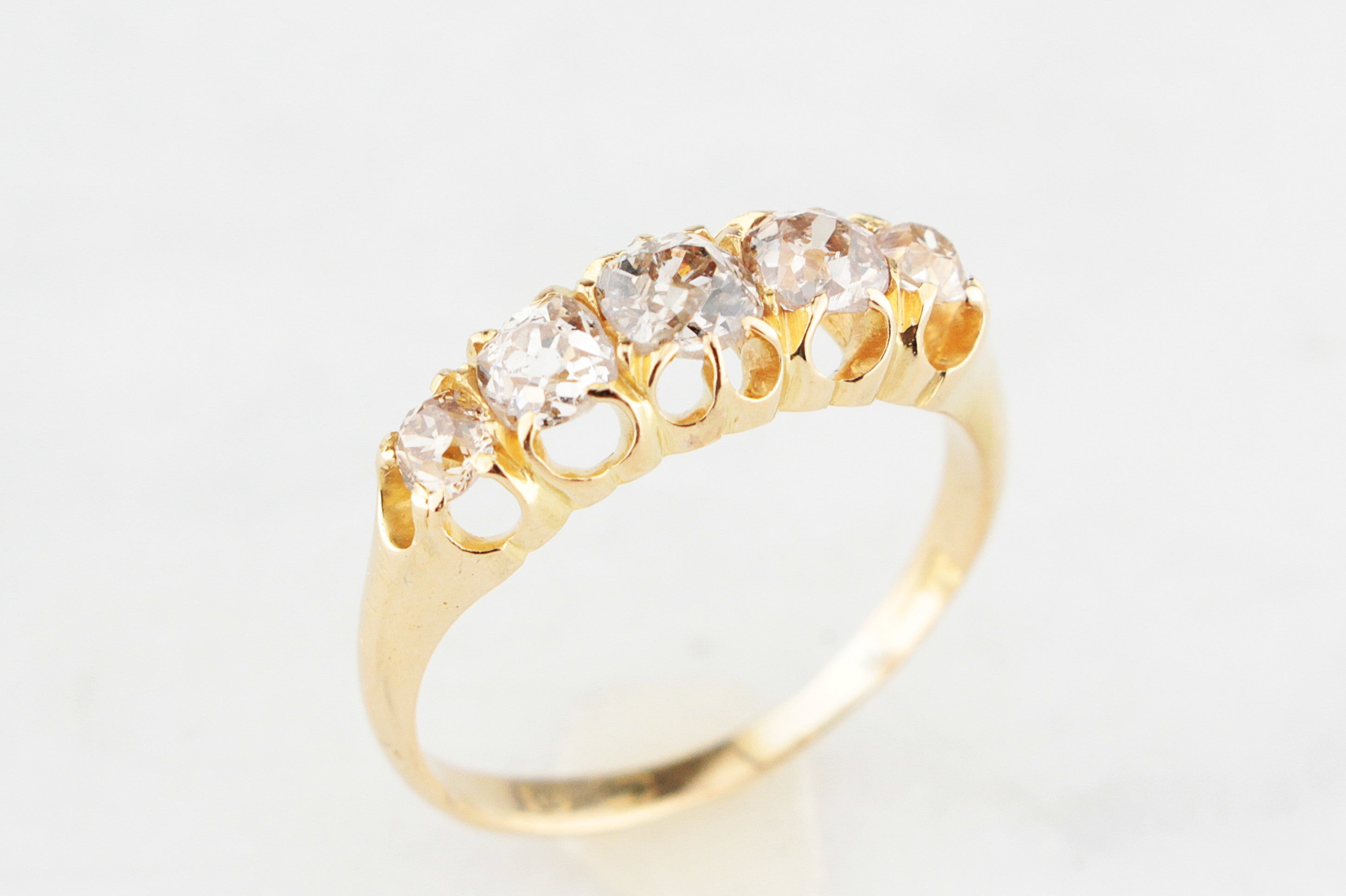 The perfect harmony of five glittering Diamonds, glowing warmly against the antique 18ct gold, makes this ring an elegant choice for both everyday wear and special occasions.