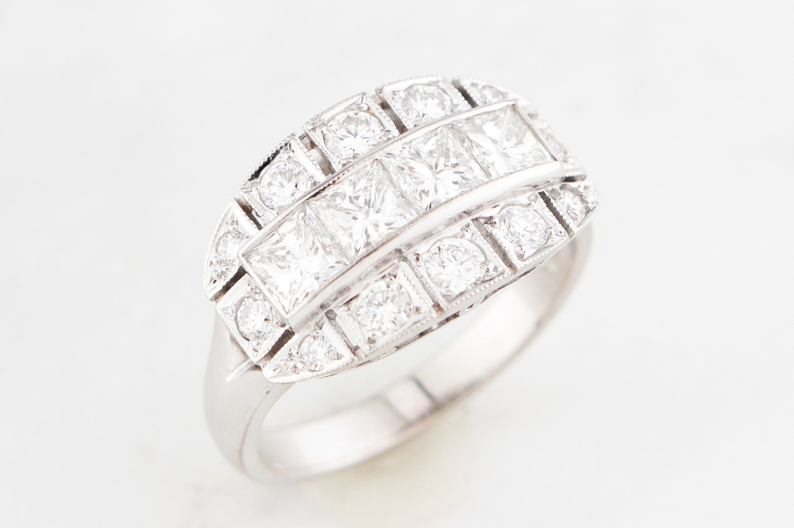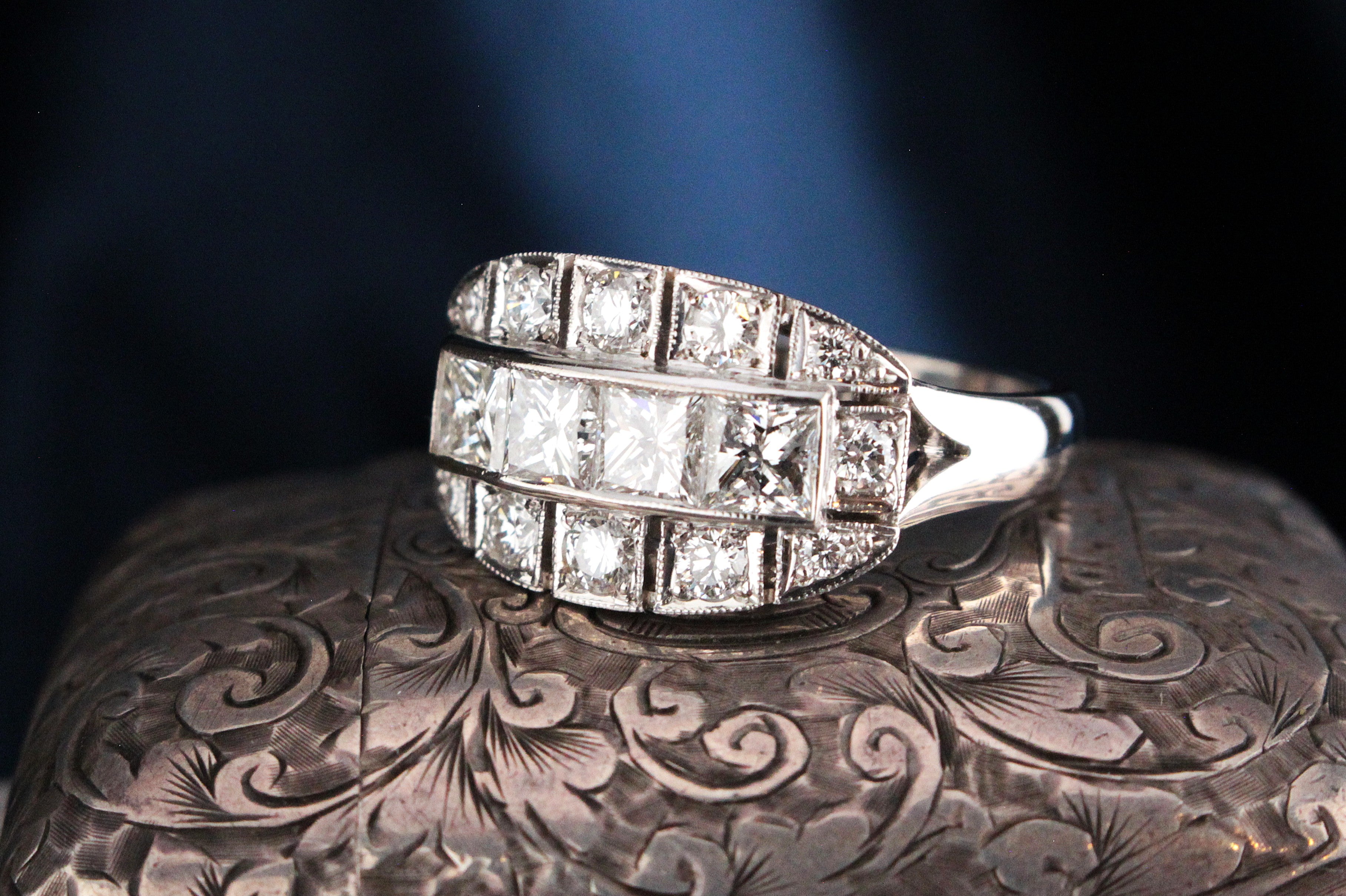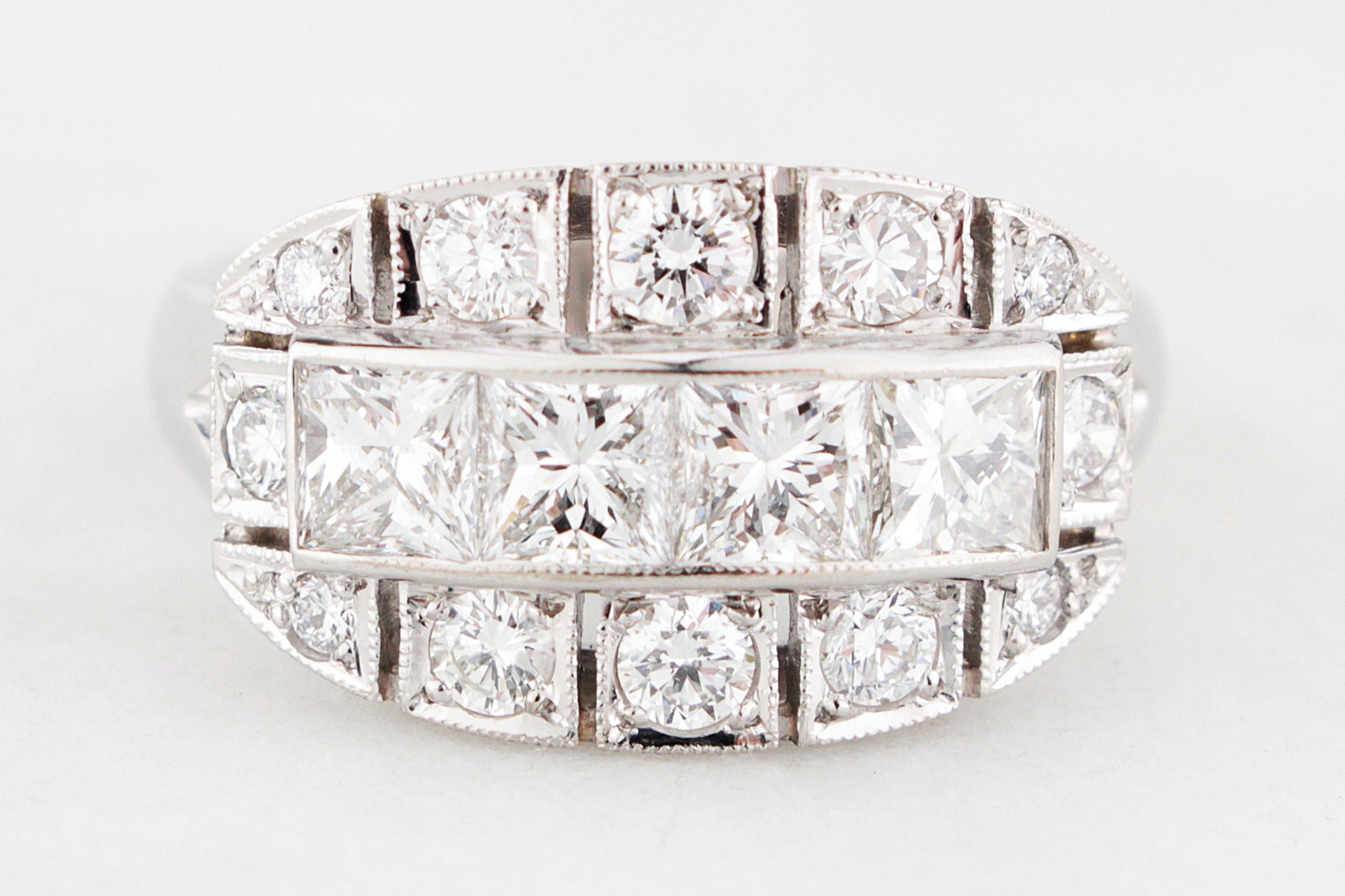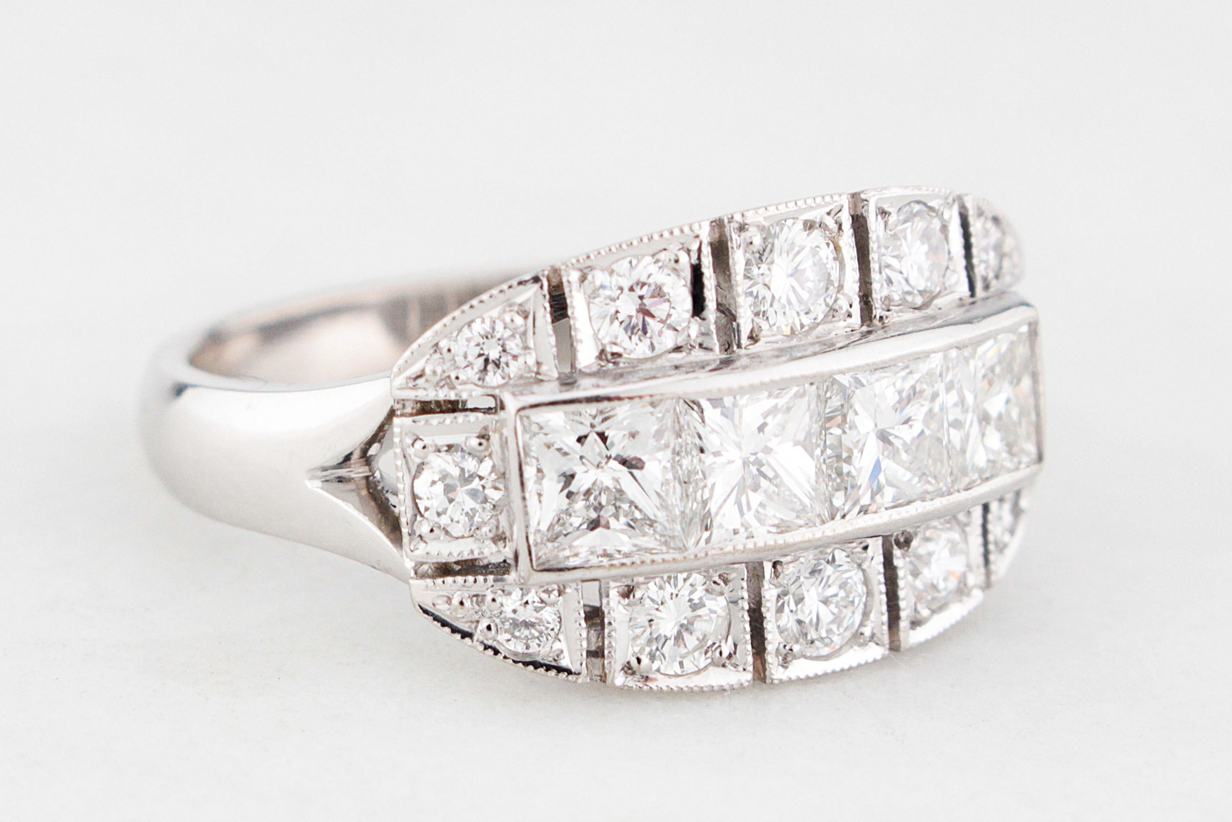 Handcrafted in luxurious 18ct white gold c1930, it showcases an architectural three-row design, a bold yet refined arrangement of four crisp white princess cut Diamonds sits between two sparkling borders of ten early brilliant cut Diamonds, each individually bead set with beautiful millegrain edging, the softly curved silhouette and conforming gallery ensure a flattering presence on the hand, while the craftsmanship exudes timeless glamour and enduring quality.