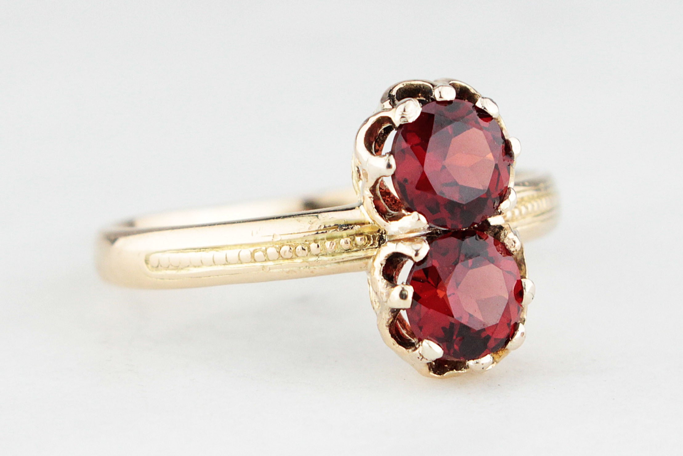A romantic emblem of unity and devotion, this antique ‘toi et moi’ ring captures timeless elegance with a distinctive twist. Set north/south for a sleek, elongating effect on the finger, the design features two richly hued Almandine Garnets — each deep crimson gem symbolising the meeting of two souls.