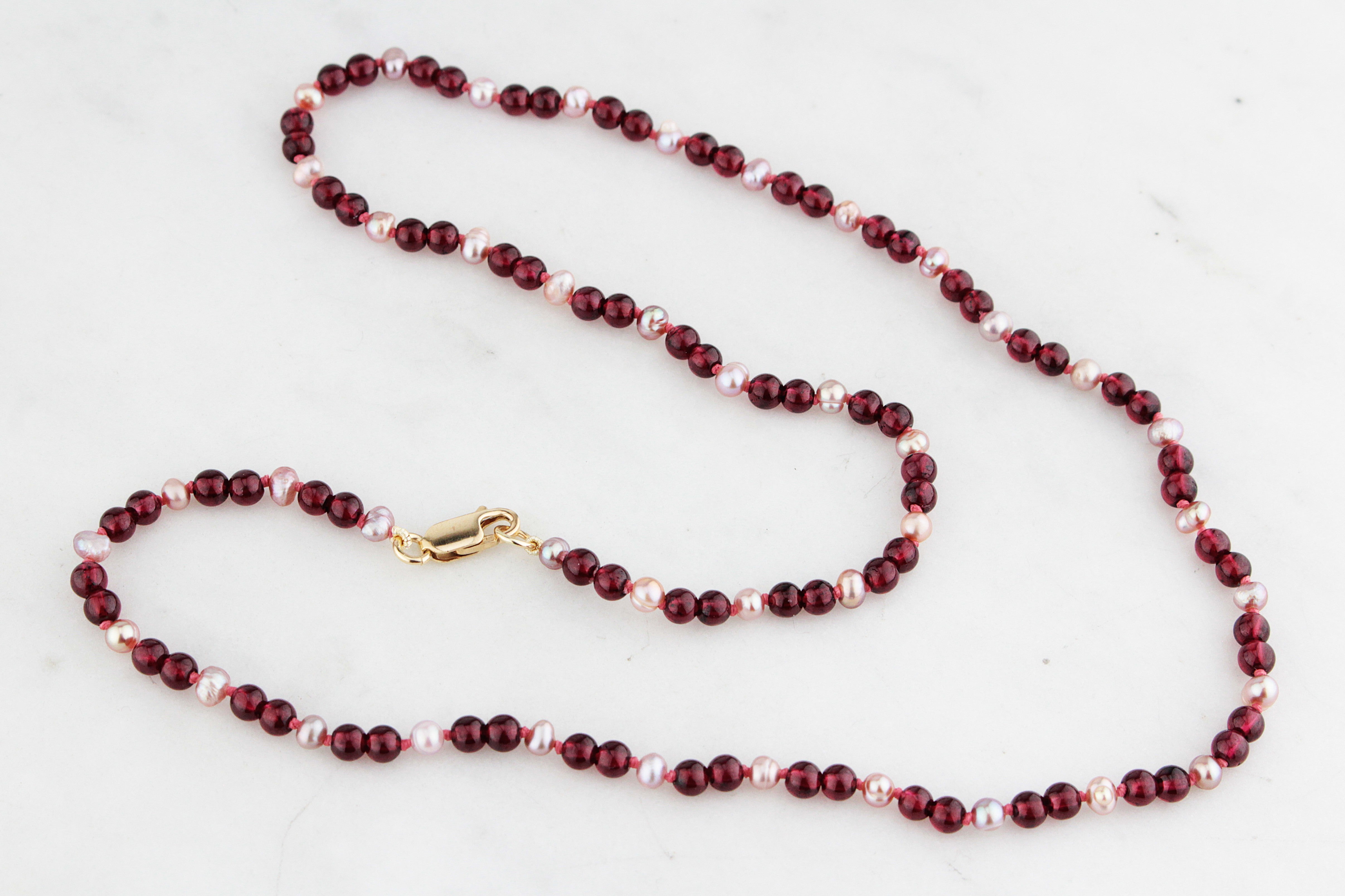 A truly elegant one-of-a-kind piece, this bespoke necklace brings together the rich, wine-red glow of Garnet with the soft blush tones of freshwater pink Pearls. Each bead is individually strung in a rhythmic sequence that celebrates contrast and harmony — the deep lustre of Garnet offset by the gentle iridescence of the Pearls. Finished with a polished 9ct yellow gold lobster clasp.