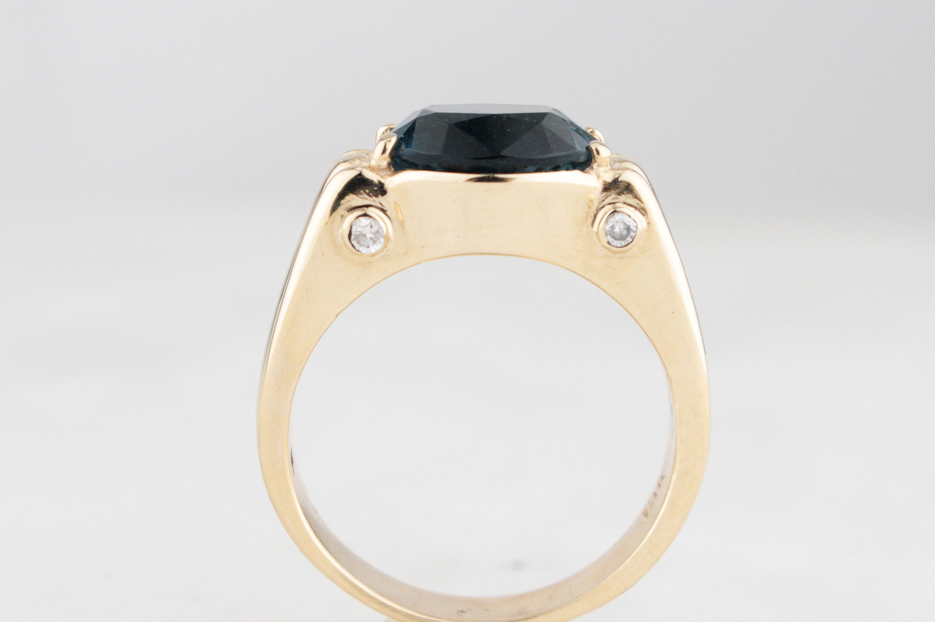 Strong, fluted shoulders rise to meet the stone, punctuated by four flush-set round brilliant cut Diamonds nestled into rivet-style details, a clever industrial nod that adds character without overpowering the design. The result is a beautifully balanced piece where bold structure meets refined gemstone colour, creating a ring that feels both vintage-inspired and distinctly modern.