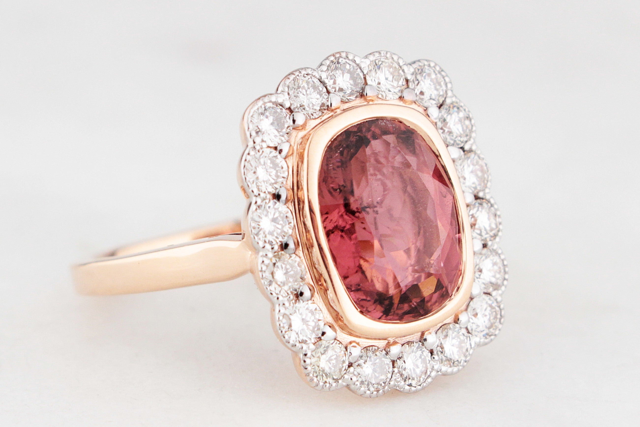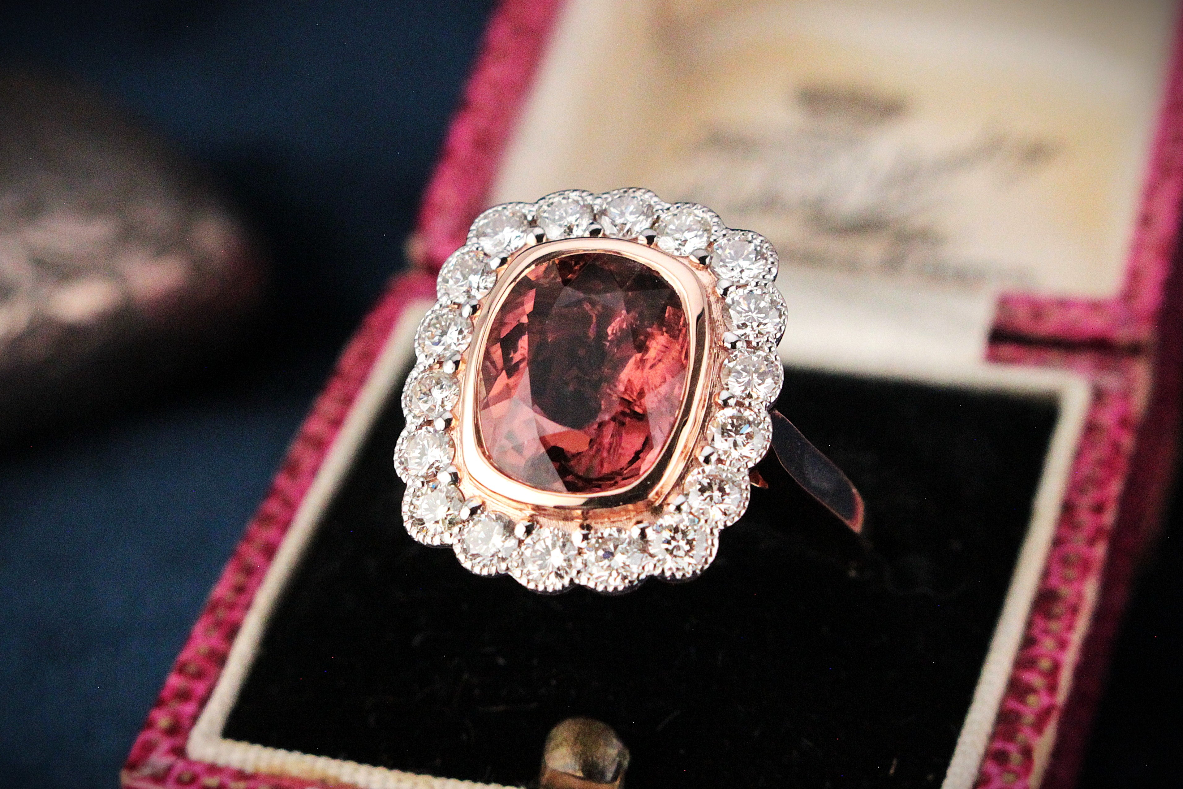 The gorgeous deep pink hues in the Tourmaline wrapped in sparkling Diamonds, elegant, impactful, and undeniably special.
