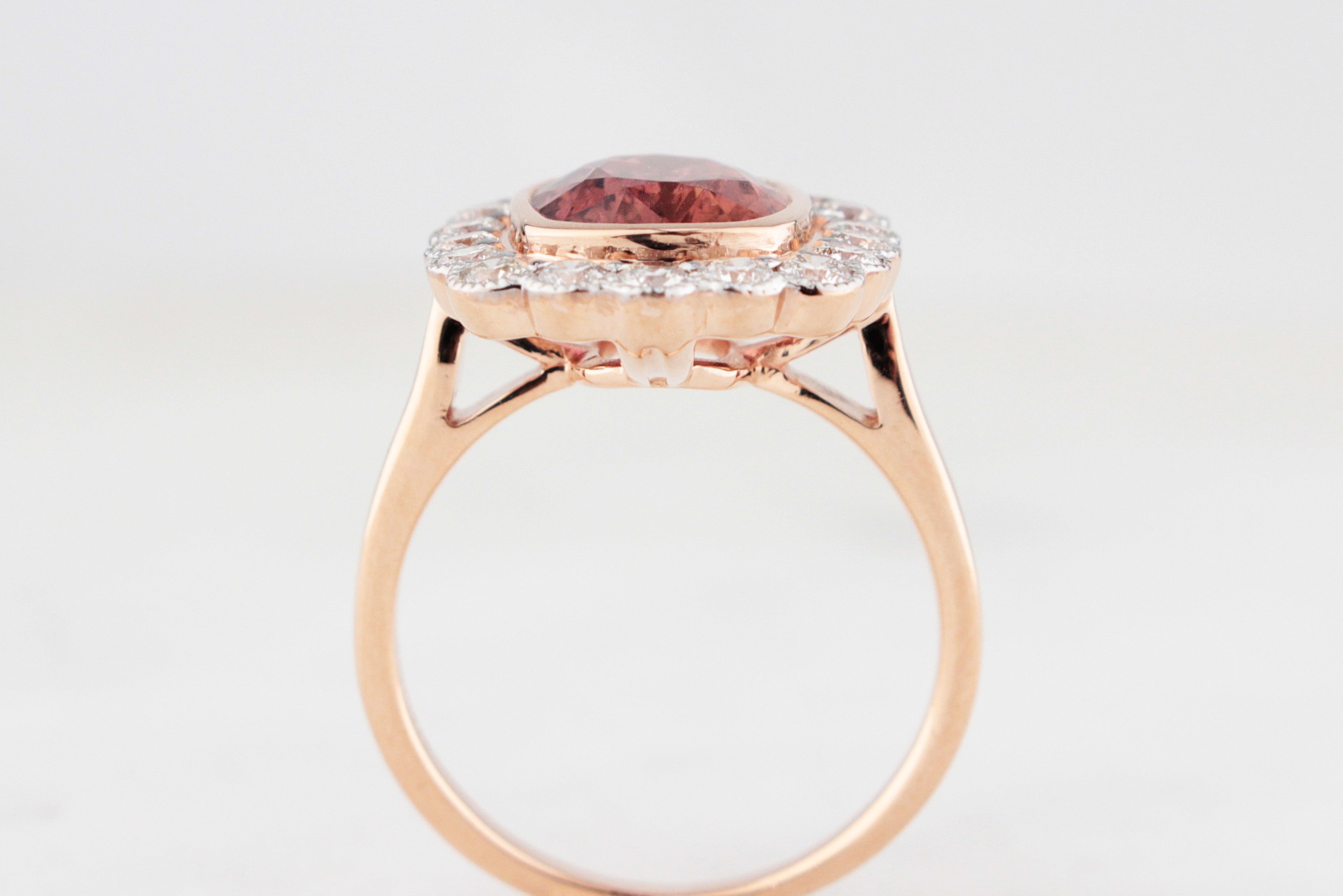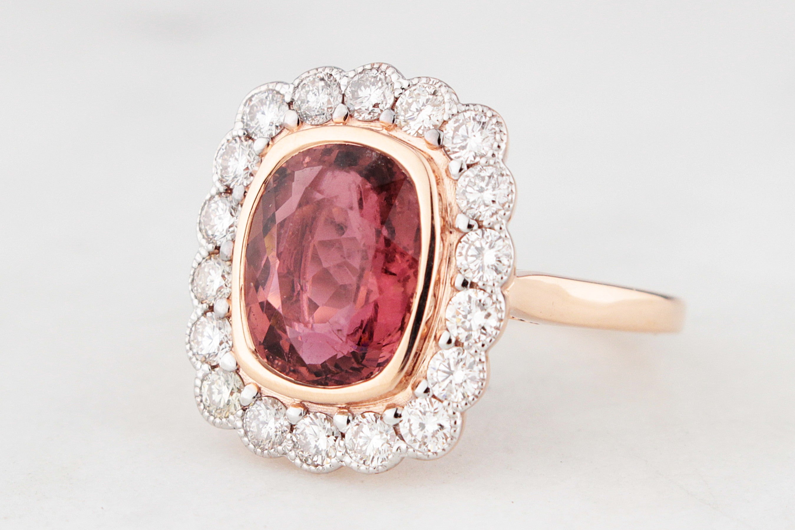 A beautifully elegant modern statement ring, crafted in warm 14ct rose gold and centred on a rich cushion cut 3.51ct deep pink Tourmaline, bezel set to showcase its saturated colour and generous scale. The soft blush of the gold enhances the stone’s natural depth, giving the ring a refined yet confidently contemporary feel.