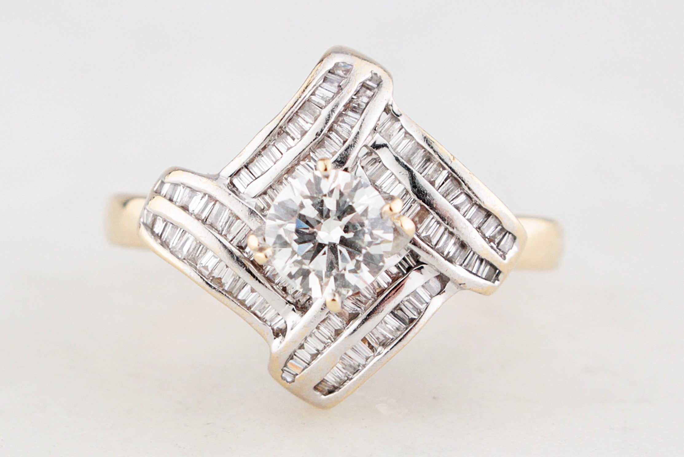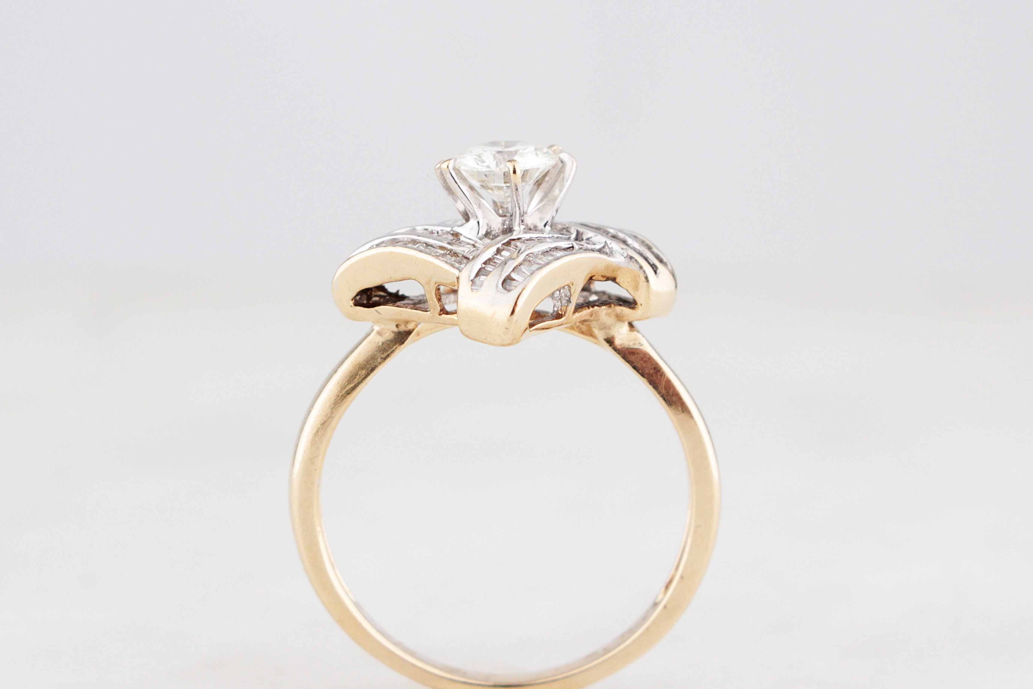 This showstopping vintage Hollywood Glam Diamond ring is pure architectural glamour. Handcrafted c1940/50 in 14ct yellow and white gold, the design centres on a striking .54ct round brilliant cut Diamond, proudly claw set and elevated above an intricate geometric frame. The contrast of warm yellow gold shank against the crisp white gold top gives it that unmistakable vintage presence.