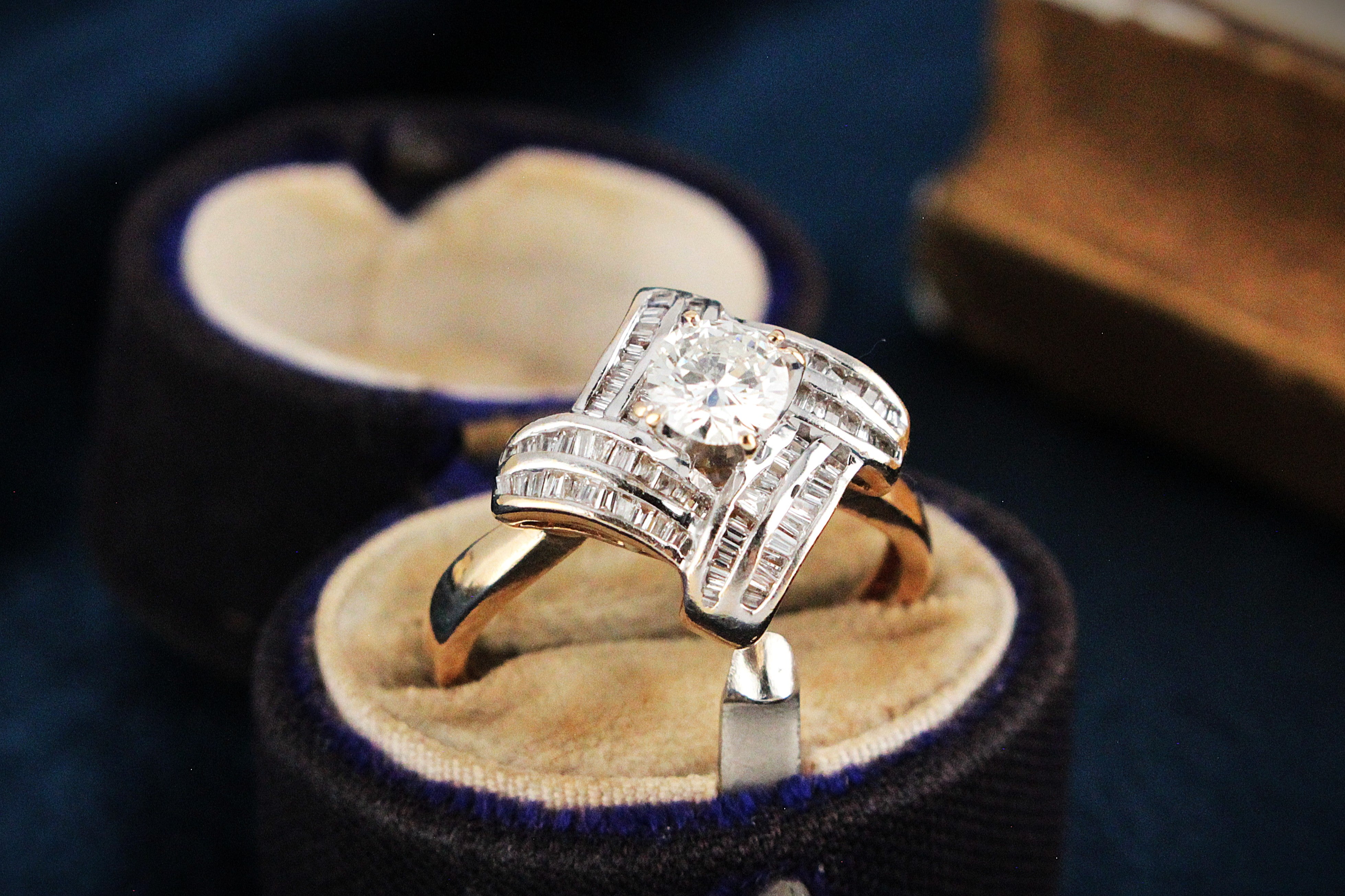 The dramatic double rows of baguette Diamonds framing the magnificent D colour .55ct centre stone, bold, unique vintage glamour with undeniable presence that never goes out of style.