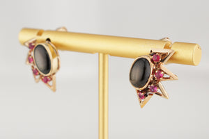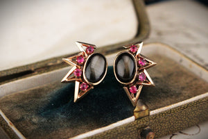 Strikingly elegant, these vintage 1940’s earrings are truly one-of-a-kind, featuring mesmerising oval bezel set star sapphires paired with vibrant rubies which are claw set within half round starburst surrounds.