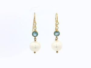 A stunning pair of earrings, each featuring two small pearls suspending a round faceted Topaz with a larger pearl below. Fitted with S hook closures, all beautifully put together on 14ct yellow gold.