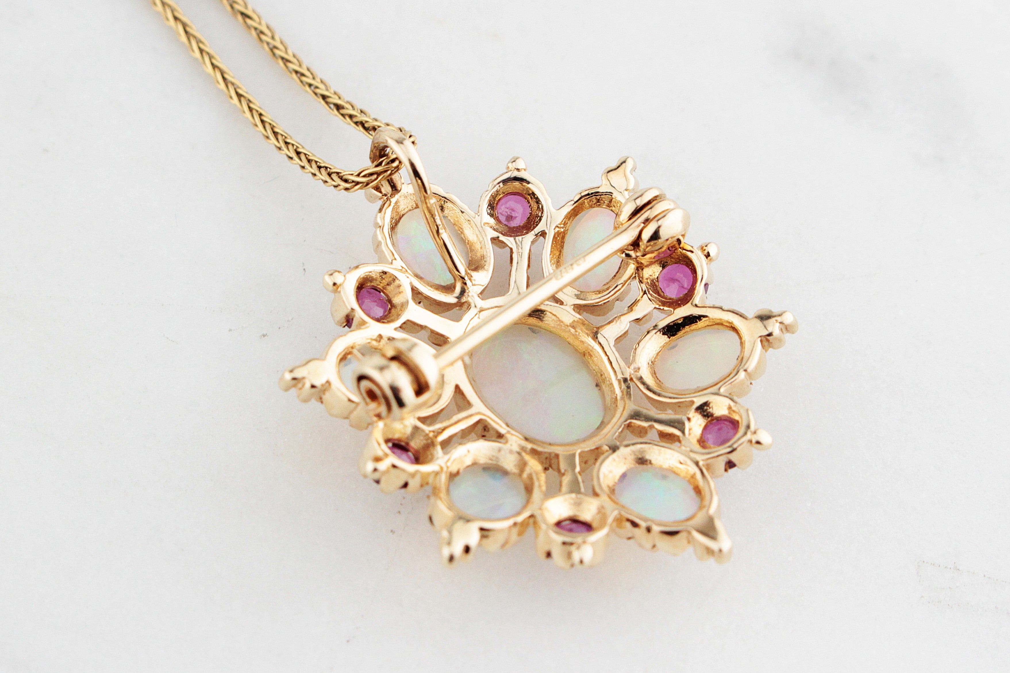The ethereal glow of solid Opals paired with the warmth of gold and the vivid pops of Ruby — an elegant nod to antique luxury. Whether as a pendant or brooch, this piece captures the magic of old-world jewellery craftsmanship at its finest.