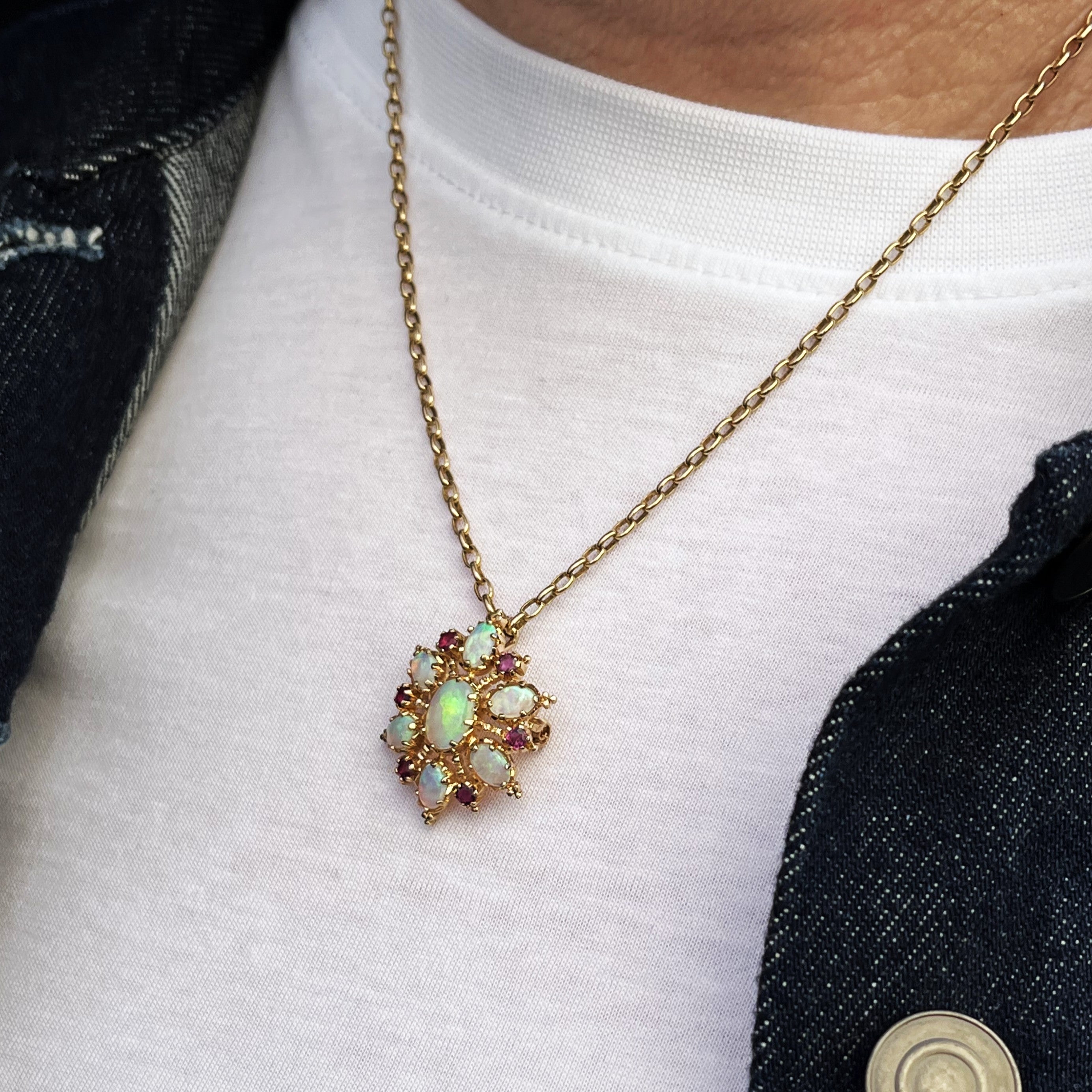 A breathtaking starburst of colour and craftsmanship, this 1940’s piece radiates Edwardian-inspired charm with its luminous play of Opal fire and the regal sparkle of rubies. Handcrafted in rich 9ct yellow gold, each crystal Opal shimmers with flashes of pastel green, blue, and orange — beautifully complemented by the deep pink-red accents of round-cut rubies nestled between the petals.
